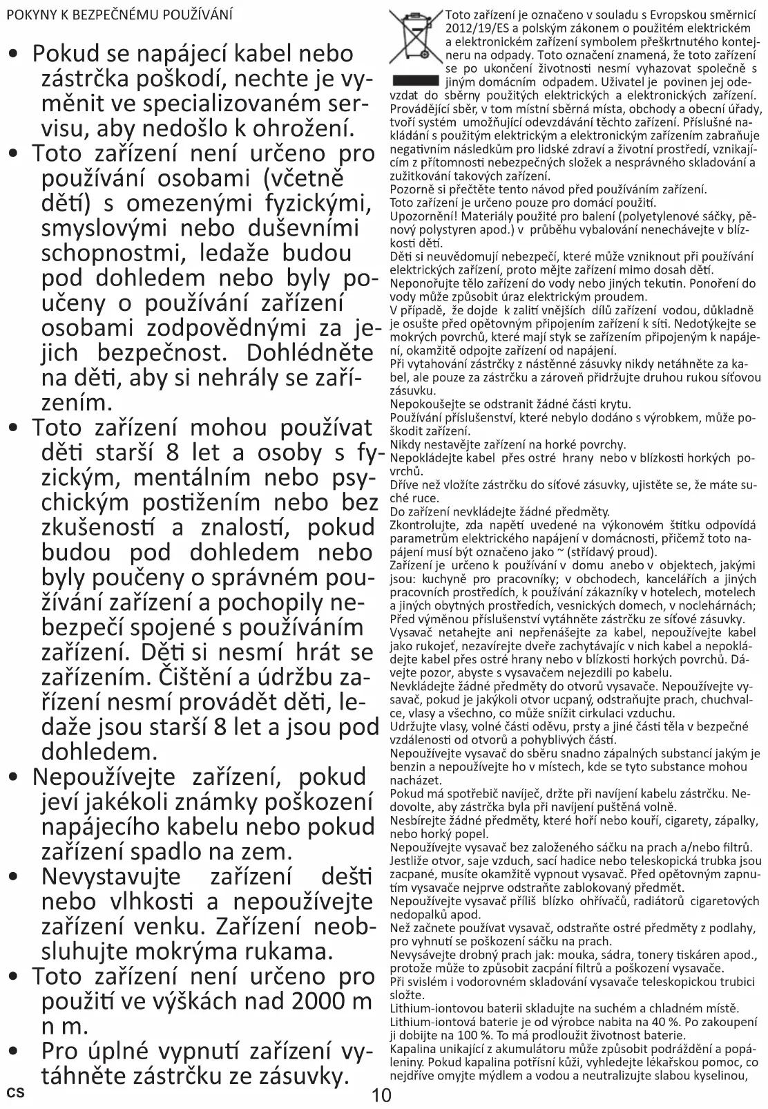 - Pro úplné vypnu zařízení vy- táhněte zástrčku ze zásuvky. Toto zařízení je označeno v souladu s Evropskou směrnicí 2012/19/ES a polským zákonem o použitém elektrickém a elektronickém zařízení symbolem přeškrtnutého kontej- neru na odpady. Toto označení znamená, že toto zařízení se po ukončení životnos nesmí vyhazovat společně s jiným domácním odpadem. Uživatel je povinen jej ode- vzdat do sběrny použitých elektrických a elektronických zařízení. Provádějící sběr, v tom místní sběrná místa, obchody a obecní úřady, tvoří systém umožňující odevzdávání těchto zařízení. Příslušné na- kládání s použitým elektrickým a elektronickým zařízením zabraňuje negavním následkům pro lidské zdraví a životní prostředí, vznikají- cím z přítomnos nebezpečných složek a nesprávného skladování a zužitkování takových zařízení. Pozorně si přečtěte tento návod před používáním zařízení. Toto zařízení je určeno pouze pro domácí použi. Upozornění! Materiály použité pro balení (polyetylenové sáčky, pě- nový polystyren apod.) v průběhu vybalování nenechávejte v blíz- kos dě. Dě si neuvědomují nebezpečí, které může vzniknout při používání elektrických zařízení, proto mějte zařízení mimo dosah dě. Neponořujte tělo zařízení do vody nebo jiných tekun. Ponoření do vody může způsobit úraz elektrickým proudem. V případě, že dojde k zali vnějších dílů zařízení vodou, důkladně je osušte před opětovným připojením zařízení k sí. Nedotýkejte se mokrých povrchů, které mají styk se zařízením připojeným k napáje- ní, okamžitě odpojte zařízení od napájení. Při vytahování zástrčky z nástěnné zásuvky nikdy netáhněte za ka- bel, ale pouze za zástrčku a zároveň přidržujte druhou rukou síťovou zásuvku. Nepokoušejte se odstranit žádné čás krytu. Používání příslušenství, které nebylo dodáno s výrobkem, může po- škodit zařízení. Nikdy nestavějte zařízení na horké povrchy. Nepokládejte kabel přes ostré hrany nebo v blízkos horkých po- vrchů. Dříve než vložíte zástrčku do síťové zásuvky, ujistěte se, že máte su- ché ruce. Do zařízení nevkládejte žádné předměty. Zkontrolujte, zda napě uvedené na výkonovém štku odpovídá parametrům elektrického napájení v domácnos, přičemž toto na- pájení musí být označeno jako ~ (střídavý proud). Zařízení je určeno k používání v domu anebo v objektech, jakými jsou: kuchyně pro pracovníky; v obchodech, kancelářích a jiných pracovních prostředích, k používání zákazníky v hotelech, motelech a jiných obytných prostředích, vesnických domech, v noclehárnách; Před výměnou příslušenství vytáhněte zástrčku ze síťové zásuvky. Vysavač netahejte ani nepřenášejte za kabel, nepoužívejte kabel jako rukojeť, nezavírejte dveře zachytávajíc v nich kabel a nepoklá- dejte kabel přes ostré hrany nebo v blízkos horkých povrchů. Dá- vejte pozor, abyste s vysavačem nejezdili po kabelu. Nevkládejte žádné předměty do otvorů vysavače. Nepoužívejte vy- savač, pokud je jakýkoli otvor ucpaný, odstraňujte prach, chuchval- ce, vlasy a všechno, co může snížit cirkulaci vzduchu. Udržujte vlasy, volné čás oděvu, prsty a jiné čás těla v bezpečné vzdálenos od otvorů a pohyblivých čás. Nepoužívejte vysavač do sběru snadno zápalných substancí jakým je benzin a nepoužívejte ho v místech, kde se tyto substance mohou nacházet. Pokud má spotřebič navíječ, držte při navíjení kabelu zástrčku. Ne- dovolte, aby zástrčka byla při navíjení puštěná volně. Nesbírejte žádné předměty, které hoří nebo kouří, cigarety, zápalky, nebo horký popel. Nepoužívejte vysavač bez založeného sáčku na prach a/nebo ltrů. Jestliže otvor, saje vzduch, sací hadice nebo teleskopická trubka jsou zacpané, musíte okamžitě vypnout vysavač. Před opětovným zapnu- m vysavače nejprve odstraňte zablokovaný předmět. Nepoužívejte vysavač příliš blízko ohřívačů, radiátorů cigaretových nedopalků apod. Než začnete používat vysavač, odstraňte ostré předměty z podlahy, pro vyhnu se poškození sáčku na prach. Nevysávejte drobný prach jak: mouka, sádra, tonery skáren apod., protože může to způsobit zacpání ltrů a poškození vysavače. Při svislém i vodorovném skladování vysavače teleskopickou trubici složte. Lithiumiontovou baterii skladujte na suchém a chladném místě. Lithiumiontová baterie je od výrobce nabita na 40 %. Po zakoupení ji dobijte na 100 %. To má prodloužit životnost baterie. Kapalina unikající z akumulátoru může způsobit podráždění a popá- leniny. Pokud kapalina potřísní kůži, vyhledejte lékařskou pomoc, co nejdříve omyjte mýdlem a vodou a neutralizujte slabou kyselinou,11
