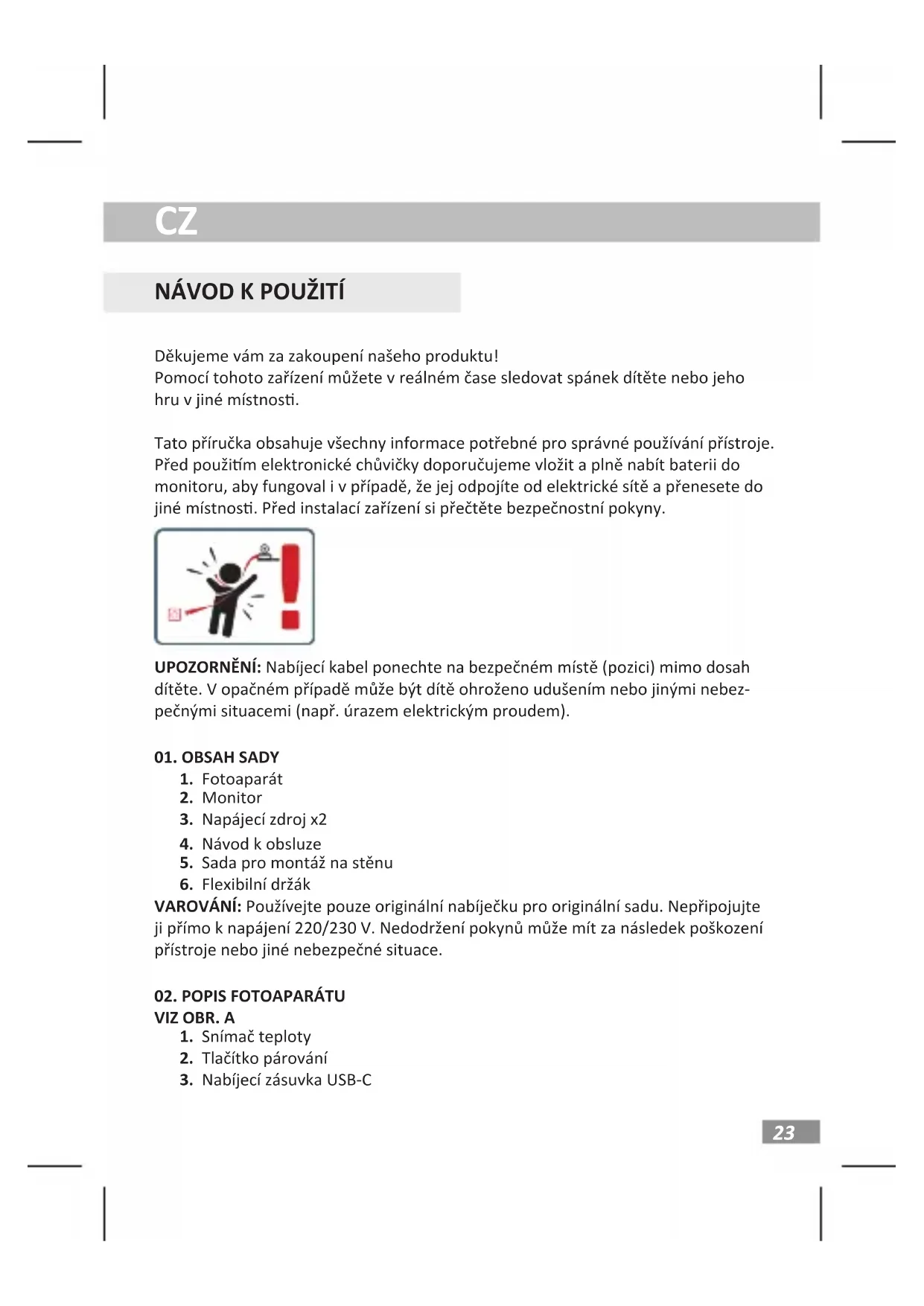 Děkujeme vám za zakoupení našeho produktu! Pomocí tohoto zařízení můžete v reálném čase sledovat spánek dítěte nebo jeho hru v jiné místnos. Tato příručka obsahuje všechny informace potřebné pro správné používání přístroje. Před použim elektronické chůvičky doporučujeme vložit a plně nabít baterii do monitoru, aby fungoval i v případě, že jej odpojíte od elektrické sítě a přenesete do jiné místnos. Před instalací zařízení si přečtěte bezpečnostní pokyny. UPOZORNĚNÍ: Nabíjecí kabel ponechte na bezpečném místě (pozici) mimo dosah dítěte. V opačném případě může být dítě ohroženo udušením nebo jinými nebez- pečnými situacemi (např. úrazem elektrickým proudem).
