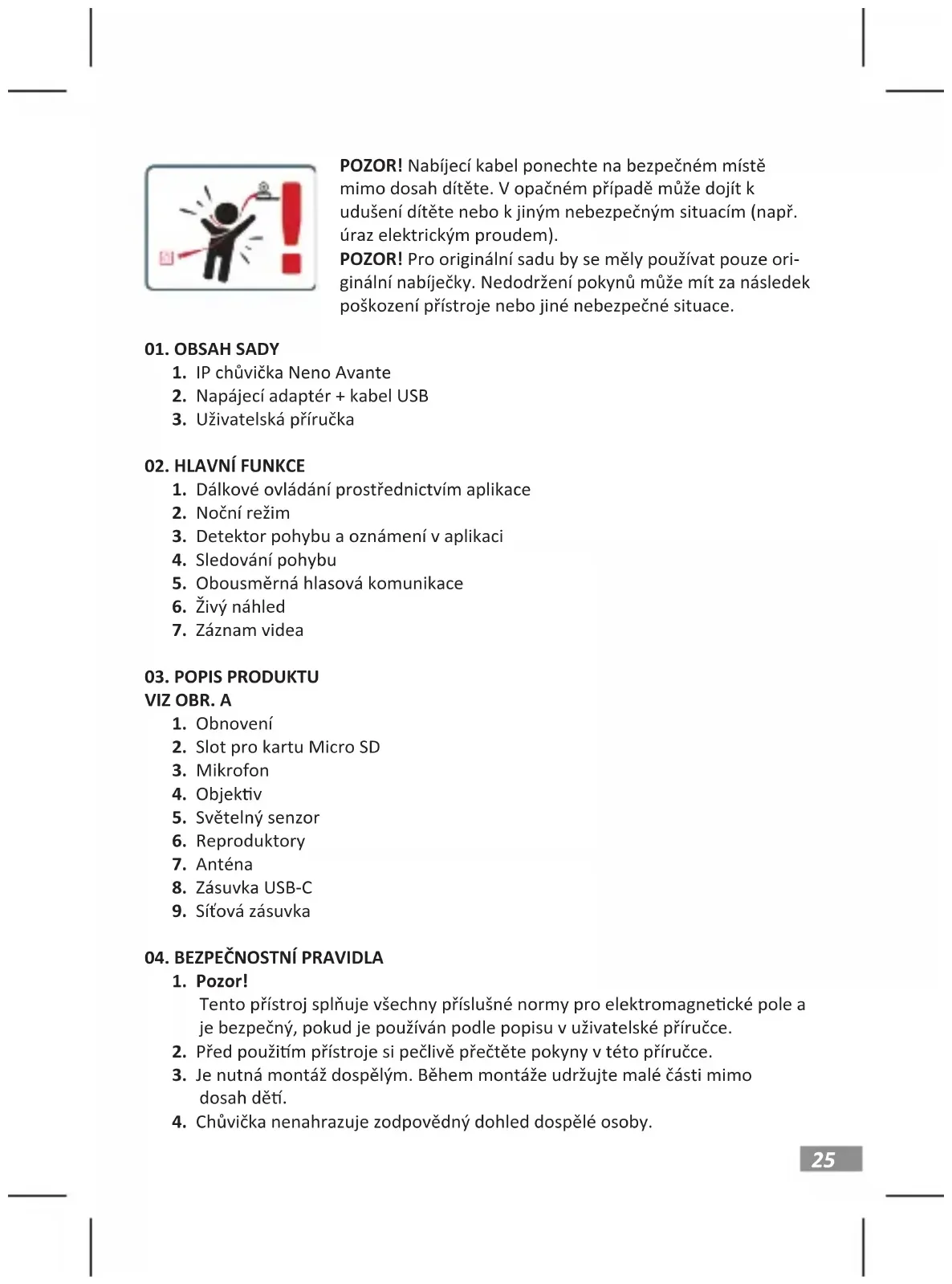 Děkujeme vám za zakoupení našeho produktu! Pomocí tohoto zařízení můžete pomocí aplikace v telefonu průběžně sledovat spánek nebo hru dítěte v jiné místnos! Tento návod obsahuje všechny informace potřebné pro správné používání. Před použim zařízení si přečtěte návod k obsluze.25 POZOR! Nabíjecí kabel ponechte na bezpečném místě mimo dosah dítěte. V opačném případě může dojít k udušení dítěte nebo k jiným nebezpečným situacím (např. úraz elektrickým proudem). POZOR! Pro originální sadu by se měly používat pouze ori- ginální nabíječky. Nedodržení pokynů může mít za následek poškození přístroje nebo jiné nebezpečné situace.