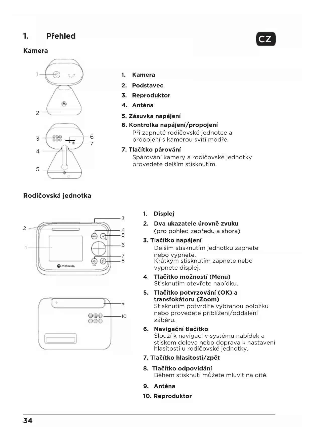 Dětská jednotka s kamerou se zapne a rozsvítí se modře kontrolka napájení. UPOZORNĚNÍ Nebezpečí uškrcení. Došlo již k UŠKRCENÍ dětí kabelem. Dbejte na udržování odstupu dětí od kabelu (více než 1 metr). Neodstraňujte štítky ze síťových adaptérů. Používejte pouze síťové adaptéry dodané s kamerou. Rodičovská jednotka V rodičovské jednotce je již vložena dobíjecí baterie. Při úplném nabití je možné rodičovskou jednotku přesouvat, aniž by došlo ke ztrátě spojení s kamerou. První nabíjení baterie by mělo trvat nepřetržitě alespoň 16 hodin.