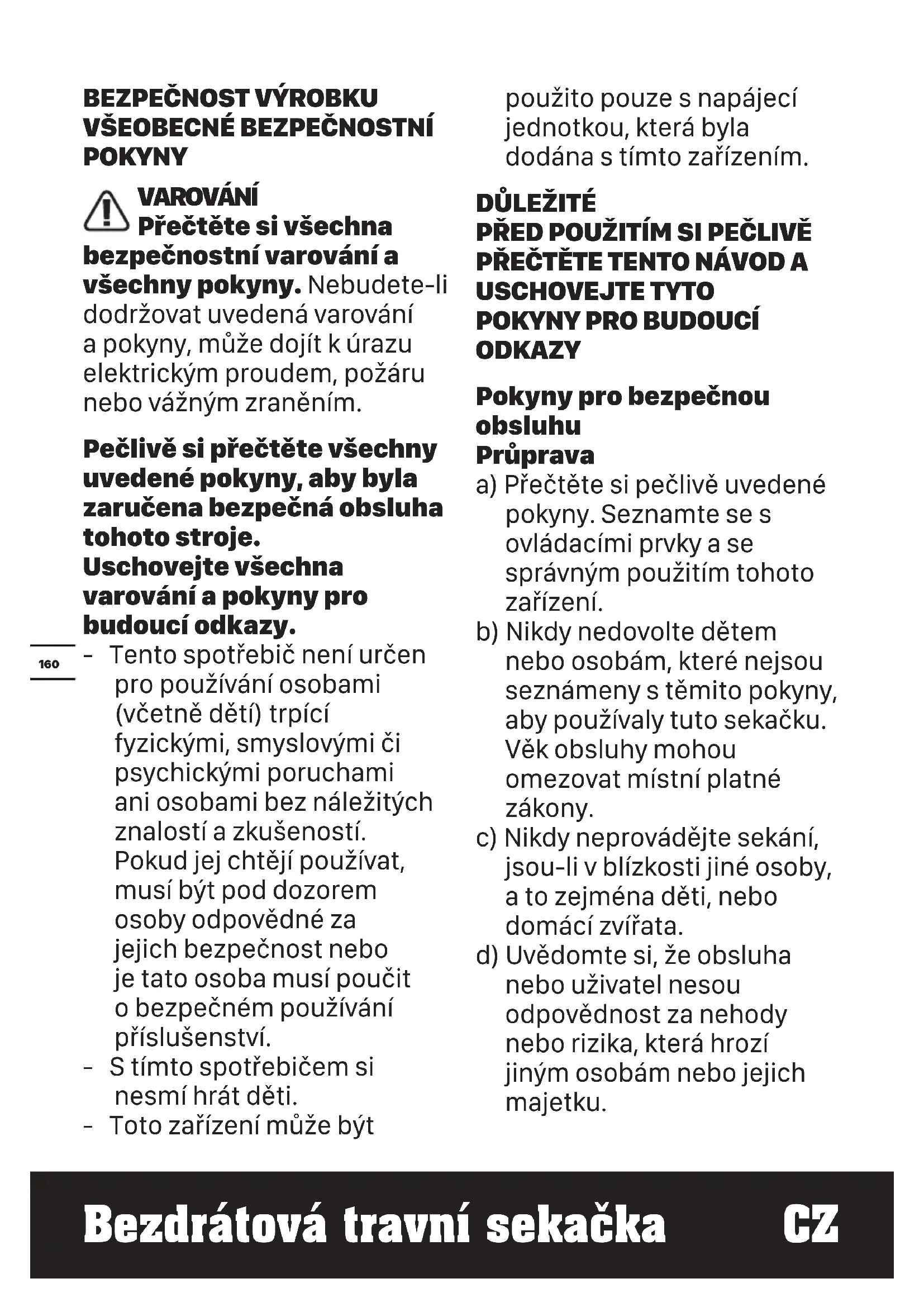 ODKAZY Pokyny pro bezpečnou obsluhu Průprava a) Přečtěte si pečlivě uvedené pokyny. Seznamte se s ovládacími prvky a se správným použitím tohoto zařízení. b) Nikdy nedovolte dětem nebo osobám, které nejsou seznámeny s těmito pokyny, aby používaly tuto sekačku. Věk obsluhy mohou omezovat místní platné zákony. c) Nikdy neprovádějte sekání, jsou-li v blízkosti jiné osoby, a to zejména děti, nebo domácí zvířata. d) Uvědomte si, že obsluha nebo uživatel nesou odpovědnost za nehody nebo rizika, která hrozí jiným osobám nebo jejich majetku.161 %H]GUiWRYiWUDYQtVHNDĀND