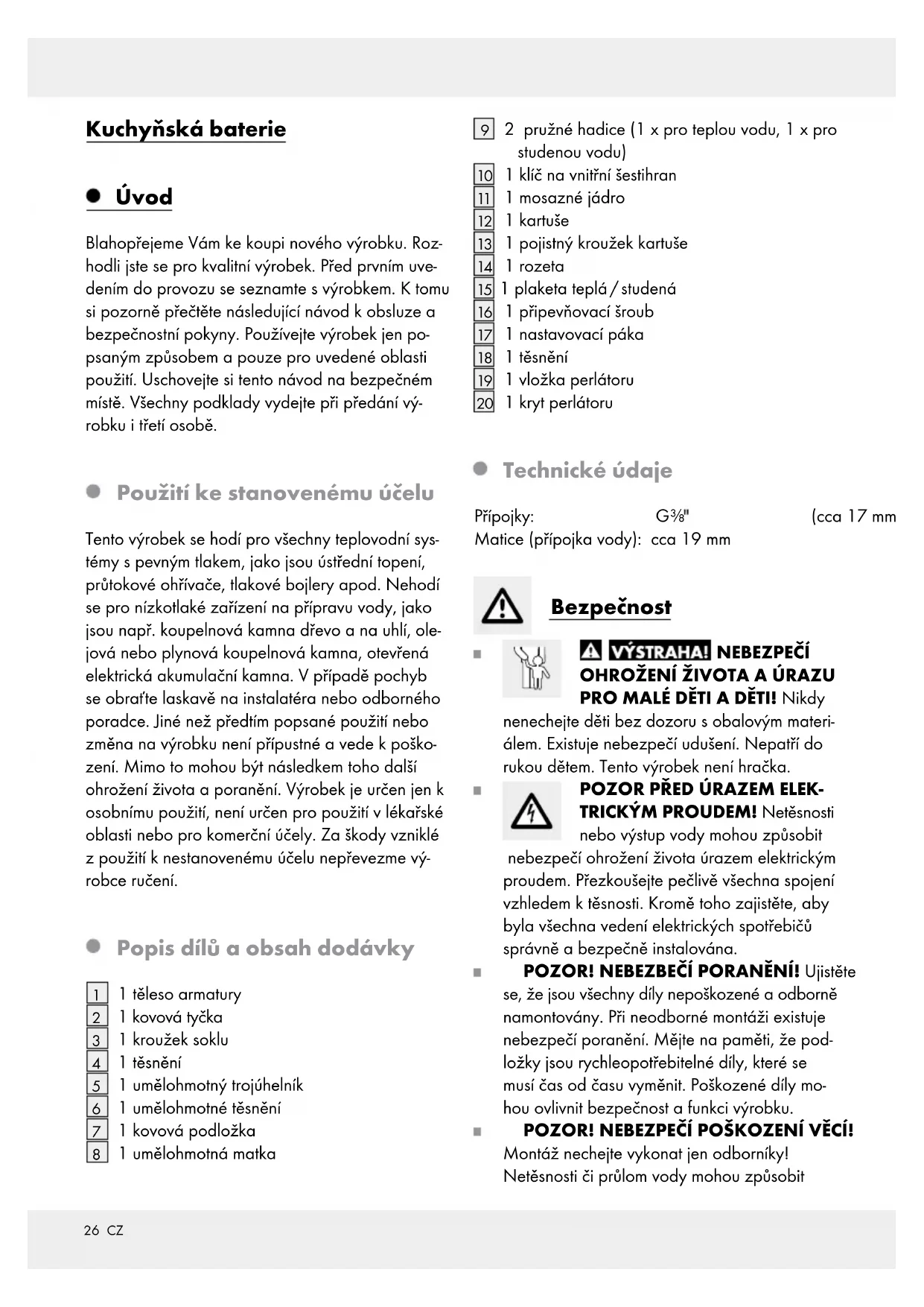 v pravidelných in- tervalech a vyčistěte přitom vápenaté usazeniny a odstraňte cizí tělíska. Při nedodržování návodu k ošetřování se musí počítat s poškozením povrchu. Nároky na zá- ruku nelze uplatňovat.28 CZ Odstranění do odpadu Obal se skládá z ekologicky vhodných materiálů, které můžete jednoduše zlikvidovat prostřednictvím místních recyklačních středisek. Informujte se o možnostech odstranění použitého výrobku do odpadu u Vaší místní obecní nebo městské správy. Informace Pitnost vodovodní vody O pitnosti vody se informujte u místních úřadů ve vašem městě / obce. Pro pitnost vodovodní vody platí zásadně následující doporučení: Nechejte vodu z potrubí krátkou dobu téci, stagnovala-li více než čtyři hodiny v potrubí. Stagnovanou vodu zejména nepoužívejte k pří- pravě jídel a nápojů při výživě kojenců. Jinak mohou vzniknout zdravotní potíže. Čerstvou vodu můžete rozpoznat tím, že citelně chlad- nější opustí potrubí, než stagnovaná voda. Stagnovanou bodu z pochromovaných potrubí nepoužívejte k potravě a / nebo k péči o tělo, jste-li alergičtí na nikl. Taková voda může obsa- hovat velké množství niklu a vyvolat alergické reakce. Pitnou vodu z olovnatých potrubí nepoužívejte k přípravě kojenecké výživy a / nebo během tě- hotenství k přípravě potravin. Olovo vnikne do pitné vody a zejména škodí zdraví kojenců a malých dětí. Záruka Výrobek byl vyroben s nejvyšší pečlivostí podle přísných kvalitativních směrnic a před odesláním prošel výstupní kontrolou. V případě závad máte možnost uplatnění zákonných práv vůči prodejci. Vaše práva ze zákona nejsou omezena naší níže uvedenou zárukou. Na tento artikl platí 5 záruka od data zakoupení. Záruční lhůta začíná od data zakoupení. Uscho- vejte si dobře originál pokladní stvrzenky. Tuto stvr- zenku budete potřebovat jako doklad o zakoupení. Pokud se do 5 let od data zakoupení tohoto výrobku vyskytne vada materiálu nebo výrobní vada, výro- bek Vám – dle našeho rozhodnutí – bezplatně opravíme nebo vyměníme. Tato záruka zaniká, jest- liže se výrobek poškodí, neodborně použil nebo neobdržel pravidelnou údržbu. Záruka platí na vady materiálu a výrobní vady. Tato záruka se nevztahuje na díly výrobku podléhající opotřebení (např. na baterie), dále na poškození křehkých, choulostivých dílů, např. vypínačů, aku- mulátorů nebo dílů zhotovených ze skla. Postup v případě uplatňování záruky Pro zajištění rychlého zpracování Vašeho případu se řiďte následujícími pokyny: Pro všechny požadavky si připravte pokladní stvr- zenku a číslo artiklu (např. IAN 123456_7890) jako doklad o zakoupení. Číslo artiklu najdete na typovém štítku, gravuře, ti- tulní stránce návodu (vlevo dole) nebo na nálepce na zadní nebo spodní straně. V případě poruch funkce nebo jiných závad nejdříve kontaktujte, telefonicky nebo e-mailem, v následují- cím textu uvedené servisní oddělení. Výrobek registrovaný jako vadný potom můžete s přiloženým dokladem o zakoupení (pokladní stvr- zenkou) a údaji k závadě a kdy k ní došlo, bez- platně zaslat na adresu servisu, která Vám byla sdělena.29 CZ Servis Servis Česká republika Tel.: E-Mail: service@kh-sanitary.de 0049 02273 5668 030 SK Kuchynská armatúra Úvod Blahoželáme Vám ku kúpe Vášho nového výrobku. Kúpou ste sa rozhodli pre vysoko kvalitný produkt. Pred prvým uvedením do prevádzky sa oboznámte s výrobkom. Za týmto účelom si pozorne prečítajte nasledujúci návod na obsluhu a bezpečnostné po- kyny. Výrobok používajte iba v súlade s popisom a v uvedených oblastiach používania. Tento návod uschovajte na bezpečnom mieste. Ak výrobok odo- vzdáte ďalšej osobe, priložte k nemu aj všetky pod- klady. Používanie v súlade s určením Tento výrobok je vhodný pre všetky systémy teplej vody odolné voči tlaku, ako je ústredné kúrenie, prietokový ohrievač, tlakový bojler a pod. Nie je vhodný pre nízkotlakové ohrievače teplej vody ako napr. kúpeľňové kachle na drevo alebo uhlie, kúpeľ- ňové kachle na olej alebo plyn, otvorené elektrické zásobníkové ohrievače vody. V prípade pochybností sa obráťte na inštalatéra alebo odborného poradcu. Iné použitie ako je vyššie popísané alebo úpravy výrobku nie sú dovolené a vedú k poškodeniam. Dôsledkom môžu byť i ďalšie životunebezpečné riziká a poranenia. Výrobok je určený len na súk- romné používanie, nie na medicínske alebo komerčné účely. Výrobca nepreberá ručenie za škody vzniknuté v dôsledku neprimeraného používania. Popis častí a obsah dodávky