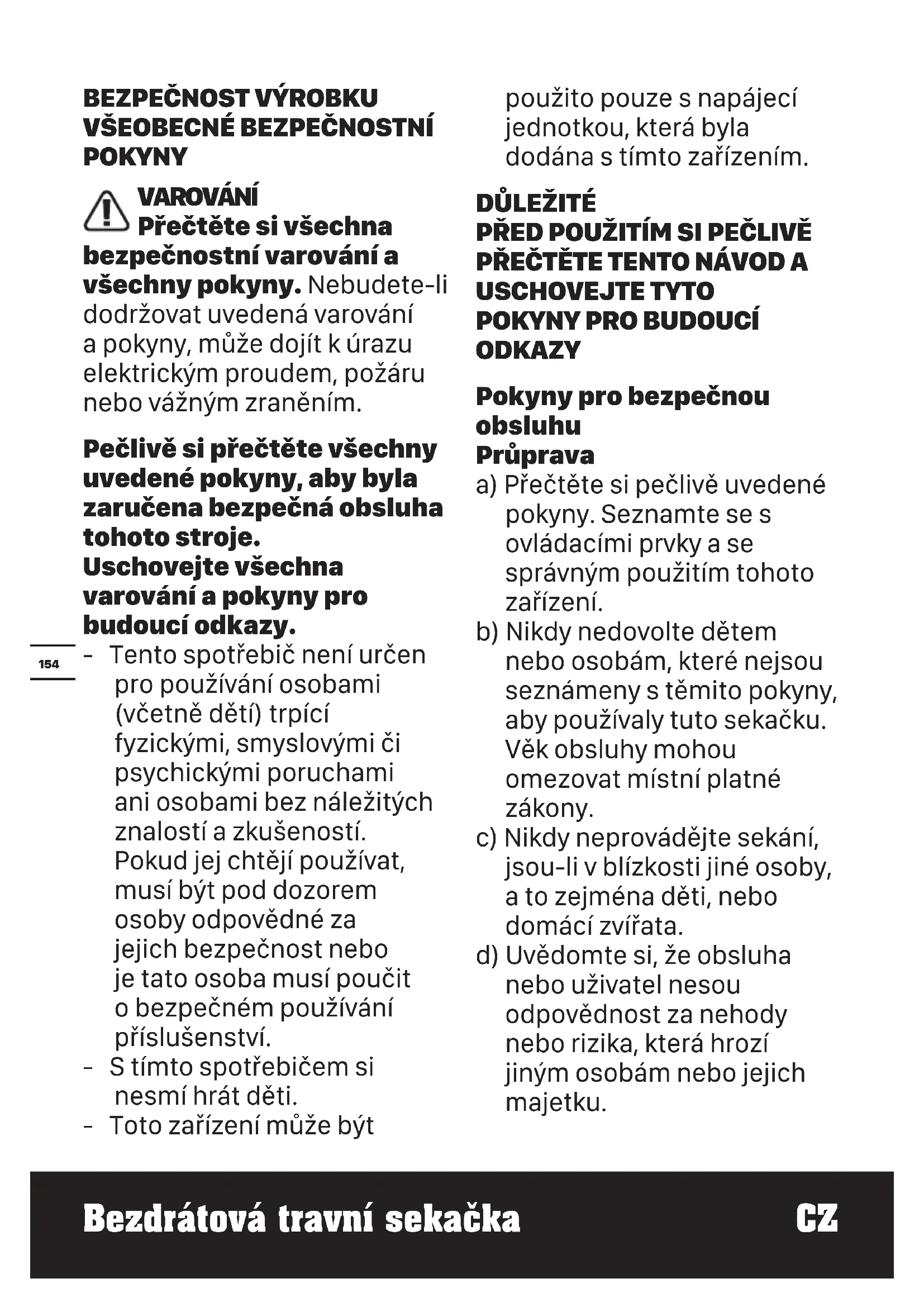 ODKAZY Pokyny pro bezpečnou obsluhu Průprava a) Přečtěte si pečlivě uvedené pokyny. Seznamte se s ovládacími prvky a se správným použitím tohoto zařízení. b) Nikdy nedovolte dětem nebo osobám, které nejsou seznámeny s těmito pokyny, aby používaly tuto sekačku. Věk obsluhy mohou omezovat místní platné zákony. c) Nikdy neprovádějte sekání, jsou-li v blízkosti jiné osoby, a to zejména děti, nebo domácí zvířata. d) Uvědomte si, že obsluha nebo uživatel nesou odpovědnost za nehody nebo rizika, která hrozí jiným osobám nebo jejich majetku.155 %H]GUiWRYiWUDYQtVHNDĀND