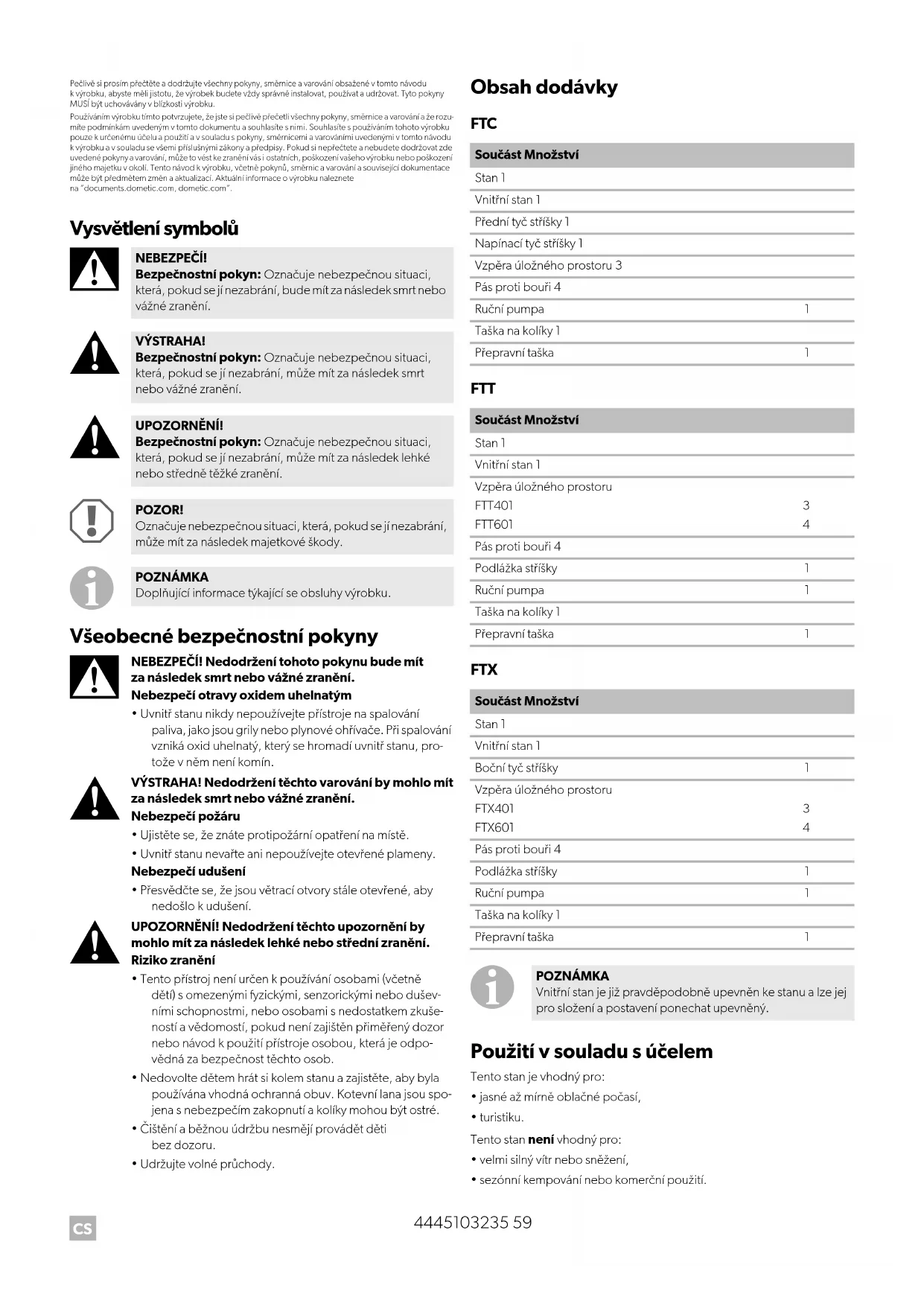 - sezónní kempování nebo komerční použití. NEBEZPEČÍ! Bezpečnostní pokyn: Označuje nebezpečnou situaci, která, pokud se jí nezabrání, bude mít za následek smrt nebo vážné zranění. VÝSTRAHA! Bezpečnostní pokyn: Označuje nebezpečnou situaci, která, pokud se jí nezabrání, může mít za následek smrt nebo vážné zranění. UPOZORNĚNÍ! Bezpečnostní pokyn: Označuje nebezpečnou situaci, která, pokud se jí nezabrání, může mít za následek lehké nebo středně těžké zranění. POZOR! Označuje nebezpečnou situaci, která, pokud se jí nezabrání, může mít za následek majetkové škody. POZNÁMKA Doplňující informace týkající se obsluhy výrobku. Součást Množství Stan 1 Vnitřní stan 1 Přední tyč stříšky 1 Napínací tyč stříšky 1 Vzpěra úložného prostoru 3 Pás proti bouři 4 Ruční pumpa 1 Taška na kolíky 1 Přepravní taška 1 Součást Množství Stan 1 Vnitřní stan 1 Vzpěra úložného prostoru FTT401 FTT601
