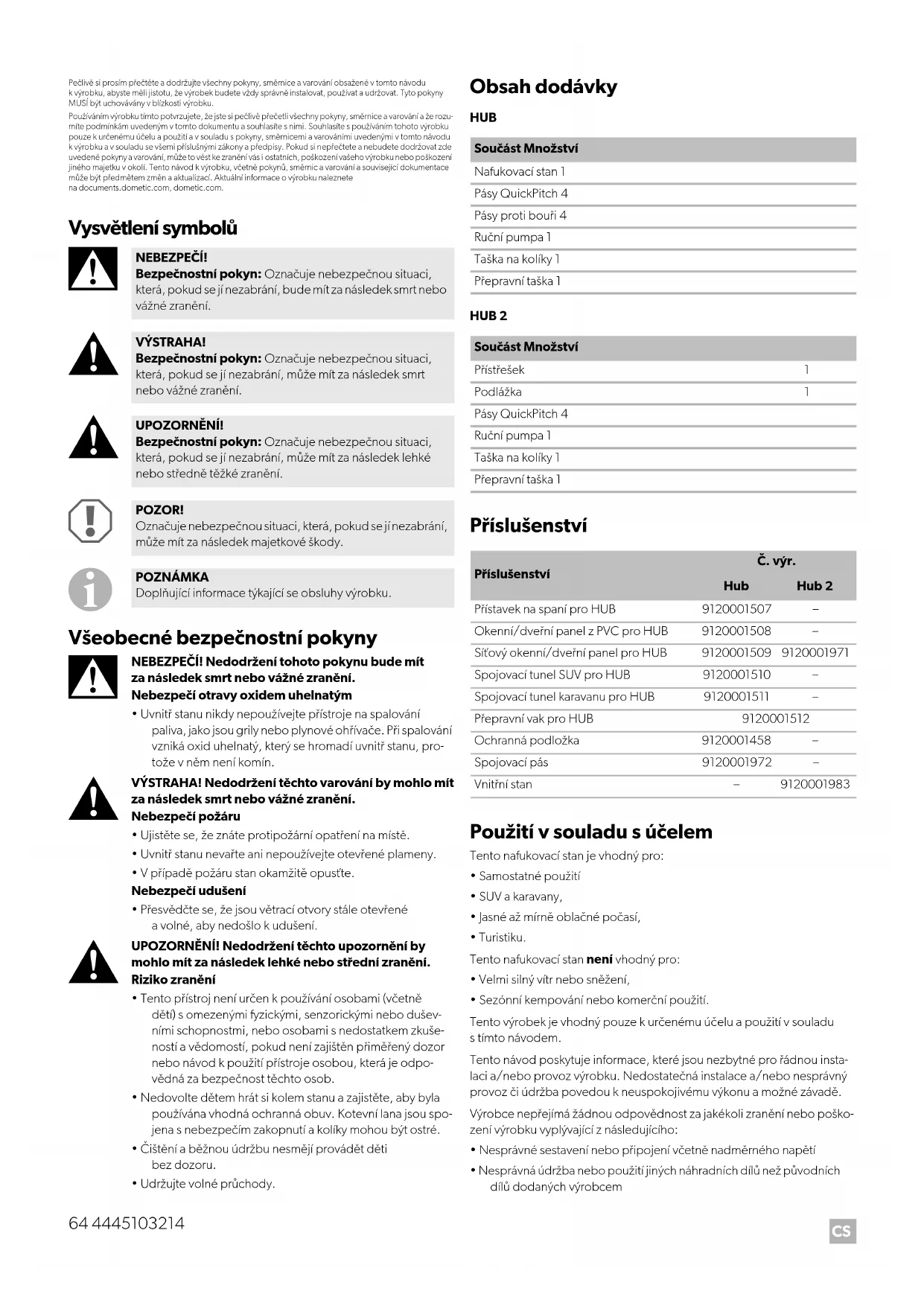 - Nesprávná údržba nebo použití jiných náhradních dílů než původních dílů dodaných výrobcem NEBEZPEČÍ! Bezpečnostní pokyn: Označuje nebezpečnou situaci, která, pokud se jí nezabrání, bude mít za následek smrt nebo vážné zranění. VÝSTRAHA! Bezpečnostní pokyn: Označuje nebezpečnou situaci, která, pokud se jí nezabrání, může mít za následek smrt nebo vážné zranění. UPOZORNĚNÍ! Bezpečnostní pokyn: Označuje nebezpečnou situaci, která, pokud se jí nezabrání, může mít za následek lehké nebo středně těžké zranění. POZOR! Označuje nebezpečnou situaci, která, pokud se jí nezabrání, může mít za následek majetkové škody. POZNÁMKA Doplňující informace týkající se obsluhy výrobku. Součást Množství Nafukovací stan 1 Pásy QuickPitch 4 Pásy proti bouři 4 Ruční pumpa 1 Taška na kolíky 1 Přepravní taška 1 Součást Množství Přístřešek 1 Podlážka 1 Pásy QuickPitch 4 Ruční pumpa 1 Taška na kolíky 1 Přepravní taška 1 Příslušenství Č. výr. Hub Hub 2 Přístavek na spaní pro HUB 9120001507 – Okenní/dveřní panel z PVC pro HUB 9120001508 – Síťový okenní/dveřní panel pro HUB 9120001509 9120001971 Spojovací tunel SUV pro HUB 9120001510 – Spojovací tunel karavanu pro HUB 9120001511 – Přepravní vak pro HUB 9120001512 Ochranná podložka 9120001458 – Spojovací pás 9120001972 – Vnitřní stan – 9120001983CS