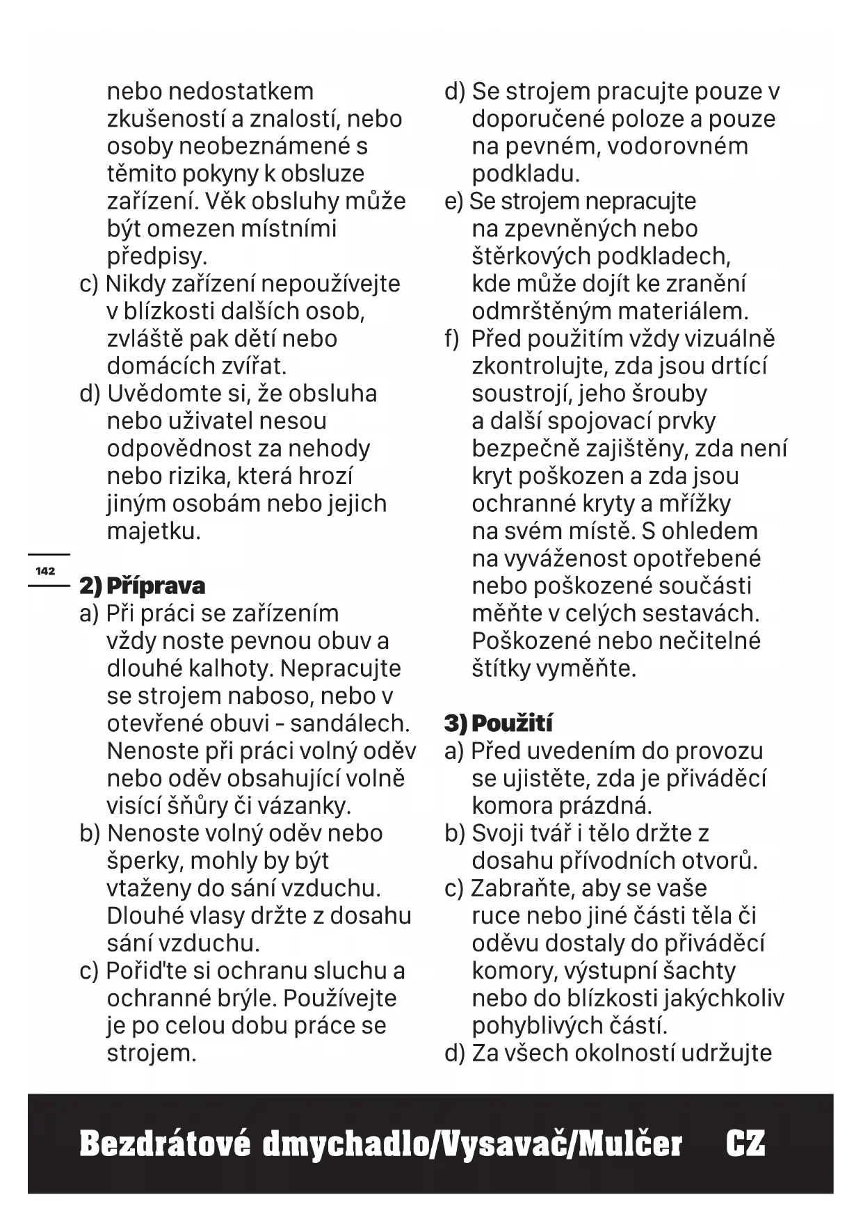 a) Při práci se zařízením vždy noste pevnou obuv a dlouhé kalhoty. Nepracujte se strojem naboso, nebo v otevřené obuvi - sandálech. Nenoste při práci volný oděv nebo oděv obsahující volně visící šňůry či vázanky. b) Nenoste volný oděv nebo šperky, mohly by být vtaženy do sání vzduchu. Dlouhé vlasy držte z dosahu sání vzduchu. c) Pořiďte si ochranu sluchu a ochranné brýle. Používejte je po celou dobu práce se strojem. d) Se strojem pracujte pouze v doporučené poloze a pouze na pevném, vodorovném podkladu. e) Se strojem nepracujte na zpevněných nebo štěrkových podkladech, kde může dojít ke zranění odmrštěným materiálem. f) Před použitím vždy vizuálně zkontrolujte, zda jsou drtící soustrojí, jeho šrouby a další spojovací prvky bezpečně zajištěny, zda není kryt poškozen a zda jsou ochranné kryty a mřížky na svém místě. S ohledem na vyváženost opotřebené nebo poškozené součásti měňte v celých sestavách. Poškozené nebo nečitelné štítky vyměňte.