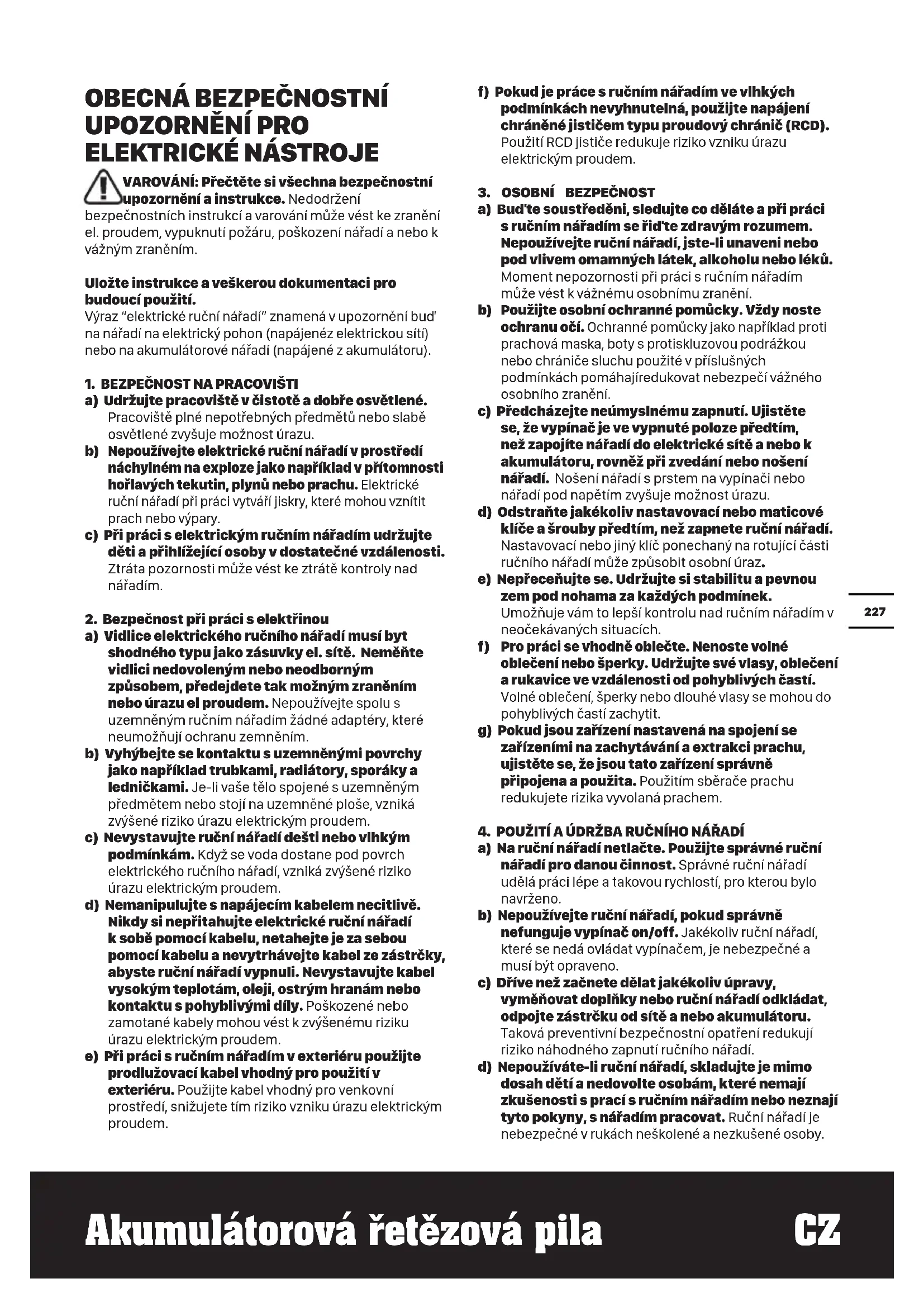 a) Na ruční nářadí netlačte. Použijte správné ruční nářadí pro danou činnost. Správné ruční nářadí udělá práci lépe a takovou rychlostí, pro kterou bylo navrženo. b) Nepoužívejte ruční nářadí, pokud správně nefunguje vypínač on/off. Jakékoliv ruční nářadí, které se nedá ovládat vypínačem, je nebezpečné a musí být opraveno. c) Dříve než začnete dělat jakékoliv úpravy, vyměňovat doplňky nebo ruční nářadí odkládat, odpojte zástrčku od sítě a nebo akumulátoru. Taková preventivní bezpečnostní opatření redukují riziko náhodného zapnutí ručního nářadí. d) Nepoužíváte-li ruční nářadí, skladujte je mimo dosah dětí a nedovolte osobám, které nemají zkušenosti s prací s ručním nářadím nebo neznají tyto pokyny, s nářadím pracovat. Ruční nářadí je nebezpečné v rukách neškolené a nezkušené osoby.228 Akumulátorová řetězová pila CZ
