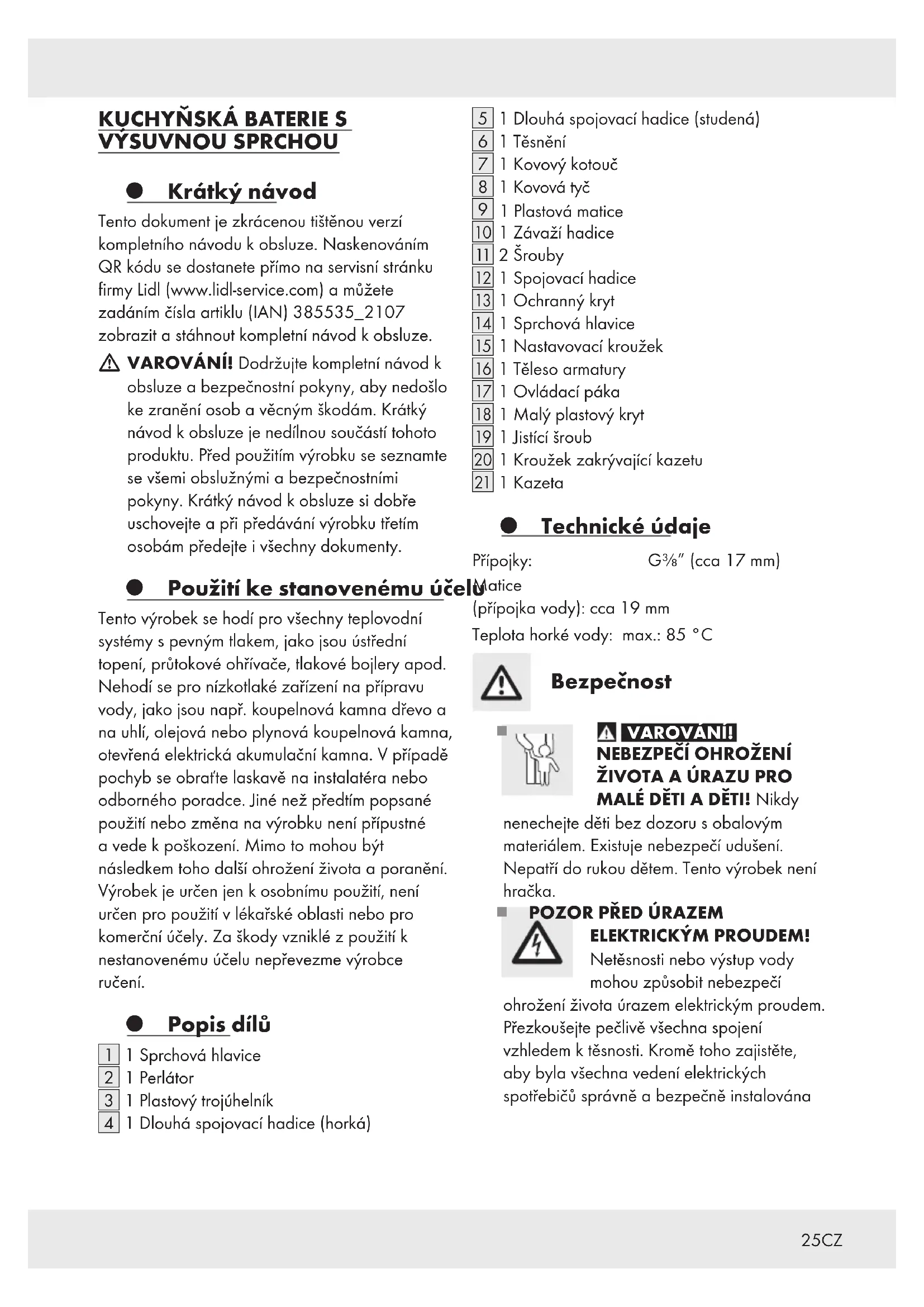 Krátký návod Tento dokument je zkrácenou tištěnou verzí kompletního návodu k obsluze. Naskenováním QR kódu se dostanete přímo na servisní stránku firmy Lidl (www.lidl-service.com) a můžete zadáním čísla artiklu (IAN) 385535_2107 zobrazit a stáhnout kompletní návod k obsluze.