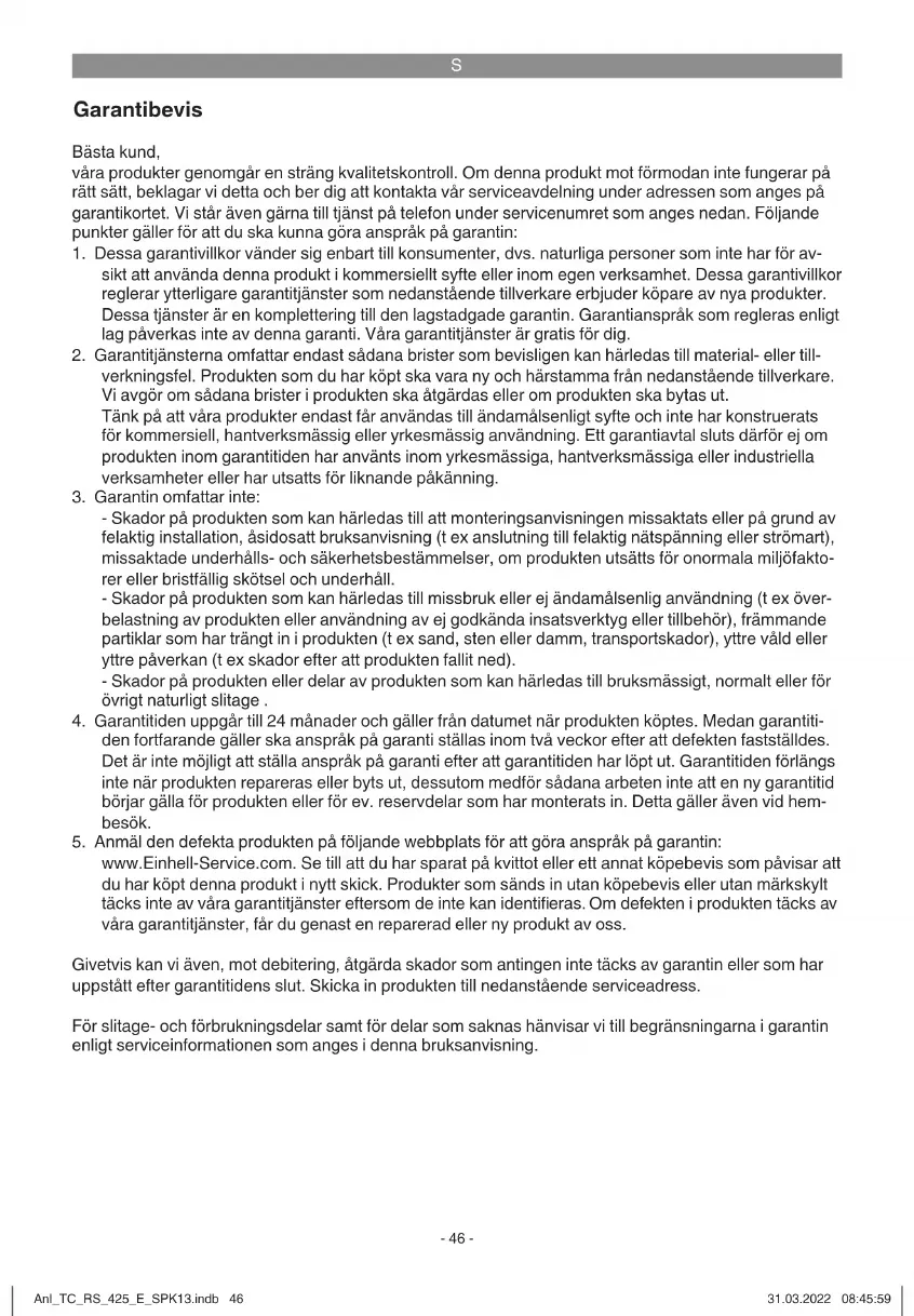 www.Einhell-Service.com. Mějte připravenu nákupní účtenku nebo jiné doklady o vašem nákupu. Přístroje, které jsou zaslány bez odpovídajících dokladů a bez typového štítku, jsou ze záručního plnění vyloučeny z důvodu nedostatečné možnosti jednoznačného přiřazení. Pokud je defekt přístroje zahrnut v naší záruce, obdržíte obratem zpátky opravený nebo nový přístroj. Samozřejmě Vám rádi odstraníme nedostatky na přístroji na Vaše náklady, pokud tyto nedostatky nej- sou nebo už nejsou zahrnuty v rozsahu záruky. V takovém případě nám prosím zašlete přístroj na naší servisní adresu. V případě rychle opotřebitelných dílů, spotřebních dílů a chybějících dílů poukazujeme na omezení této záruky podle servisních informací uvedených v tomto návodu k obsluze. Anl_TC_RS_425_E_SPK13.indb 53Anl_TC_RS_425_E_SPK13.indb 53 31.03.2022 08:46:0231.03.2022 08:46:02SK