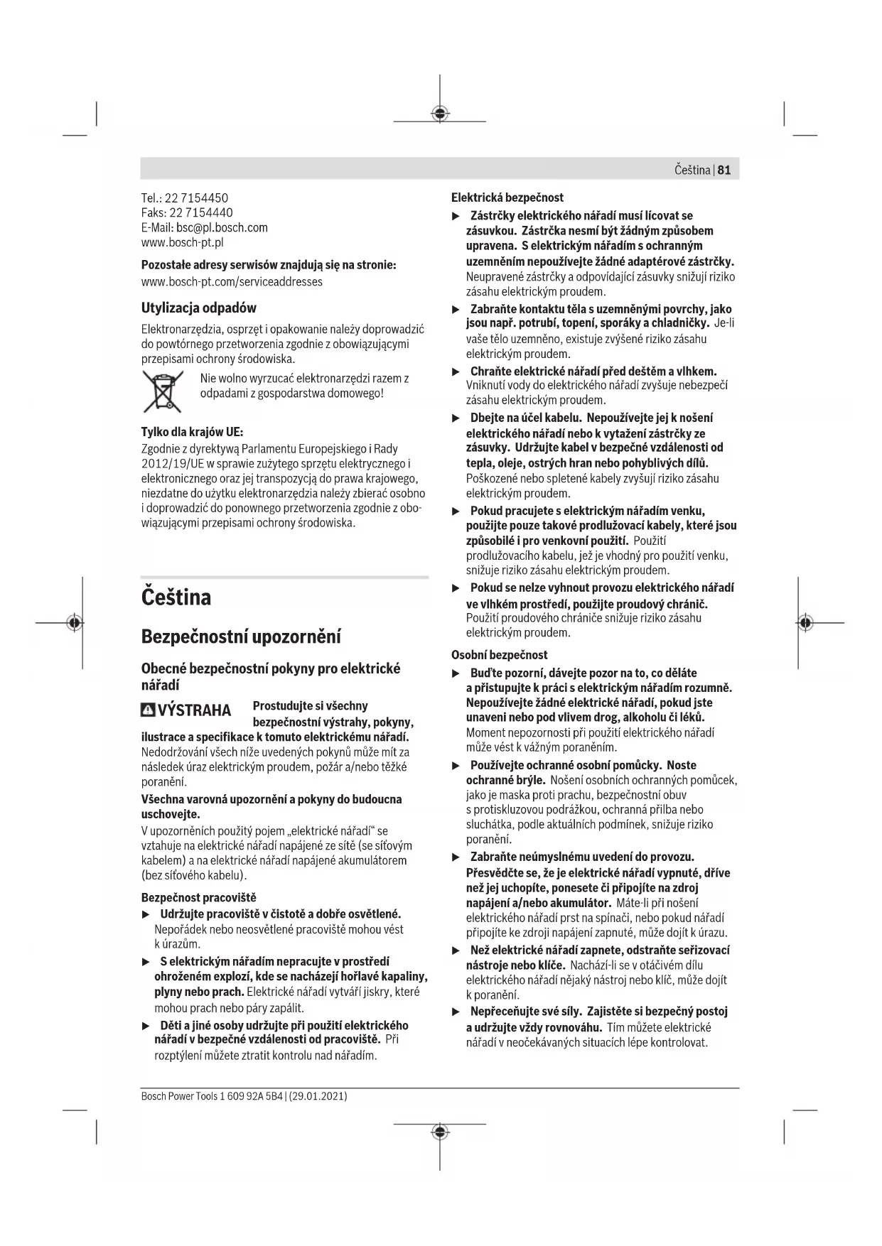 Úroveň vibrací aúroveň hluku, které jsou uvedené vtěchto pokynech, byly změřeny pomocí normované měřicí metody alze je použít pro vzájemné porovnání elektronářadí. Hodí se ipro předběžný odhad zatížení vibracemi ahlukem. Uvedená úroveň vibrací aúroveň hluku reprezentuje hlavní použití elektronářadí. Pokud se ovšem bude elektronářadí používat pro jiné práce, sjinými nástroji nebo snedostatečnou údržbou, může se úroveň hluku aúroveň vibrací lišit. To může zatížení vibracemi ahlukem po celou pracovní dobu zřetelně zvýšit. Pro přesný odhad zatížení vibracemi ahlukem by měly být zohledněny idoby, kdy je nářadí vypnuté nebo běží, ale ve skutečnosti se nepoužívá. To může zatížení vibracemi ahlukem po celou pracovní dobu výrazně snížit. Stanovte dodatečná bezpečnostní opatření kochraně obsluhy před účinky vibrací, jako je např. údržba elektronářadí anástrojů, udržování teplých rukou, organizace pracovních procesů. Montáž u Před každou prací na elektronářadí vytáhněte zástrčku ze zásuvky. Nasazení/výměna pilového plátku u Při montáži nebo výměně nástroje noste ochranné rukavice. Nástroje jsou ostré apři delším používání se mohou zahřívat. Výběr pilového plátku Přehled doporučených pilových plátků naleznete na konci tohoto návodu. Používejte pouze pilové plátky sjedním výstupkem (stopkaT). Pilový plátek by neměl být delší, než je pro daný řez nutné. Pro řezání úzkých křivek používejte úzké pilové plátky. Nasazení pilového plátku (vizobrázekA) u Před nasazením pilového plátku očistěte stopku. Znečistěnou stopku nelze spolehlivě upevnit. Bosch Power Tools 1 609 92A 5B4 | (29.01.2021)84 | Čeština Posuňte pilový plátek (11), zuby ve směru řezu, do upínání pilového plátku (9) tak, aby zaskočil. Při nasazování pilového plátku dbejte na to, aby zadní hrana pilového plátku byla vdrážce vodicího kolečka (10). u Zkontrolujte, zda je pilový plátek řádně upevněný. Volný pilový plátek může vypadnout aporanit vás. Vyjmutí pilového plátku (viz obrázek B) Posuňte upínání pilového plátku (9) ve směru šipky nahoru avyjměte pilový plátek (11). Chránič proti otřepům (viz obrázek C) Chránič proti otřepům (15) (příslušenství) může zabránit vytrhávání povrchu při řezání dřeva. Chránič proti otřepům lze používat pouze uurčitých typů pilových plátků apouze při úhlu řezu 0°. Chránič proti otřepům (15) zatlačte zespodu do základní desky (7). Odsávání prachu/třísek Prach zmateriálů, jako jsou nátěry sobsahem olova, některé druhy dřeva, minerály akov, může být zdraví škodlivý. Kontakt sprachem nebo vdechnutí mohou upracovníka nebo osob nacházejících se vblízkosti vyvolat alergické reakce a/nebo onemocnění dýchacích cest. Určitý prach, jako dubový nebo bukový prach, je pokládán za karcinogenní, zvláště ve spojení spřídavnými látkami pro ošetření dřeva (chromát, ochranné prostředky na dřevo). Materiál obsahující azbest smějí opracovávat pouze specialisté. – Pokud možno používejte pro daný materiál vhodné odsávání prachu. – Zajistěte dobré větrání pracoviště. – Je doporučeno nosit ochrannou dýchací masku střídou filtruP2. Dodržujte předpisy pro obráběné materiály platné vpříslušné zemi. u Zabraňte hromadění prachu na pracovišti. Prach se může lehce vznítit. Kryt Než připojíte elektronářadí kodsávání prachu, namontujte kryt (13). Nasaďte kryt (13) na elektronářadí tak, aby držáky zaskočily do otvorů vkrytu. Při práci bez odsávání prachu aupokosových řezů kryt (13) sejměte. Za tímto účelem stiskněte kryt ve výšce vnějších držáků ksobě avytáhněte ho dopředu. Připojení odsávání prachu Nasaďte odsávací hadici (5) (příslušenství) na odsávací hrdlo (6). Připojte odsávací hadici (5) kvysavači (příslušenství). Přehled připojení krůzným vysavačům najdete na konci tohoto návodu. Pro optimální odsávání používejte pokud možno chránič proti otřepům (15). Vysavač musí být vhodný pro řezaný materiál. Při odsávání obzvlášť zdraví škodlivého, karcinogenního nebo suchého prachu použijte speciální vysavač. Provoz Druhy provozu u Před každou prací na elektronářadí vytáhněte zástrčku ze zásuvky. Nastavení předkmitu Ve čtyřech stupních nastavitelný předkmit umožňuje optimální přizpůsobení rychlosti řezu, řezného výkonu avzhledu řezu řezanému materiálu. Nastavovací páčkou (8) můžete nastavit předkmit iza provozu. Stupeň0 žádný předkmit StupeňI malý předkmit StupeňII střední předkmit StupeňIII velký předkmit Optimální stupeň předkmitu pro příslušné použití lze zjistit praktickou zkouškou. Přitom platí následující doporučení: – Předkmit zvolte tím menší, resp. předkmit zcela vypněte, čím jemnější ačistší má být hrana řezu. – Při řezání tenkých obrobků (např. plechů) předkmit vypněte. – Při řezání tvrdých materiálů (např. oceli) pracujte smalým předkmitem. – Vměkkých materiálech apři řezání dřeva ve směru vláken můžete pracovat smaximálním předkmitem. Nastavení pokosového úhlu (viz obrázekD) Základní desku (7) lze pro pokosové úhly až 45° otočit doprava nebo doleva. Při pokosových řezech nelze nasadit chránič proti otřepům (15). – Sejměte chránič proti otřepům (15). – Povolte šroub (16) aposuňte základní desku (7) mírně kpilovému kotouči (11). – Pro nastavení přesných pokosových úhlů má základní deska vpravo avlevo aretační body pro 0° a45°. Otočte základní desku (7) podle stupnice (17) do požadované polohy. Jiné pokosové úhly lze nastavit pomocí 