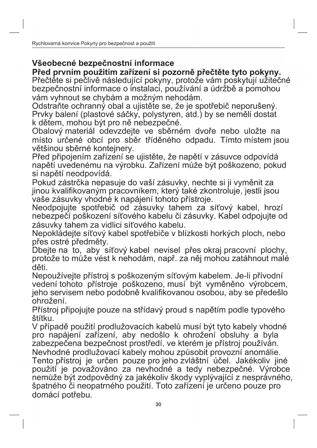 Všeobecné bezpečnostní informace Před prvním použitím zařízení si pozorně přečtěte tyto pokyny. Přečtěte si pečlivě následující pokyny, protože vám poskytují užitečné bezpečnostní informace o instalaci, používání a údržbě a pomohou vám vyhnout se chybám a možným nehodám. Odstraňte ochranný obal a ujistěte se, že je spotřebič neporušený. Prvky balení (plastové sáčky, polystyren, atd.) by se neměli dostat k dětem, mohou být pro ně nebezpečné. Obalový materiál odevzdejte ve sběrném dvoře nebo uložte na místo určené obcí pro sběr tříděného odpadu. Tímto místem jsou většinou sběrné kontejnery. Před připojením zařízení se ujistěte, že napětí v zásuvce odpovídá napětí uvedenému na výrobku. Zařízení může být poškozeno, pokud si napětí neodpovídá. Pokud zástrčka nepasuje do vaší zásuvky, nechte si ji vyměnit za jinou kvalikovaným pracovníkem, který také zkontroluje, jestli jsou vaše zásuvky vhodné k napájení tohoto přístroje. Neodpojujte spotřebič od zásuvky tahem za síťový kabel, hrozí nebezpečí poškození síťového kabelu či zásuvky. Kabel odpojujte od zásuvky tahem za vidlici síťového kabelu. Nepokládejte síťový kabel spotřebiče v blízkosti horkých ploch, nebo přes ostré předměty. Dbejte na to, aby síťový kabel nevisel přes okraj pracovní plochy, protože to může vést k nehodám, např. za něj mohou zatáhnout malé děti. Nepoužívejte přístroj s poškozeným síťovým kabelem. Je-li přívodní vedení tohoto přístroje poškozeno, musí být vyměněno výrobcem, jeho servisem nebo podobně kvalikovanou osobou, aby se předešlo ohrožení. Přístroj připojujte pouze na střídavý proud s napětím podle typového štítku. V případě použití prodlužovacích kabelů musí být tyto kabely vhodné pro napájení zařízení, aby nedošlo k ohrožení obsluhy a byla zabezpečena bezpečnost prostředí, ve kterém je přístroj používán. Nevhodné prodlužovací kabely mohou způsobit provozní anomálie. Tento přístroj je určen pouze pro jeho zvláštní účel. Jakékoliv jiné použití je považováno za nevhodné a tedy nebezpečné. Výrobce nemůže být zodpovědný za jakékoliv škody vyplývající z nesprávného, špatného či neopatrného použití. Toto zařízení je určeno pouze pro domácí potřebu.Rychlovarná konvice Pokyny pro bezpečnost a použití