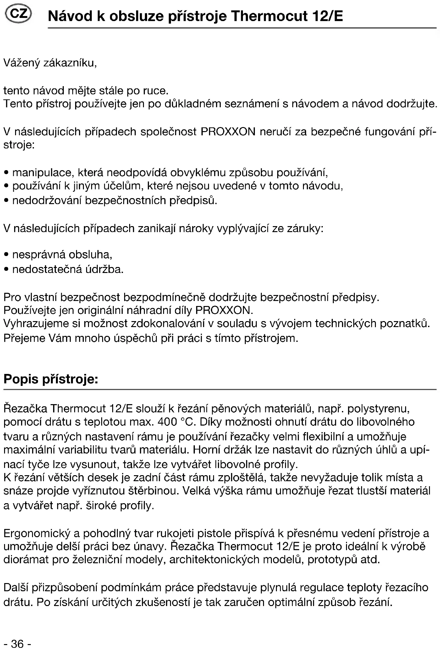 Datum: 21. November 2008 Dipl-ing Jörg Wagner PROXXON S.A.Návod k obsluze přístroje Thermocut 12/E Vážený zákazníku, tento návod mějte stále po ruce. Tento přístroj používejte jen po důkladném seznámení s návodem a návod dodržujte. V následujících případech společnost PROXXON neručí za bezpečné fungování pří- stroje: