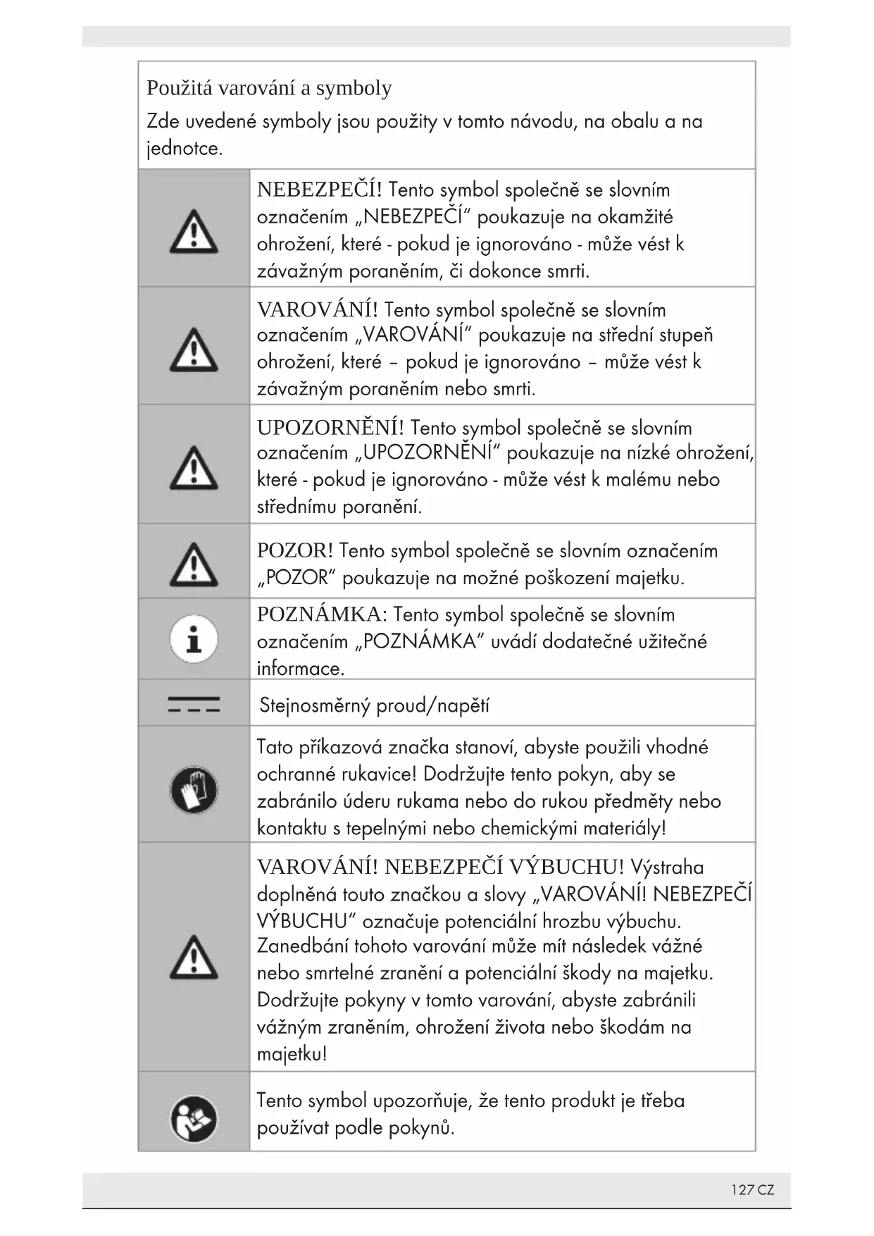 ) se rozsvítí podsvícení displeje. Podsvícení automaticky zhasne 5 sekund po posledním stisknutí tlačítka. P Skladování mimo používání Před skladováním je nutné vyjmout baterie / nabíjecí baterie. Tento produkt skladujte na suchém vnitřním místě chráněném před přímým slunečním zářením, pokud možno v původním obalu. P Čištění Před čistěním produkt vypněte! K čištění nepoužívejte žádné čisticí prostředky na bázi kyselin, abrazivních složek nebo rozpouštědel. V opačném případě může dojít k poškození produktu. Vnější povrch produktu pouze otřete měkkým a suchým hadříkem. K odstranění odolnějšího znečištění lze použít jemný čisticí prostředek.144 CZ P Odstraňování potíží Potíž Řešení Zařízení nelze zapnout. Možnost 1: Vyměňte v produktu baterie / nabíjecí baterie. Možnost 2: Zkontrolujte, že jsou baterie / nabíjecí baterie vložené do přihrádky se správnou orientací. Možnost 3: Nabijte nabíjecí baterie v produktu. Možnost 4: Stiskněte a alespoň 3 sekundy podržte vypínač