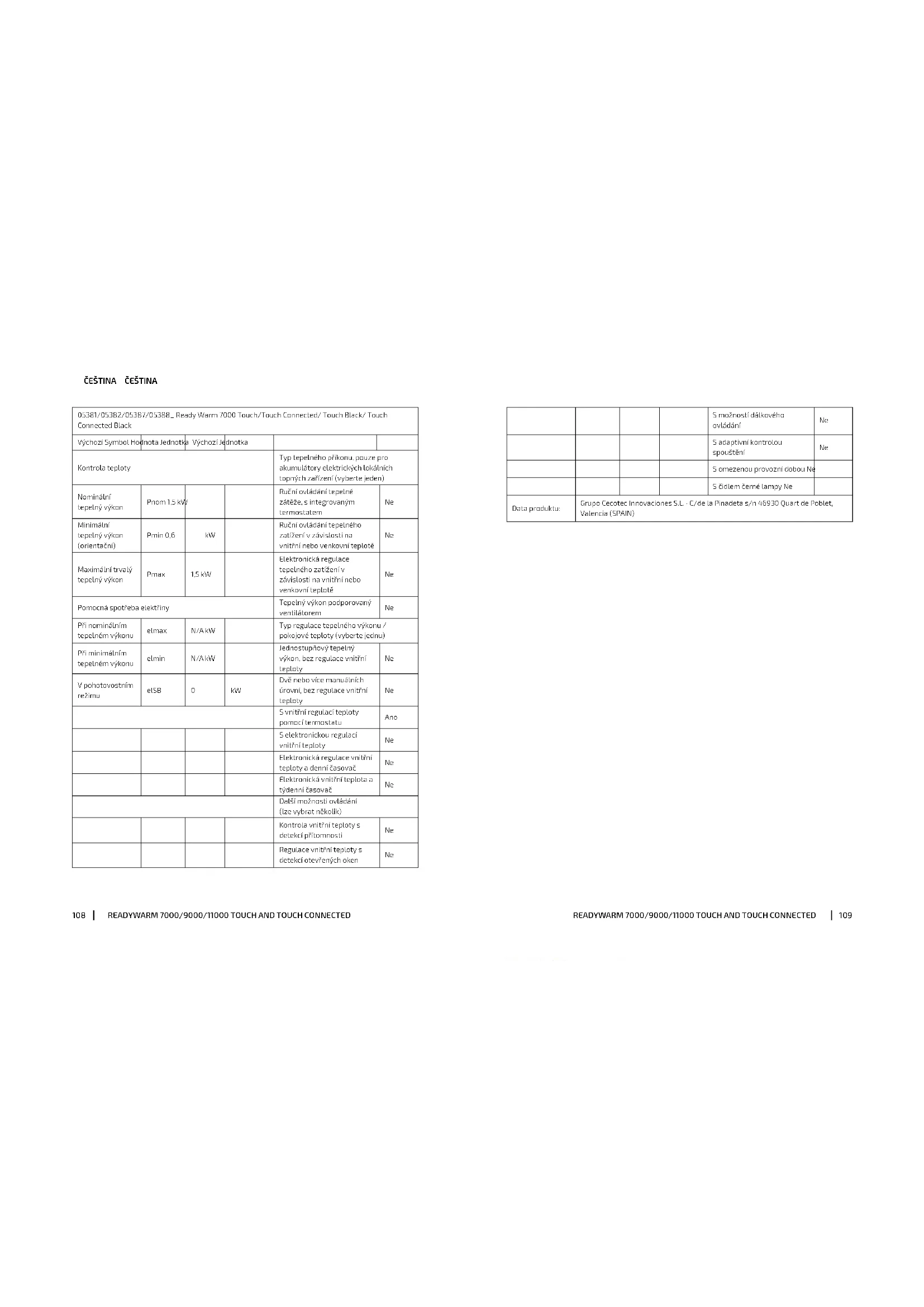 S omezenou provozní dobou Ne S čidlem černé lampy Ne Data produktu: Grupo Cecotec Innovaciones S.L. · C/de la Pinadeta s/n 46930 Quart de Poblet, Valencia (SPAIN) 05383/05384/05389/05390_ Ready Warm 9000 Touch/Touch Connected/ Touch Black/ Touch Connected Black Výchozí Symbol Hodnota Jednotka Výchozí Jednotka Kontrola teploty Typ tepelného příkonu, pouze pro akumulátory elektrických lokálních topných zařízení (vyberte jeden) Nominální tepelný výkon Pnom 2,0 kW Ruční ovládání tepelné zátěže, s integrovaným termostatem