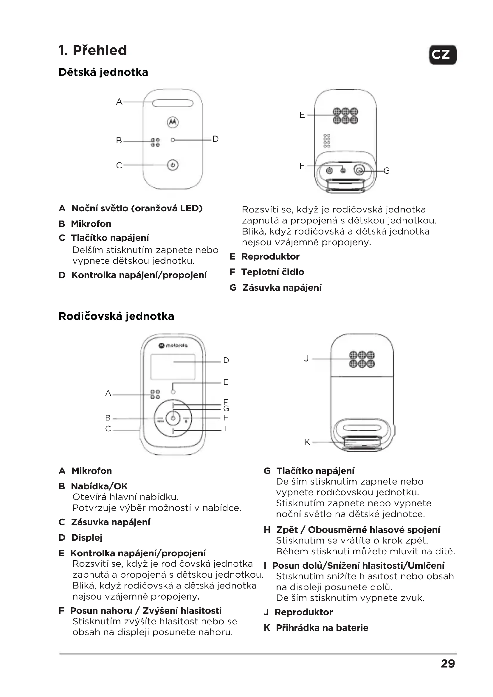 Dětská jednotka A Noční světlo (oranžová LED) B Mikrofon C Tlačítko napájení Delším stisknutím zapnete nebo vypnete dětskou jednotku. D Kontrolka napájení/propojení Rozsvítí se, když je rodičovská jednotka zapnutá a propojená s dětskou jednotkou. Bliká, když rodičovská a dětská jednotka nejsou vzájemně propojeny. E Reproduktor F Teplotní čidlo G Zásuvka napájení Rodičovská jednotka A Mikrofon B Nabídka/OK Otevírá hlavní nabídku. Potvrzuje výběr možností v nabídce. C Zásuvka napájení D Displej E Kontrolka napájení/propojení Rozsvítí se, když je rodičovská jednotka zapnutá a propojená s dětskou jednotkou. Bliká, když rodičovská a dětská jednotka nejsou vzájemně propojeny. F Posun nahoru / Zvýšení hlasitosti Stisknutím zvýšíte hlasitost nebo se obsah na displeji posunete nahoru.