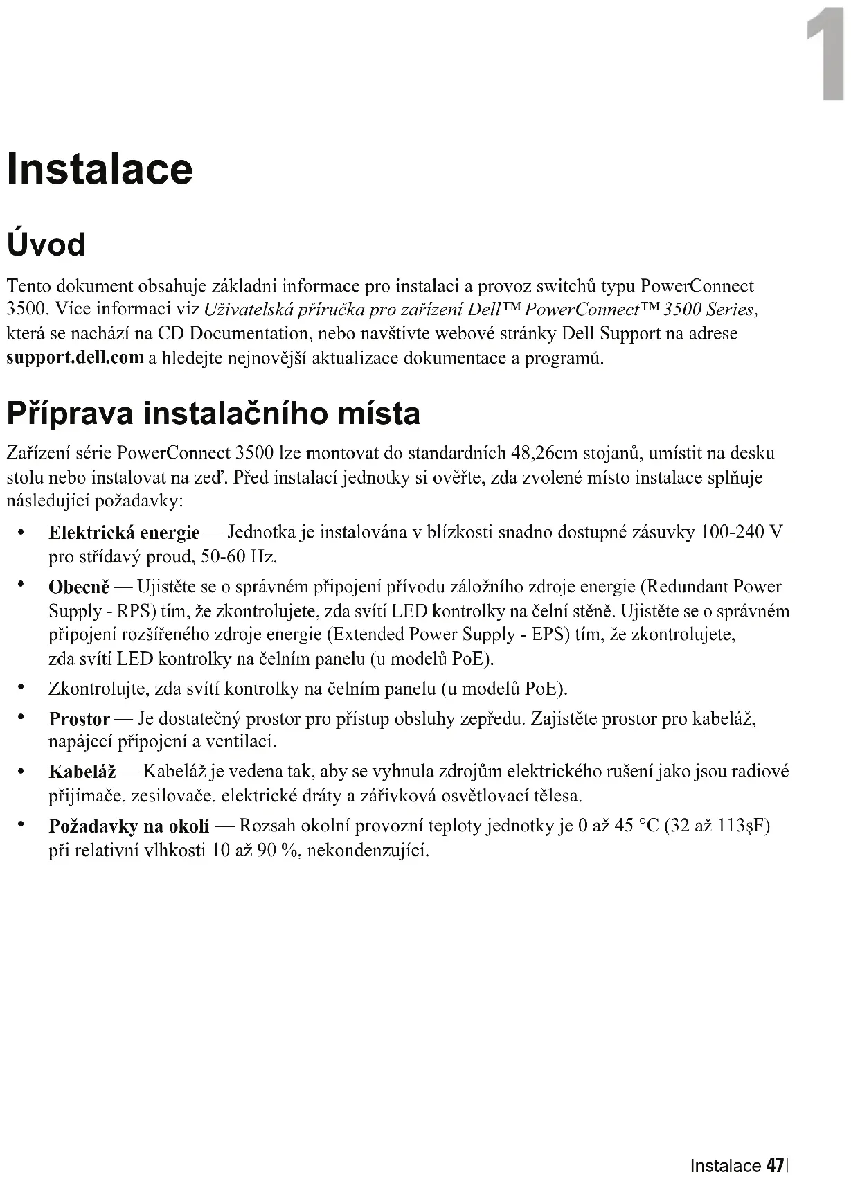 Počáteční konfigurace . . . . . . . . . . . . . . . . . . . . . . . 5946 ObsahInstalace 47 Instalace Úvod Tento dokument obsahuje základní informace pro instalaci a provoz switchů typu PowerConnect 3500. Více informací viz Uživatelská příručka pro zařízení Dell™ PowerConnect™ 3500 Series