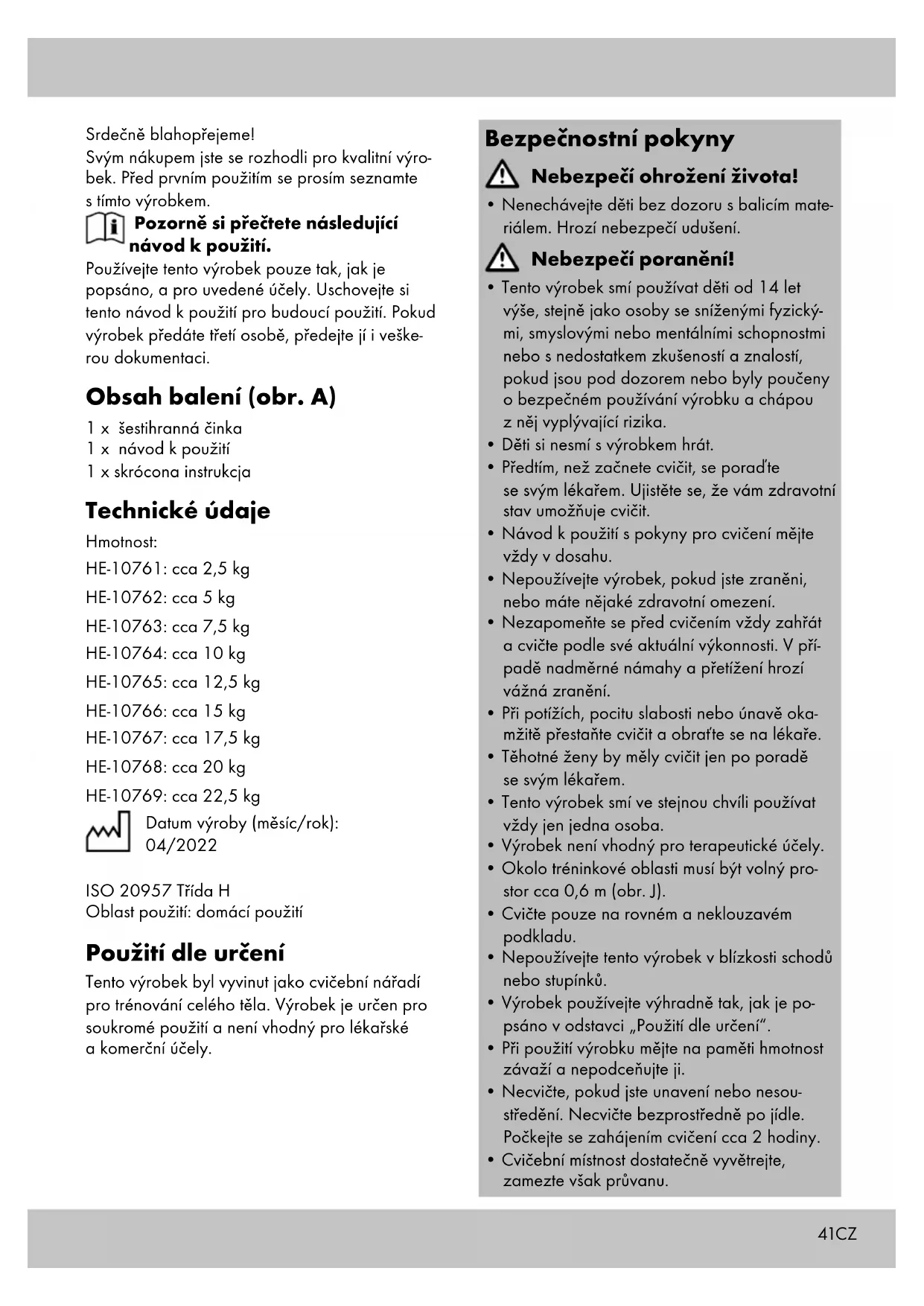 Důležité: Dbejte na to, abyste měli steh- na rovnoběžně. Pánev přitom vysuňte dopředu, trup zůstává vzpřímený. Uskladnění, čištění Pokud výrobek nepoužíváte, skladujte jej vždy suchý a čistý při pokojové teplotě. Čistěte pouze vlhkým hadříkem a následně otřete do sucha. DŮLEŽITÉ! K čištění nikdy nepoužívejte agresivní čisticí prostředky. Pokyny k likvidaci Výrobek a obalový materiál likvidujte do odpa- du podle aktuálních místních předpisů. Obalový materiál, jako např. fóliové sáčky, nepatří do dětských rukou. Obalový materiál uchovávejte z dosahu dětí. Zlikvidujte produkty a balení ekologicky. Recyklační kód identifikuje různé materiály pro recyklaci. Kód se skládá z recyklačního symbolu - který indikuje recyklační cyklus - a čísla identifikujícího materiál. Pokyny k záruce a průběhu služby Výrobek byl vyroben s velkou péčí a za stálé kontroly. DELTA-SPORT HANDELSKONTOR GmbH poskytuje koncovým privátním zákaz- níkům na tento výrobek tři roky záruky od data nákupu (záruční lhůta) podle následující ustanovení. Záruka se týká pouze vad materiálu a závad ve zpracování. Záruka se nevztahuje na díly, které podléhají normálnímu opotřebení, a proto je nutné na ně pohlížet jako na rychle opotřebitelné díly (např. baterie), a na křehké díly, např. vypínače, akumulátory nebo díly vyrobené ze skla. Nároky z této záruky jsou vyloučeny, pokud vý- robek byl používán neodborně nebo nedovole- ným způsobem nebo nikoli v rámci stanoveného účelu určení nebo předpokládaného rozsahu používání nebo nebyla dodržena zadání v návodu k obsluze, ledaže by koncový zákazník prokázal, že existuje vada materiálu nebo došlo k chybě ve zpracování, které nevyplývají z některé výše uvedených okolností. Nároky ze záruky lze uplatnit pouze v rámci záruční lhůty po předložení originálního poklad- ního dokladu. Proto si prosím uschovejte originál pokladního dokladu. Doba záruky se neprodlu- žuje případnými opravami na základě záruky, zákonné záruky nebo kulance. Totéž platí také pro vyměněné a opravené díly.46 Při reklamacích se prosím obracejte na níže uve- denou horkou linku servisu nebo se s námi spojte e-mailem. Pokud se vyskytne případ reklamace, výrobek Vám – dle naší volby – bezplatně opra- víme, vyměníme nebo Vám vrátíme kupní cenu. Další práva ze záruky nevznikají. Vaše zákonná práva, zejména nároky na zajiště- ní záruky vůči konkrétnímu prodejci, nejsou touto zárukou omezena. IAN: 404074_2110 (22,5 kg) IAN: 404075_2110 (20 kg) IAN: 404076_2110 (17,5 kg) IAN: 404077_2110 (15 kg) IAN: 404078_2110 (12,5 kg) IAN: 404080_2110 (10 kg) IAN: 404081_2110 (7,5 kg) IAN: 404083_2110 (5 kg) IAN: 404084_2110 (2,5 kg) Servis Česko Tel.: 800143873 E-Mail: deltasport@lidl.cz CZ47SK Blahoželáme! Svojím nákupom ste sa rozhodli pre kvalitný výrobok. Pred prvým použitím sa s výrobkom dôkladne oboznámte. Pozorne si prečítajte tento návod na použivanie. Výrobok používajte len uvedeným spôsobom a na uvedený účel. Tento návod na použivanie si dobre uschovajte. Pri odovzdávaní výrobku tretej osobe odovzdajte s výrobkom aj všetky podklady. Rozsah dodávky (obr. A) 1 x šesťuholníková činka 1 x návod na používanie 1 x stručný návod Technické údaje Hmotnosť: HE-10761: cca 2,5 kg HE-10762: cca 5 kg HE-10763: cca 7,5 kg HE-10764: cca 10 kg HE-10765: cca 12,5 kg HE-10766: cca 15 kg HE-10767: cca 17,5 kg HE-10768: cca 20 kg HE-10769: cca 22,5 kg Dátum výroby (mesiac/rok): 04/2022 ISO 20957 trieda H Oblasť použitia: domáce prostredie Určené použitie Tento výrobok bol vyvinutý ako tréningový nástroj, s ktorým môžete trénovať celé telo. Tento výrobok je určený na použitie v súkromnej oblasti a nie je vhodný na medicínske a komerč- né účely. Bezpečnostné pokyny Nebezpečenstvo ohrozenia života!