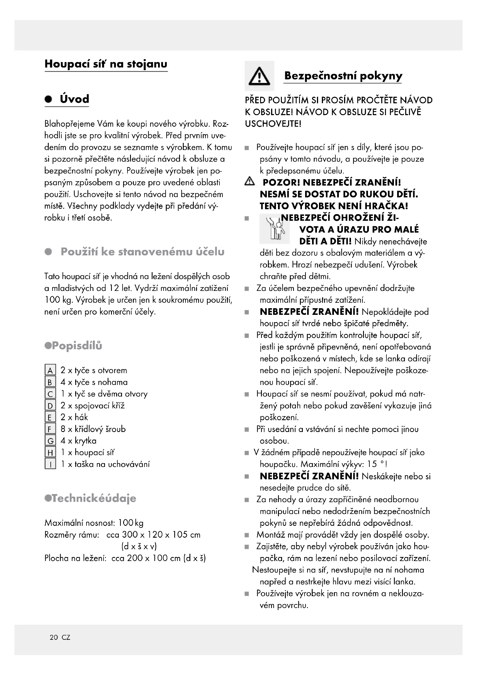 1 x taška na uchovávání Technické údaje Maximální nosnost: 100 kg Rozměry rámu: cca 300 x 120 x 105 cm (d x š x v) Plocha na ležení: cca 200 x 100 cm (d x š) Bezpečnostní pokyny PŘED POUŽITÍM SI PROSÍM PROČTĚTE NÁVOD K OBSLUZE! NÁVOD K OBSLUZE SI PEČLIVĚ USCHOVEJTE! Používejte houpací síť jen s díly, které jsou po- psány vtomto návodu, a používejte je pouze k předepsanému účelu. POZOR! NEBEZPEČÍ ZRANĚNÍ! NESMÍ SE DOSTAT DO RUKOU DĚTÍ. TENTO VÝROBEK NENÍ HRAČKA!