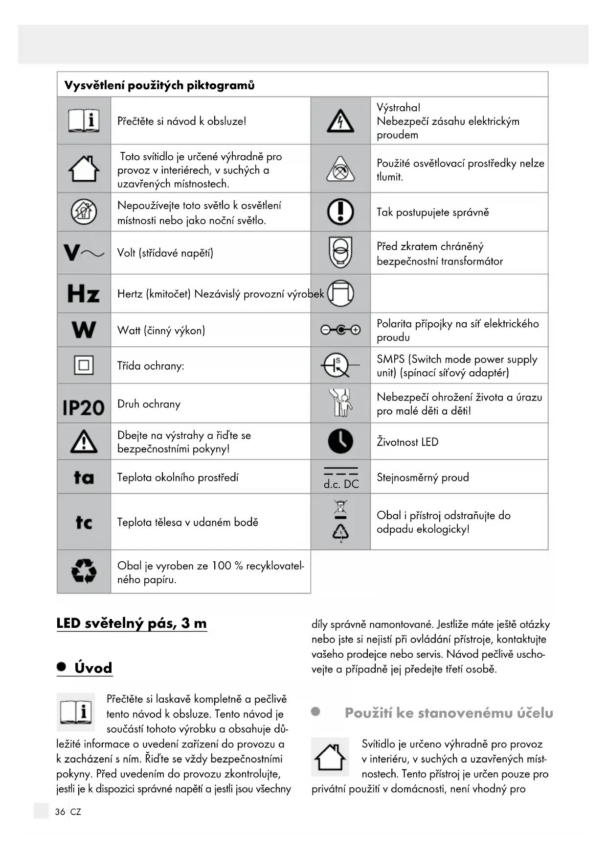 50 Hz 14137100L: maximálně 6 W, 96 LED, maximální délka 3 m 14137206L: maximálně 6 W, 90 LED, maximální délka 3 m Ochranná třída: II / Druh ochrany: IP20 LED nelze vyměnit Bezpečnost Bezpečnostní pokyny Při škodách způsobených nedodržením tohoto ná- vodu k obsluze zaniká záruka! Za následné škody se neručí! Za věcné nebo osobní škody, způsobené neodborným zacházením nebo nerespektováním bezpečnostních pokynů, se neručí! NEBEZPEČÍ
