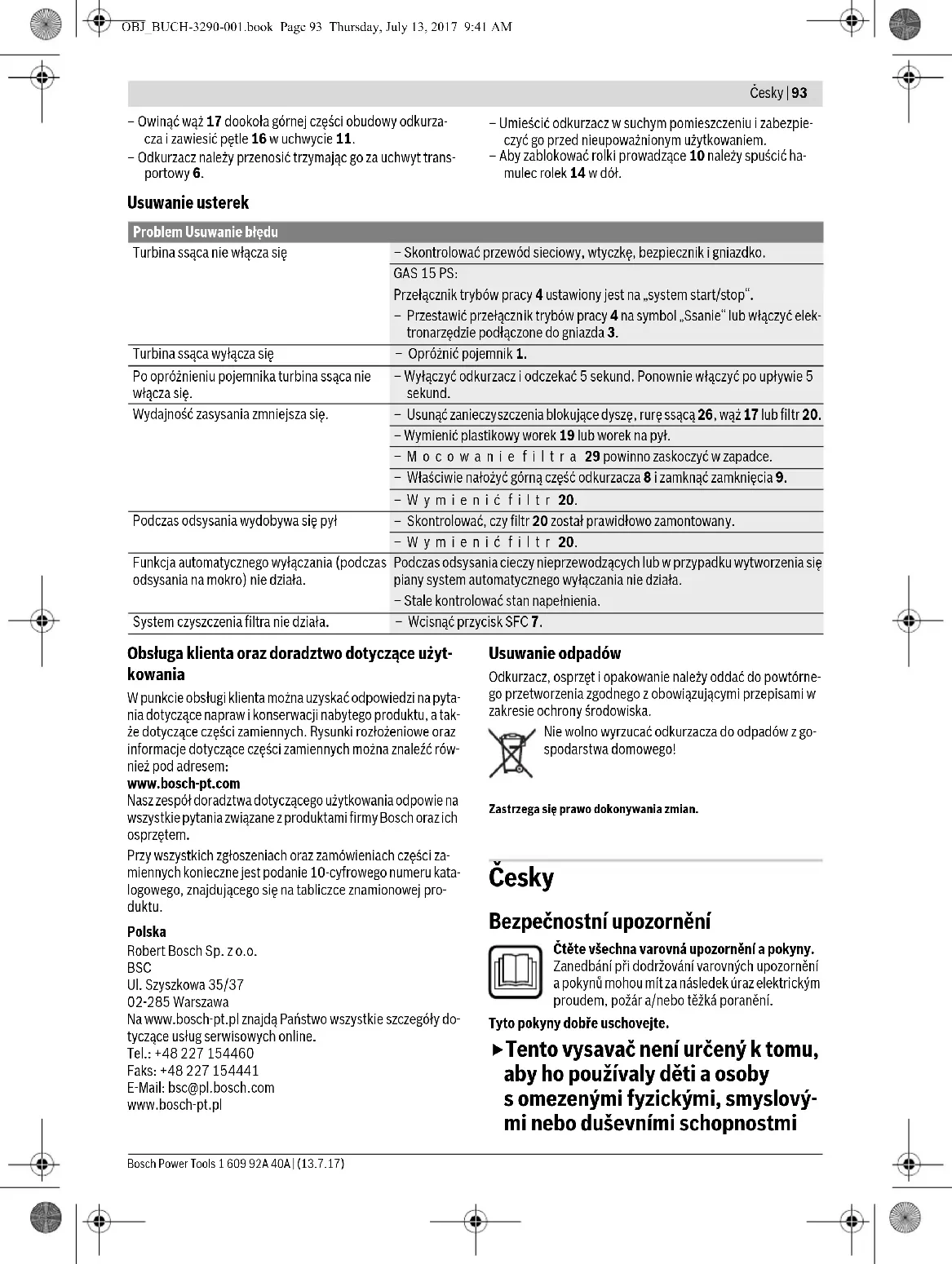 – Nasunąć mocowanie filtra 29 wraz z filtrem 20 na filtr pod- stawowy 30 i przekręcić do oporu mocowanie 29 w kierun- ku „ “. – Ponownie nałożyć górną część odkurzacza 8 i zamknąć za- trzaski 9. Pojemnik –Pojemnik 1 należy od czasu do czasu czyścić, używając do tego celu dostępne w handlu (nie szorujące) środki czysz- czące, a następnie pozostawić do osuszenia. Przechowywanie i transport (zob. rys. I) – Owinąć przewód sieciowy dookoła uchwytu transportowe- go 6. – Wsunąć rury odkurzacza 26 do uchwytów 12. OBJ_BUCH-3290-001.book Page 92 Thursday, July 13, 2017 9:41 AMČesky | 93 Bosch Power Tools 1 609 92A 40A | (13.7.17) – Owinąć wąż 17 dookoła górnej części obudowy odkurza- cza i zawiesić pętle 16 w uchwycie 11. – Odkurzacz należy przenosić trzymając go za uchwyt trans- portowy 6. – Umieścić odkurzacz w suchym pomieszczeniu i zabezpie- czyć go przed nieupoważnionym użytkowaniem. – Aby zablokować rolki prowadzące 10 należy spuścić ha- mulec rolek 14 w dół. Usuwanie usterek Obsługa klienta oraz doradztwo dotyczące użyt- kowania W punkcie obsługi klienta można uzyskać odpowiedzi na pyta- nia dotyczące napraw i konserwacji nabytego produktu, a tak- że dotyczące części zamiennych. Rysunki rozłożeniowe oraz informacje dotyczące części zamiennych można znaleźć rów- nież pod adresem: www.bosch-pt.com Nasz zespół doradztwa dotyczącego użytkowania odpowie na wszystkie pytania związane z produktami firmy Bosch oraz ich osprzętem. Przy wszystkich zgłoszeniach oraz zamówieniach części za- miennych konieczne jest podanie 10-cyfrowego numeru kata- logowego, znajdującego się na tabliczce znamionowej pro- duktu. Polska Robert Bosch Sp. z o.o. BSC Ul. Szyszkowa 35/37 02-285 Warszawa Na www.bosch-pt.pl znajdą Państwo wszystkie szczegóły do- tyczące usług serwisowych online. Tel.: +48 227 154460 Faks: +48 227 154441 E-Mail: bsc@pl.bosch.com www.bosch-pt.pl Usuwanie odpadów Odkurzacz, osprzęt i opakowanie należy oddać do powtórne- go przetworzenia zgodnego z obowiązującymi przepisami w zakresie ochrony środowiska. Nie wolno wyrzucać odkurzacza do odpadów z go- spodarstwa domowego! Zastrzega się prawo dokonywania zmian. Česky Bezpečnostní upozornění Čtěte všechna varovná upozornění a pokyny. Zanedbání při dodržování varovných upozornění a pokynů mohou mít za následek úraz elektrickým proudem, požár a/nebo těžká poranění. Tyto pokyny dobře uschovejte. Tento vysavač není určený k tomu, aby ho používaly děti a osoby s omezenými fyzickými, smyslový- mi nebo duševními schopnostmi Problem Usuwanie błędu Turbina ssąca nie włącza się – Skontrolować przewód sieciowy, wtyczkę, bezpiecznik i gniazdko. GAS 15 PS: Przełącznik trybów pracy 4 ustawiony jest na „system start/stop“. – Przestawić przełącznik trybów pracy 4 na symbol „Ssanie“ lub włączyć elek- tronarzędzie podłączone do gniazda 3. Turbina ssąca wyłącza się – Opróżnić pojemnik 1. Po opróżnieniu pojemnika turbina ssąca nie włącza się. – Wyłączyć odkurzacz i odczekać 5 sekund. Ponownie włączyć po upływie 5 sekund. Wydajność zasysania zmniejsza się. – Usunąć zanieczyszczenia blokujące dyszę, rurę ssącą 26, wąż 17 lub filtr 20. – Wymienić plastikowy worek 19 lub worek na pył. –Mocowanie filtra 29 powinno zaskoczyć w zapadce. – Właściwie nałożyć górną część odkurzacza 8 i zamknąć zamknięcia 9. –Wymienić filtr 20. Podczas odsysania wydobywa się pył – Skontrolować, czy filtr 20 został prawidłowo zamontowany. –Wymienić filtr 20. Funkcja automatycznego wyłączania (podczas odsysania na mokro) nie działa. Podczas odsysania cieczy nieprzewodzących lub w przypadku wytworzenia się piany system automatycznego wyłączania nie działa. – Stale kontrolować stan napełnienia. System czyszczenia filtra nie działa. – Wcisnąć przycisk SFC 7. OBJ_BUCH-3290-001.book Page 93 Thursday, July 13, 2017 9:41 AM94 | Česky 1 609 92A 40A | (13.7.17) Bosch Power Tools nebo nedostatečnými zkušenostmi a vědomostmi. V opačném případě hrozí nebezpečí nesprávného zachá- zení a poranění. Děti musí být pod dozorem. Tak bu- de zajištěno, že si děti nebudou s vysavačem hrát. Nenasávejte žádné zdraví ohrožující látky, např. prach bukového nebo du- bového dřeva, kamenný prach, azbest. Tyto látky jsou po- kládány za karcinogenní. Informujte se o ve Vaší zemi platných nařízeních/záko- nech vztahujících se k zacházení se zdraví ohrožujícím prachem. Vysavač používejte pouze tehdy, po- kud máte dostatečné informace o jeho používání. Svědomité seznámení zabraňuje nesprávné ob- sluze a poraněním. Vysavač je vhodný pro nasávání su- chých látek a pomocí vhodných opat- ření i k nasávání kapalin. Vniknutí kapalin zvyšuje riziko zá- sahu elektrickým proudem. Nenasávejte vysavačem žádné hořlavé nebo výbušné kapaliny, např. benzín, olej, alkohol, rozpouštědla. Ne- nasávejte žádný horký nebo žhnoucí prach. Vysavač neprovozujte v prostorech s nebezpečím výbuchu. Ta- kový prach, páry či kapaliny se mohou vznítit nebo vybuch- nout. Zásuvku používejte pouze pro účely pevně stanovené v návodu k provozu. Jakmile vytéká pěna nebo voda, ihned vysavač vypněte a vyprázdněte nádo- bu. Jinak se může vysavač poškodit. Chraňte vysavač před deštěm nebo vlh- kem. Vniknutí vody do horního dílu vysavače zvyšuje riziko zásahu elektrickým proudem. Vysavač se smí skladovat pouze ve vnitř- ních prostorech. Plovák pravidelně čistěte a kontrolujte, zda není poškozený. Jinak může být nega- tivně ovlivněna funkce. Pokud se nelze vyhnout provozu vysavače ve vlhkém prostředí, použijte proudový chránič. Nasazení proudo- vého chrániče snižuje riziko úderu elektrickým proud