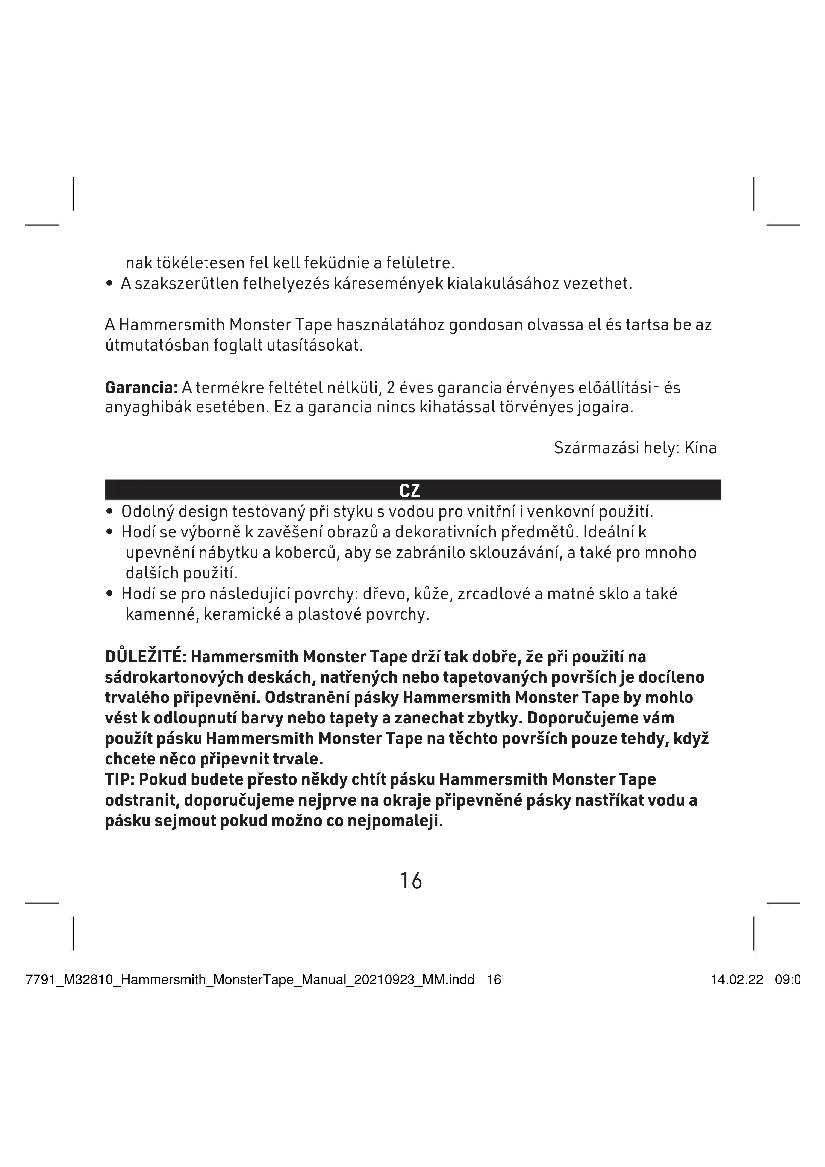 - Hodí se pro následující povrchy: dřevo, kůže, zrcadlové a matné sklo a také kamenné, keramické a plastové povrchy. DŮLEŽITÉ: Hammersmith Monster Tape drží tak dobře, že při použití na sádrokartonových deskách, natřených nebo tapetovaných površích je docíleno trvalého připevnění. Odstranění pásky Hammersmith Monster Tape by mohlo vést k odloupnutí barvy nebo tapety a zanechat zbytky. Doporučujeme vám použít pásku Hammersmith Monster Tape na těchto površích pouze tehdy, když chcete něco připevnit trvale. TIP: Pokud budete přesto někdy chtít pásku Hammersmith Monster Tape odstranit, doporučujeme nejprve na okraje připevněné pásky nastříkat vodu a pásku sejmout pokud možno co nejpomaleji. M27791_M32810_Hammersmith_MonsterTape_Manual_20210923_MM.indd 16M27791_M32810_Hammersmith_MonsterTape_Manual_20210923_MM.indd 16 14.02.22 09:0614.02.22 09:0616