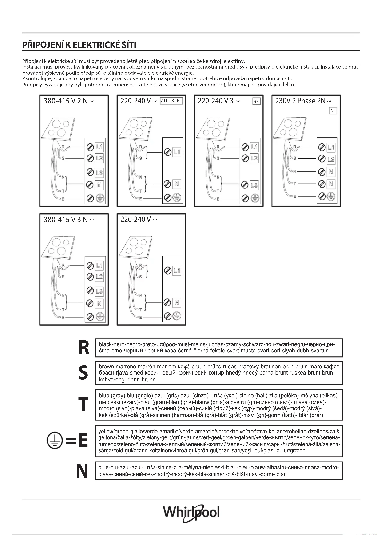 Připojení kelektrické síti musí být provedeno ještě před připojením spotřebiče ke zdroji elektřiny. Instalaci musí provést kvalikovaný pracovník obeznámený splatnými bezpečnostními předpisy apředpisy oelektrické instalaci. Instalace se musí provádět výslovně podle předpisů lokálního dodavatele elektrické energie. Zkontrolujte, zda údaj onapětí uvedený na typovém štítku na spodní straně spotřebiče odpovídá napětí vdomácí síti. Předpisy vyžadují, aby byl spotřebič uzemněn: použijte pouze vodiče (včetně zemnícího), které mají odpovídající délku. blue-blu-azul-azul-μπλε-sinine-zila-mėlyna-niebieski-blau-bleu-blauw-albastru-синьо-плава-modro- plava-синий-синій-көк-modrý-modrý-kék-blå-sininen-blå-blåt-mavi-gorm- blár