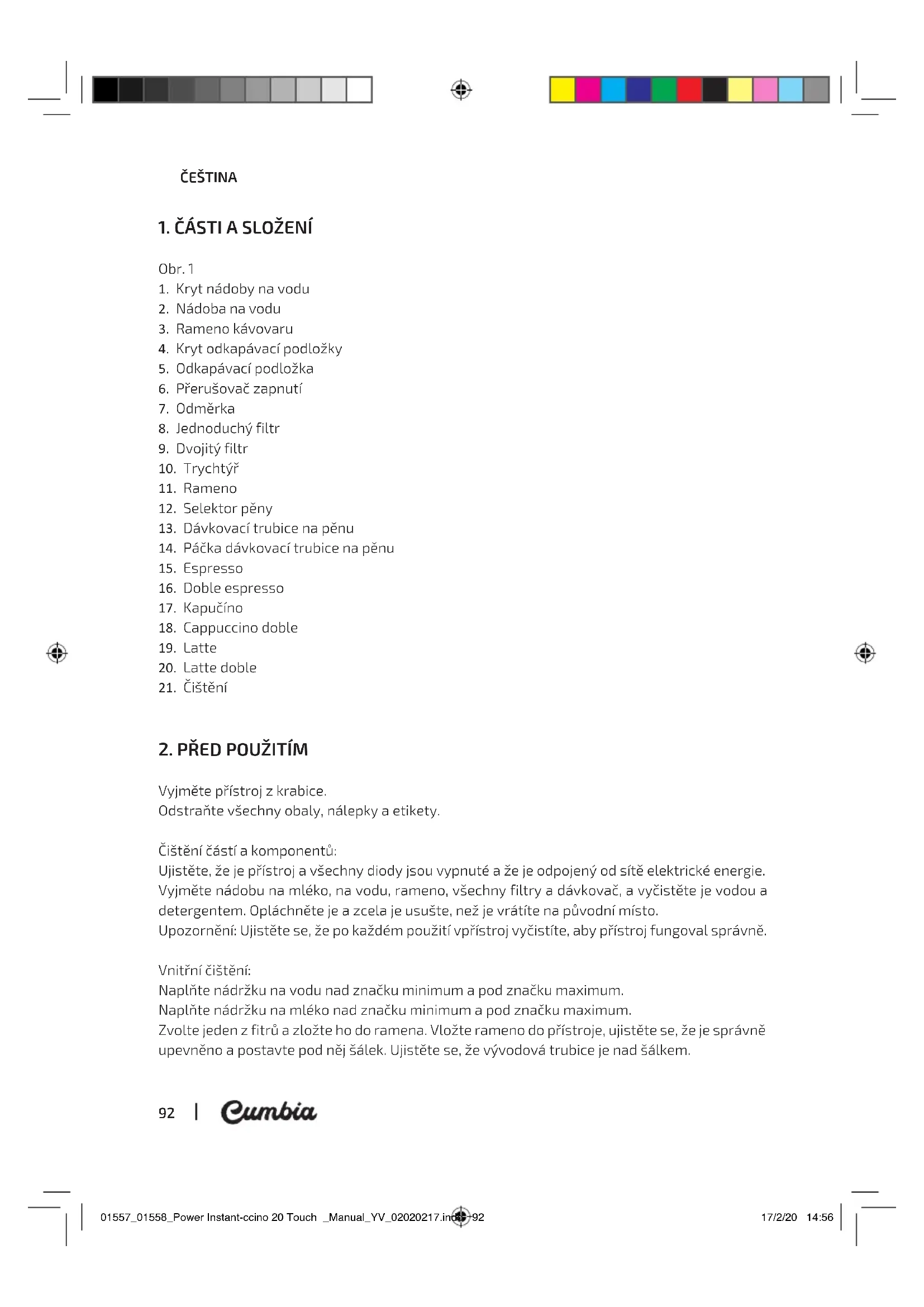 Vyjměte přístroj z krabice. Odstraňte všechny obaly, nálepky a etikety. Čištění částí a komponentů: Ujistěte, že je přístroj a všechny diody jsou vypnuté a že je odpojený od sítě elektrické energie. Vyjměte nádobu na mléko, na vodu, rameno, všechny filtry a dávkovač, a vyčistěte je vodou a detergentem. Opláchněte je a zcela je usušte, než je vrátíte na původní místo. Upozornění: Ujistěte se, že po každém použití vpřístroj vyčistíte, aby přístroj fungoval správně. Vnitřní čištění: Naplňte nádržku na vodu nad značku minimum a pod značku maximum. Naplňte nádržku na mléko nad značku minimum a pod značku maximum. Zvolte jeden z fitrů a zložte ho do ramena. Vložte rameno do přístroje, ujistěte se, že je správně upevněno a postavte pod něj šálek. Ujistěte se, že vývodová trubice je nad šálkem. 01557_01558_Power Instant-ccino 20 Touch _Manual_YV_02020217.indd 9201557_01558_Power Instant-ccino 20 Touch _Manual_YV_02020217.indd 92 17/2/20 14:5617/2/20 14:56POWER INSTANT-CCINO 20 TOUCH WHITE / BLACK