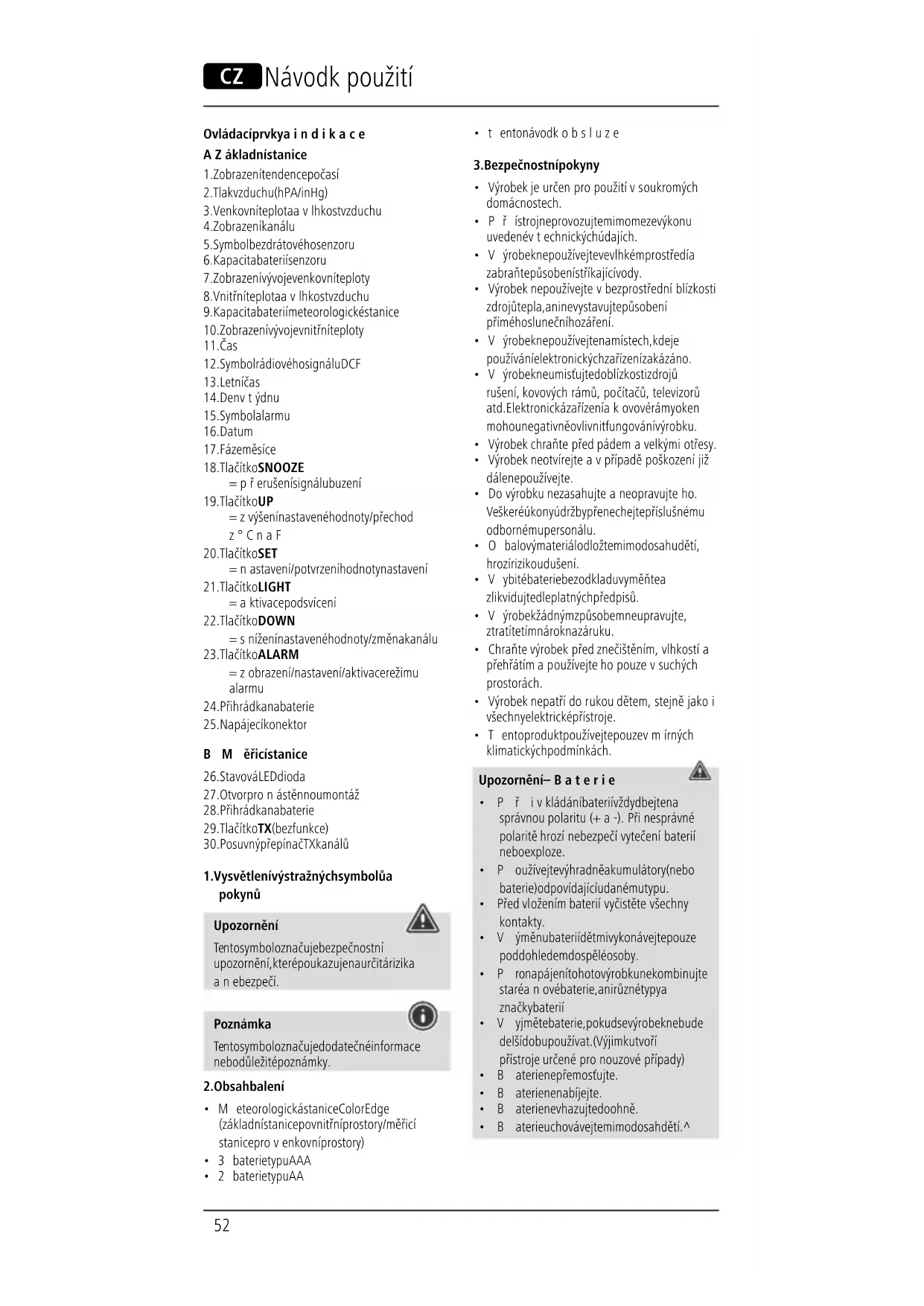 - Tento produkt používejte pouze vmírných klimatických podmínkách. Upozornění –Baterie