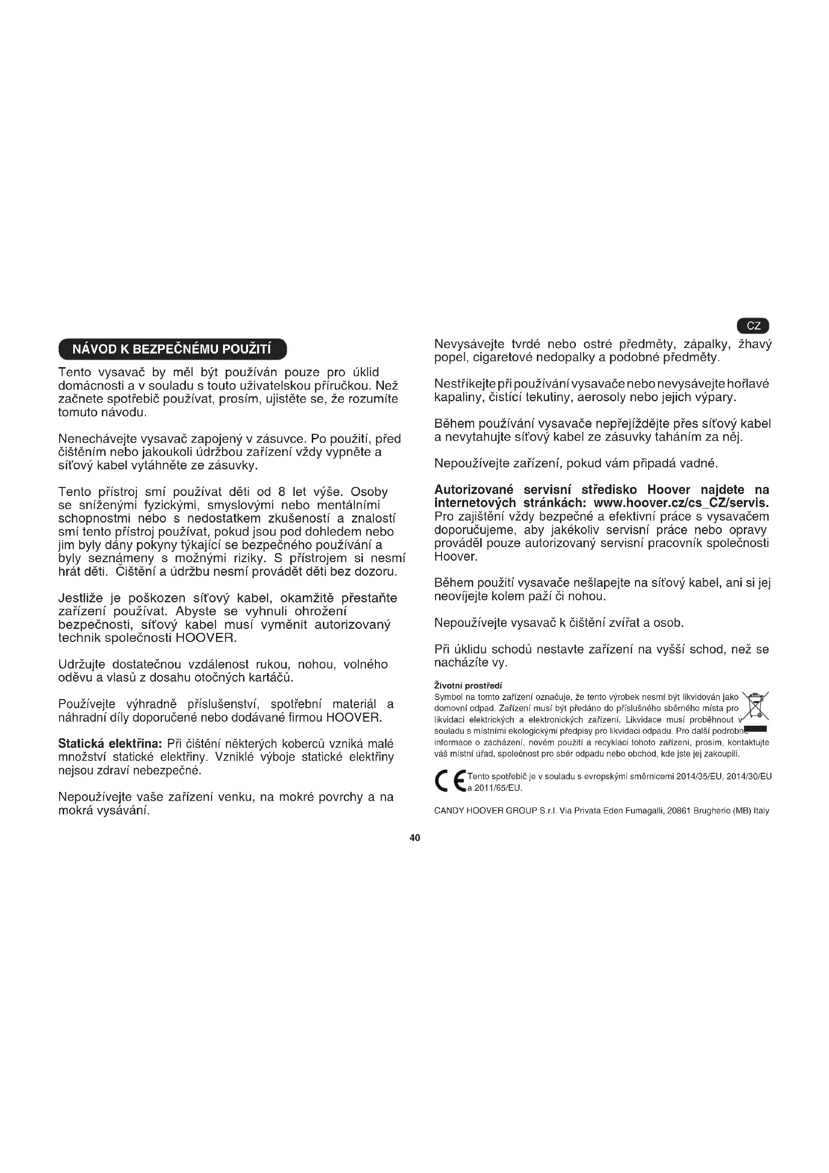 - Szczotka do parkietów* [Z] – Do parkietów i innych delikatnych powierzchni podłogowych. WAŻNE: Nie należy korzystać z turboszczotek mini do odkurzania dywaników z długimi frędzlami, skór zwierzęcych i puszystych dywanów o włosie dłuższym niż 15 mm. Nie trzymać ssawki nieruchomo, gdy szczotka się obraca.40 NÁVOD K BEZPEČNÉMU POUŽITÍ Tento vysavač by měl být používán pouze pro úklid domácnosti a v souladu s touto uživatelskou příručkou. Než začnete spotřebič používat, prosím, ujistěte se, že rozumíte tomuto návodu. Nenechávejte vysavač zapojený v zásuvce. Po použití, před čištěním nebo jakoukoli údržbou zařízení vždy vypněte a síťový kabel vytáhněte ze zásuvky. Tento přístroj smí používat děti od 8 let výše. Osoby se sníženými fyzickými, smyslovými nebo mentálními schopnostmi nebo s nedostatkem zkušeností a znalostí smí tento přístroj používat, pokud jsou pod dohledem nebo jim byly dány pokyny týkající se bezpečného používání a byly seznámeny s možnými riziky. S přístrojem si nesmí hrát děti. Čištění a údržbu nesmí provádět děti bez dozoru. Jestliže je poškozen síťový kabel, okamžitě přestaňte zařízení používat. Abyste se vyhnuli ohrožení bezpečnosti, síťový kabel musí vyměnit autorizovaný technik společnosti HOOVER. Udržujte dostatečnou vzdálenost rukou, nohou, volného oděvu a vlasů z dosahu otočných kartáčů. Používejte výhradně příslušenství, spotřební materiál a náhradní díly doporučené nebo dodávané rmou HOOVER. Statická elektřina: Při čištění některých koberců vzniká malé množství statické elektřiny. Vzniklé výboje statické elektřiny nejsou zdraví nebezpečné. Nepoužívejte vaše zařízení venku, na mokré povrchy a na mokrá vysávání. Nevysávejte tvrdé nebo ostré předměty, zápalky, žhavý popel, cigaretové nedopalky a podobné předměty. Nestříkejte při používání vysavače nebo nevysávejte hořlavé kapaliny, čistící tekutiny, aerosoly nebo jejich výpary. Během používání vysavače nepřejíždějte přes síťový kabel a nevytahujte síťový kabel ze zásuvky taháním za něj. Nepoužívejte zařízení, pokud vám připadá vadné. Autorizované servisní středisko Hoover najdete na internetových stránkách: www.hoover.cz/cs_CZ/servis. Pro zajištění vždy bezpečné a efektivní práce s vysavačem doporučujeme, aby jakékoliv servisní práce nebo opravy prováděl pouze autorizovaný servisní pracovník společnosti Hoover. Během použití vysavače nešlapejte na síťový kabel, ani si jej neovíjejte kolem paží či nohou. Nepoužívejte vysavač k čištění zvířat a osob. Při úklidu schodů nestavte zařízení na vyšší schod, než se nacházíte vy. Životní prostředí Symbol na tomto zařízení označuje, že tento výrobek nesmí být likvidován jako domovní odpad. Zařízení musí být předáno do příslušného sběrného místa pro likvidaci elektrických a elektronických zařízení. Likvidace musí proběhnout v souladu s místními ekologickými předpisy pro likvidaci odpadu. Pro další podrobné informace o zacházení, novém použití a recyklaci tohoto zařízení, prosím, kontaktujte váš místní úřad, společnost pro sběr odpadu nebo obchod, kde jste jej zakoupili. Tento spotřebič je v souladu s evropskými směrnicemi 2014/35/EU, 2014/30/EU a 2011/65/EU. CANDY HOOVER GROUP S.r.l. Via Privata Eden Fumagalli, 20861 Brugherio (MB) Italy CZ41 *Pouze u některých modelů **Vzhled hubice se může lišit dle modelu