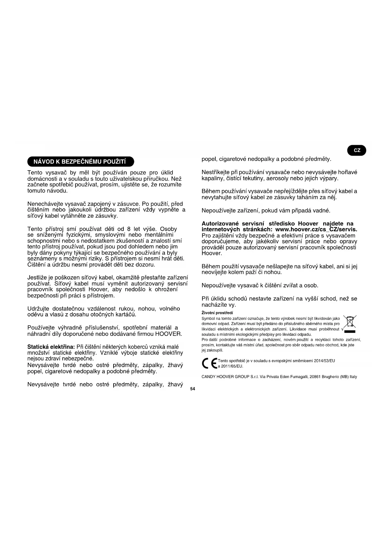 CZĘŚCI ZAPASOWE I MATERIAŁY EKSPLOATACYJNE MARKI HOOVER Należy zawsze wymieniać części na oryginalne części zapasowe rmy Hoover. Można je nabyć w lokalnym serwisie rmy Hoover lub bezpośrednio w rmie Hoover. Przy zamawianiu części zawsze należy podać numer danego modelu. Serwis rmy Hoover Jeśli kiedykolwiek wymagana będzie naprawa, należy skontaktować się z lokalnym punktem serwisowym rmy Hoover. Jakość Fabryki rmy Hoover zostały poddane niezależnej kontroli pod kątem jakości. Nasze produkty zostały wytworzone z wykorzystaniem systemu kontroli jakości spełniającego wymogi normy ISO 9001. GWARANCJA Warunki gwarancji na niniejsze urządzenie są określone przez naszego przedstawiciela w kraju, w którym urządzenie jest sprzedawane. Szczegółowe informacje na temat warunków gwarancji można uzyskać w punkcie, w którym urządzenie zostało nabyte. Przy zgłaszaniu wszelkich roszczeń w ramach gwarancji należy przedstawić dowód sprzedaży lub pokwitowanie. Zastrzegamy sobie możliwość wprowadzania zmian bez wcześniejszego powiadomienia. PL54 NÁVOD K BEZPEČNÉMU POUŽITÍ Tento vysavač by měl být používán pouze pro úklid domácnosti a v souladu s touto uživatelskou příručkou. Než začnete spotřebič používat, prosím, ujistěte se, že rozumíte tomuto návodu. Nenechávejte vysavač zapojený v zásuvce. Po použití, před čištěním nebo jakoukoli údržbou zařízení vždy vypněte a síťový kabel vytáhněte ze zásuvky. Tento přístroj smí používat děti od 8 let výše. Osoby se sníženými fyzickými, smyslovými nebo mentálními schopnostmi nebo s nedostatkem zkušeností a znalostí smí tento přístroj používat, pokud jsou pod dohledem nebo jim byly dány pokyny týkající se bezpečného používání a byly seznámeny s možnými riziky. S přístrojem si nesmí hrát děti. Čištění a údržbu nesmí provádět děti bez dozoru. Jestliže je poškozen síťový kabel, okamžitě přestaňte zařízení používat. Síťový kabel musí vyměnit autorizovaný servisní pracovník společnosti Hoover, aby nedošlo k ohrožení bezpečnosti při práci s přístrojem. Udržujte dostatečnou vzdálenost rukou, nohou, volného oděvu a vlasů z dosahu otočných kartáčů. Používejte výhradně příslušenství, spotřební materiál a náhradní díly doporučené nebo dodávané rmou HOOVER. Statická elektřina: Při čištění některých koberců vzniká malé množství statické elektřiny. Vzniklé výboje statické elektřiny nejsou zdraví nebezpečné. Nevysávejte tvrdé nebo ostré předměty, zápalky, žhavý popel, cigaretové nedopalky a podobné předměty. Nevysávejte tvrdé nebo ostré předměty, zápalky, žhavý popel, cigaretové nedopalky a podobné předměty. Nestříkejte při používání vysavače nebo nevysávejte hořlavé kapaliny, čistící tekutiny, aerosoly nebo jejich výpary. Během používání vysavače nepřejíždějte přes síťový kabel a nevytahujte síťový kabel ze zásuvky taháním za něj. Nepoužívejte zařízení, pokud vám připadá vadné. Autorizované servisní středisko Hoover najdete na internetových stránkách: www.hoover.cz/cs_CZ/servis. Pro zajištění vždy bezpečné a efektivní práce s vysavačem doporučujeme, aby jakékoliv servisní práce nebo opravy prováděl pouze autorizovaný servisní pracovník společnosti Hoover. Během použití vysavače nešlapejte na síťový kabel, ani si jej neovíjejte kolem paží či nohou. Nepoužívejte vysavač k čištění zvířat a osob. Při úklidu schodů nestavte zařízení na vyšší schod, než se nacházíte vy. Životní prostředí Symbol na tomto zařízení označuje, že tento výrobek nesmí být likvidován jako domovní odpad. Zařízení musí být předáno do příslušného sběrného místa pro likvidaci elektrických a elektronických zařízení. Likvidace musí proběhnout v souladu s místními ekologickými předpisy pro likvidaci odpadu. Pro další podrobné informace o zacházení, novém použití a recyklaci tohoto zařízení, prosím, kontaktujte váš místní úřad, společnost pro sběr odpadu nebo obchod, kde jste jej zakoupili. Tento spotřebič je v souladu s evropskými směrnicemi 2014/53/EU a 2011/65/EU. CANDY HOOVER GROUP S.r.l. Via Privata Eden Fumagalli, 20861 Brugherio (MB) Italy CZ55