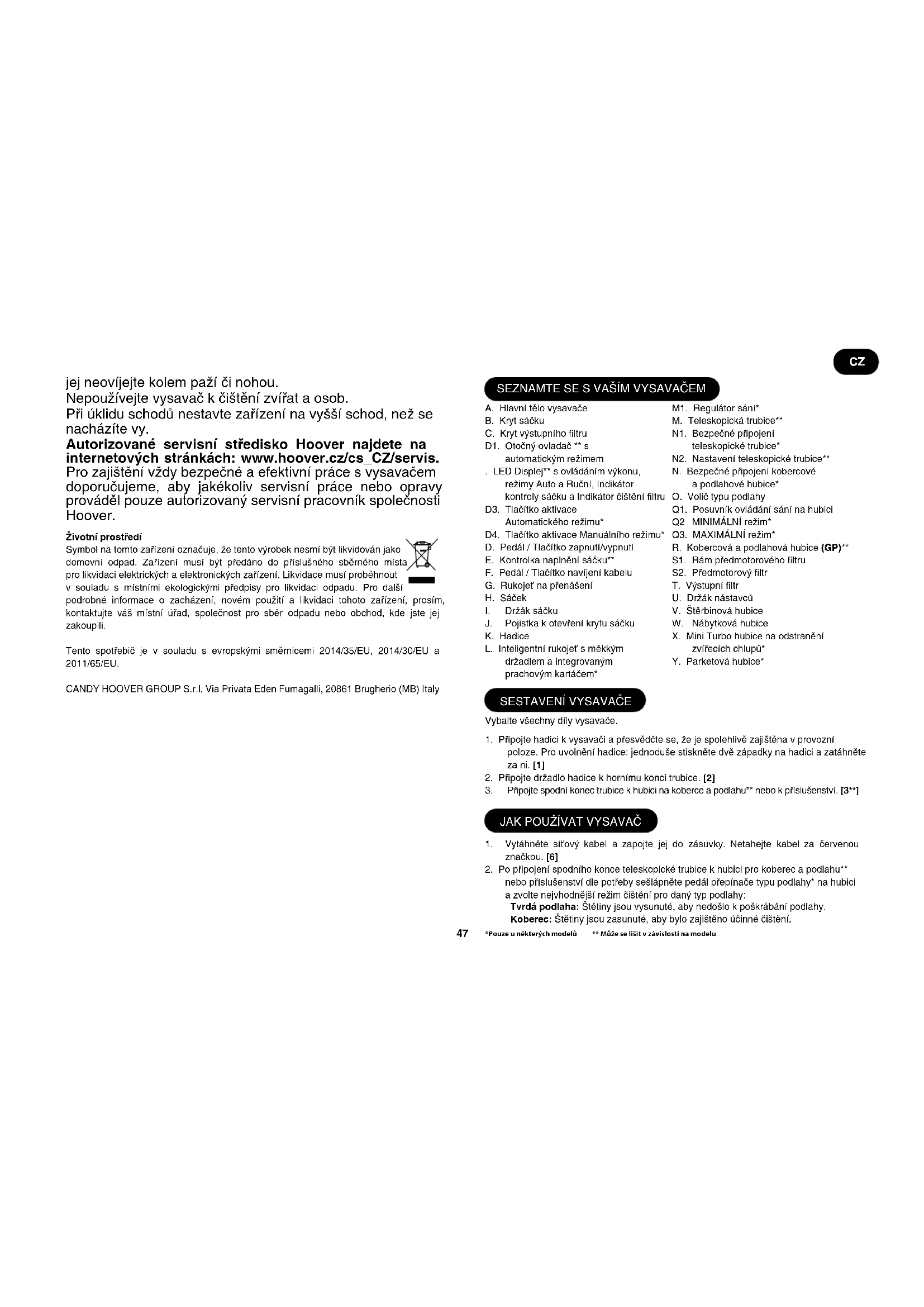 CZĘŚCI ZAPASOWE I MATERIAŁY EKSPLOATACYJNE MARKI HOOVER Należy zawsze wymieniać części na oryginalne części zapasowe rmy Hoover. Można je nabyć w lokalnym serwisie rmy Hoover lub bezpośrednio w rmie Hoover. Przy zamawianiu części zawsze należy podać numer danego modelu. Serwis rmy Hoover Jeśli kiedykolwiek wymagana będzie naprawa, należy skontaktować się z lokalnym punktem serwisowym rmy Hoover. Jakość Fabryki rmy HOOVER zostały poddane niezależnej kontroli pod kątem jakości. Nasze produkty zostały wytworzone z wykorzystaniem systemu kontroli jakości spełniającego wymogi normy ISO 9001. GWARANCJA Warunki gwarancji na niniejsze urządzenie są określone przez naszego przedstawiciela w kraju, w którym urządzenie jest sprzedawane. Szczegółowe informacje na temat warunków gwarancji można uzyskać w punkcie, w którym urządzenie zostało nabyte. Przy zgłaszaniu wszelkich roszczeń w ramach gwarancji należy przedstawić dowód sprzedaży lub pokwitowanie. Zastrzegamy sobie możliwość wprowadzania zmian bez wcześniejszego powiadomienia. NÁVOD K BEZPEČNÉMU POUŽITÍ Tento vysavač by měl být používán pouze pro úklid domácnosti a v souladu s touto uživatelskou příručkou. Než začnete spotřebič používat, prosím, ujistěte se, že rozumíte tomuto návodu. Nenechávejte vysavač zapojený v zásuvce. Po použití, před čištěním nebo jakoukoli údržbou zařízení vždy vypněte a síťový kabel vytáhněte ze zásuvky. Tento přístroj smí používat děti od 8 let výše. Osoby se sníženými fyzickými, smyslovými nebo mentálními schopnostmi nebo s nedostatkem zkušeností a znalostí smí tento přístroj používat, pokud jsou pod dohledem nebo jim byly dány pokyny týkající se bezpečného používání a byly seznámeny s možnými riziky. S přístrojem si nesmí hrát děti. Čištění a údržbu nesmí provádět děti bez dozoru. Jestliže je poškozen síťový kabel, okamžitě přestaňte zařízení používat. Abyste se vyhnuli ohrožení bezpečnosti, síťový kabel musí vyměnit autorizovaný technik společnosti HOOVER. Udržujte dostatečnou vzdálenost rukou, nohou, volného oděvu a vlasů z dosahu otočných kartáčů. Používejte výhradně příslušenství, spotřební materiál a náhradní díly doporučené nebo dodávané rmou HOOVER. Statická elektřina: Při čištění některých koberců vzniká malé množství statické elektřiny. Vzniklé výboje statické elektřiny nejsou zdraví nebezpečné. Nepoužívejte vaše zařízení venku, nebo na mokré povrchy a na mokrá vysávání. Nevysávejte tvrdé nebo ostré předměty, zápalky, žhavý popel, cigaretové nedopalky a podobné předměty. Nestříkejte při používání vysavače nebo nevysávejte hořlavé kapaliny, čistící tekutiny, aerosoly nebo jejich výpary. Během používání vysavače nepřejíždějte přes síťový kabel a nevytahujte síťový kabel ze zásuvky taháním za něj. Nepoužívejte zařízení, pokud vám připadá vadné. Během použití vysavače nešlapejte na síťový kabel, ani si CZ47 jej neovíjejte kolem paží či nohou. Nepoužívejte vysavač k čištění zvířat a osob. Při úklidu schodů nestavte zařízení na vyšší schod, než se nacházíte vy. Autorizované servisní středisko Hoover najdete na internetových stránkách: www.hoover.cz/cs_CZ/servis. Pro zajištění vždy bezpečné a efektivní práce s vysavačem doporučujeme, aby jakékoliv servisní práce nebo opravy prováděl pouze autorizovaný servisní pracovník společnosti Hoover. Životní prostředí Symbol na tomto zařízení označuje, že tento výrobek nesmí být likvidován jako domovní odpad. Zařízení musí být předáno do příslušného sběrného místa pro likvidaci elektrických a elektronických zařízení. Likvidace musí proběhnout v souladu s místními ekologickými předpisy pro likvidaci odpadu. Pro další podrobné informace o zacházení, novém použití a likvidaci tohoto zařízení, prosím, kontaktujte váš místní úřad, společnost pro sběr odpadu nebo obchod, kde jste jej zakoupili. Tento spotřebič je v souladu s evropskými směrnicemi 2014/35/EU, 2014/30/EU a 2011/65/EU. CANDY HOOVER GROUP S.r.l. Via Privata Eden Fumagalli, 20861 Brugherio (MB) Italy