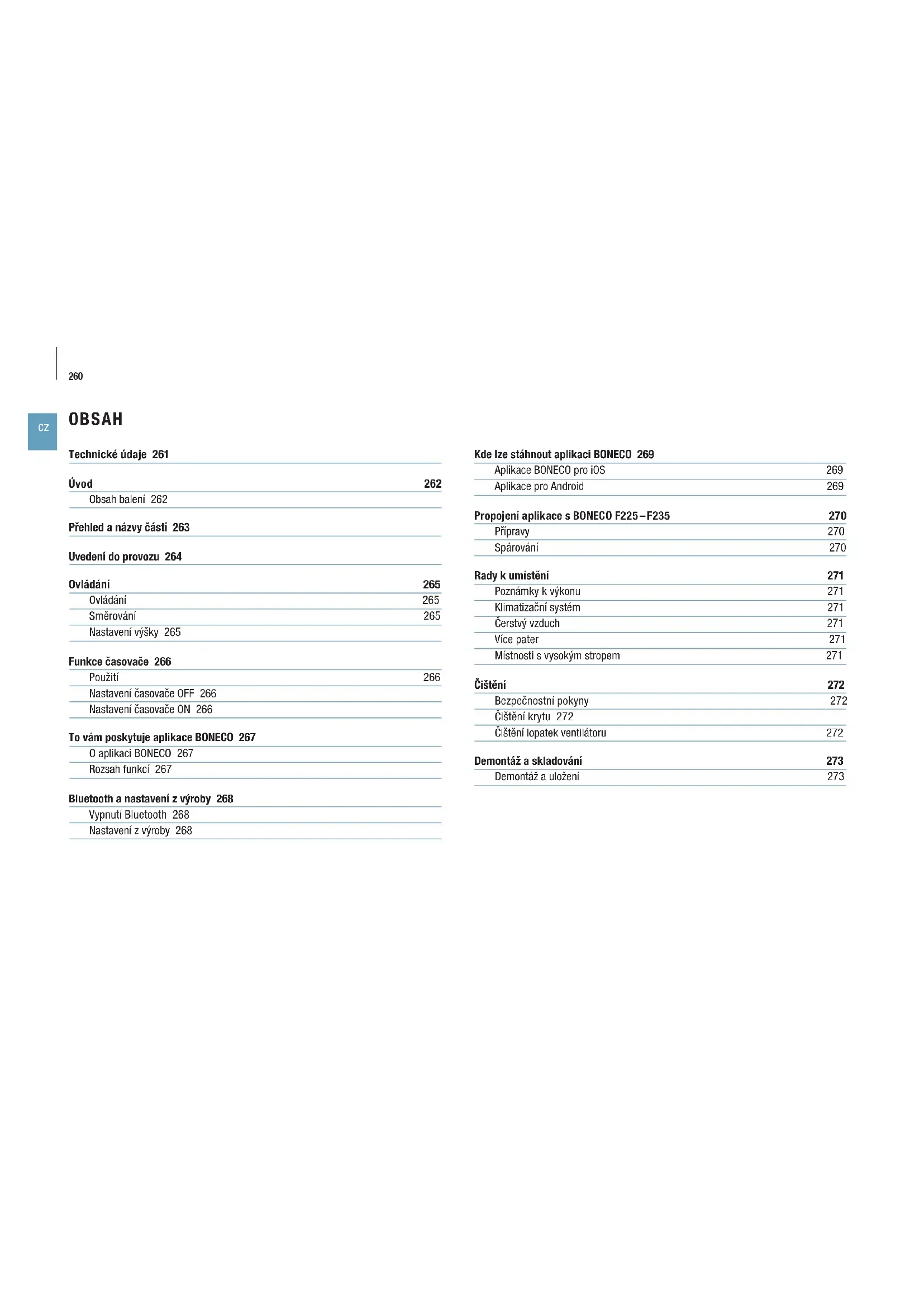 OBSAH Technické údaje 261 Úvod 262 Obsah balení 262 Přehled anázvy částí 263 Uvedení do provozu 264 Ovládání 265 Ovládání 265 Směrování 265 Nastavení výšky 265 Funkce časovače 266 Použití 266 Nastavení časovače OFF 266 Nastavení časovače ON 266 To vám poskytuje aplikace BONECO 267 Oaplikaci BONECO 267 Rozsah funkcí 267 Bluetooth a nastavení z výroby 268 Vypnutí Bluetooth 268 Nastavení z výroby 268 Kde lze stáhnout aplikaci BONECO 269 Aplikace BONECO pro iOS 269 Aplikace pro Android 269 Propojení aplikace sBONECO F225 – F235 270 Přípravy 270 Spárování 270 Rady kumístění 271 Poznámky kvýkonu 271 Klimatizační systém 271 Čerstvý vzduch 271 Více pater 271 Místnosti svysokým stropem 271 Čištění 272 Bezpečnostní pokyny 272 Čištění krytu 272 Čištění lopatek ventilátoru 272 Demontáž askladování 273 Demontáž a uložení 273261