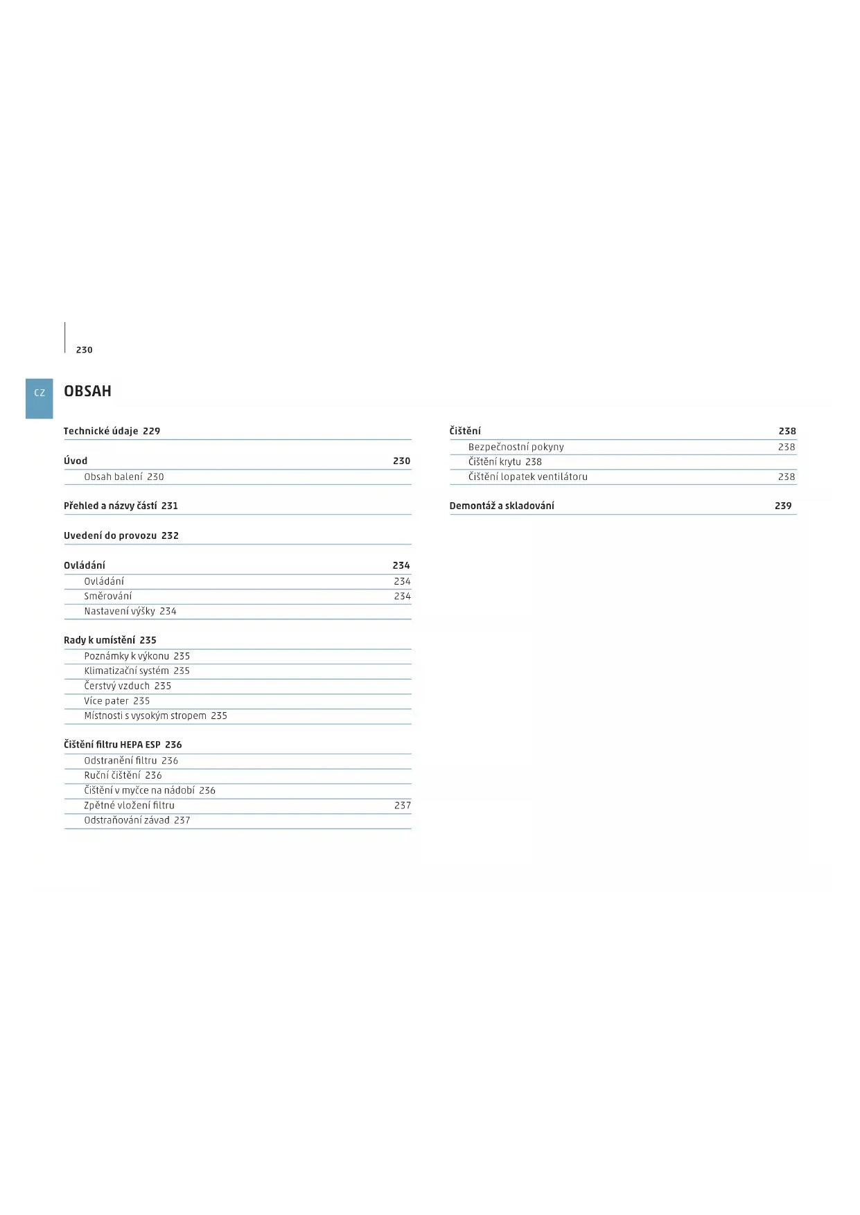 OBSAH Technické údaje 229 Úvod 230 Obsah balení 230 Přehled anázvy částí 231 Uvedení do provozu 232 Ovládání 234 Ovládání 234 Směrování 234 Nastavení výšky 234 Rady kumístění 235 Poznámky kvýkonu 235 Klimatizační systém 235 Čerstvý vzduch 235 Více pater 235 Místnosti svysokým stropem 235 Čištění filtru HEPA ESP 236 Odstranění filtru 236 Ruční čištění 236 Čištění v myčce na nádobí 236 Zpětné vložení filtru 237 Odstraňování závad 237 Čištění 238 Bezpečnostní pokyny 238 Čištění krytu 238 Čištění lopatek ventilátoru 238 Demontáž askladování 239231