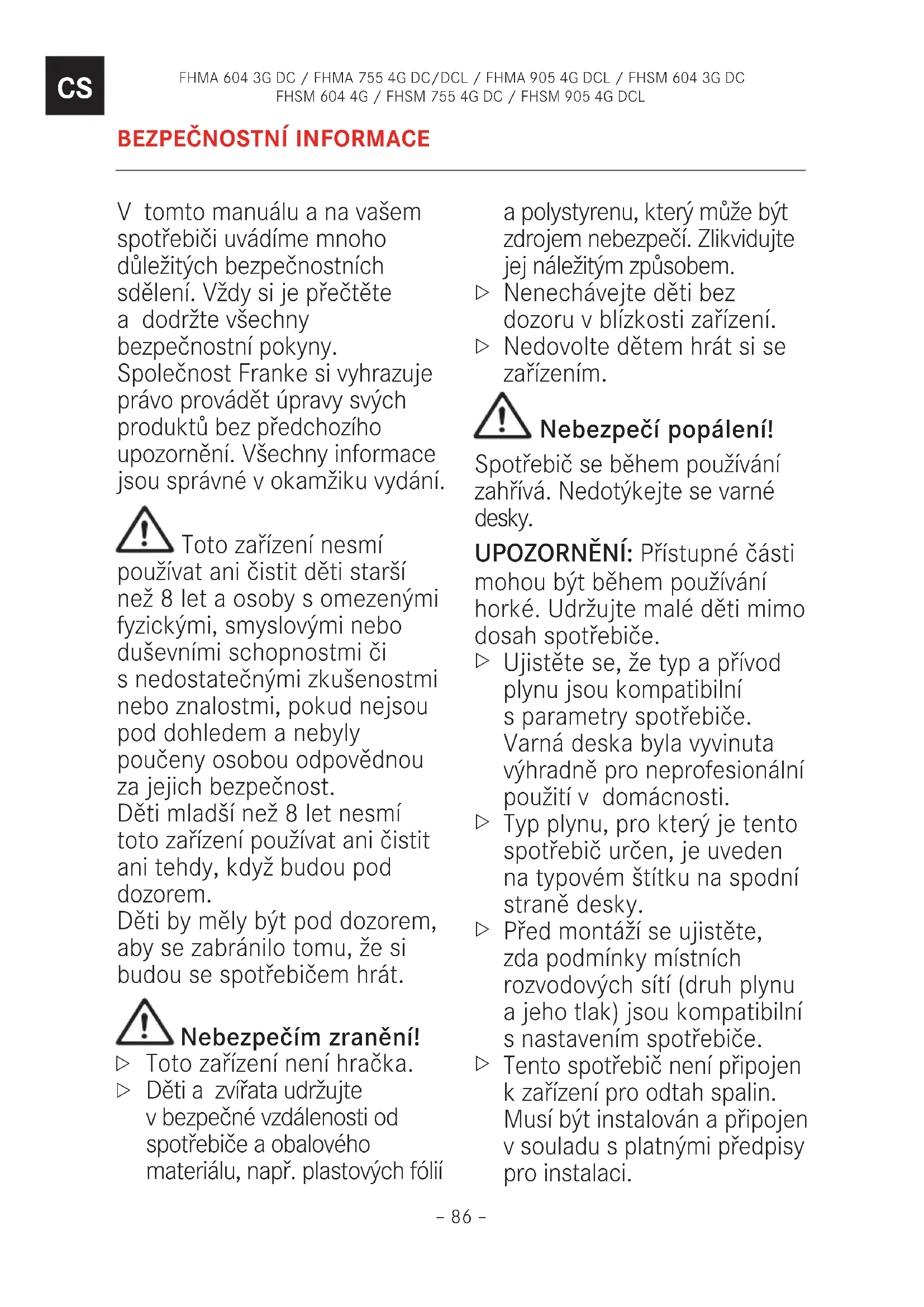 Spotřebič neprovozujte svnějším časovým spínačem nebo samostatným systémem pro vzdálené ovládání. UPOZORNĚNÍ: Na průběh vaření je potřeba dohlížet. Krátkodobé vaření vyžaduje nepřetržitý dozor.FHMA 604 3G DC / FHMA 755 4G DC/DCL / FHMA 905 4G DCL / FHSM 604 3G DCFHSM 604 4G / FHSM 755 4G DC / FHSM 905 4G DCL – 88 –