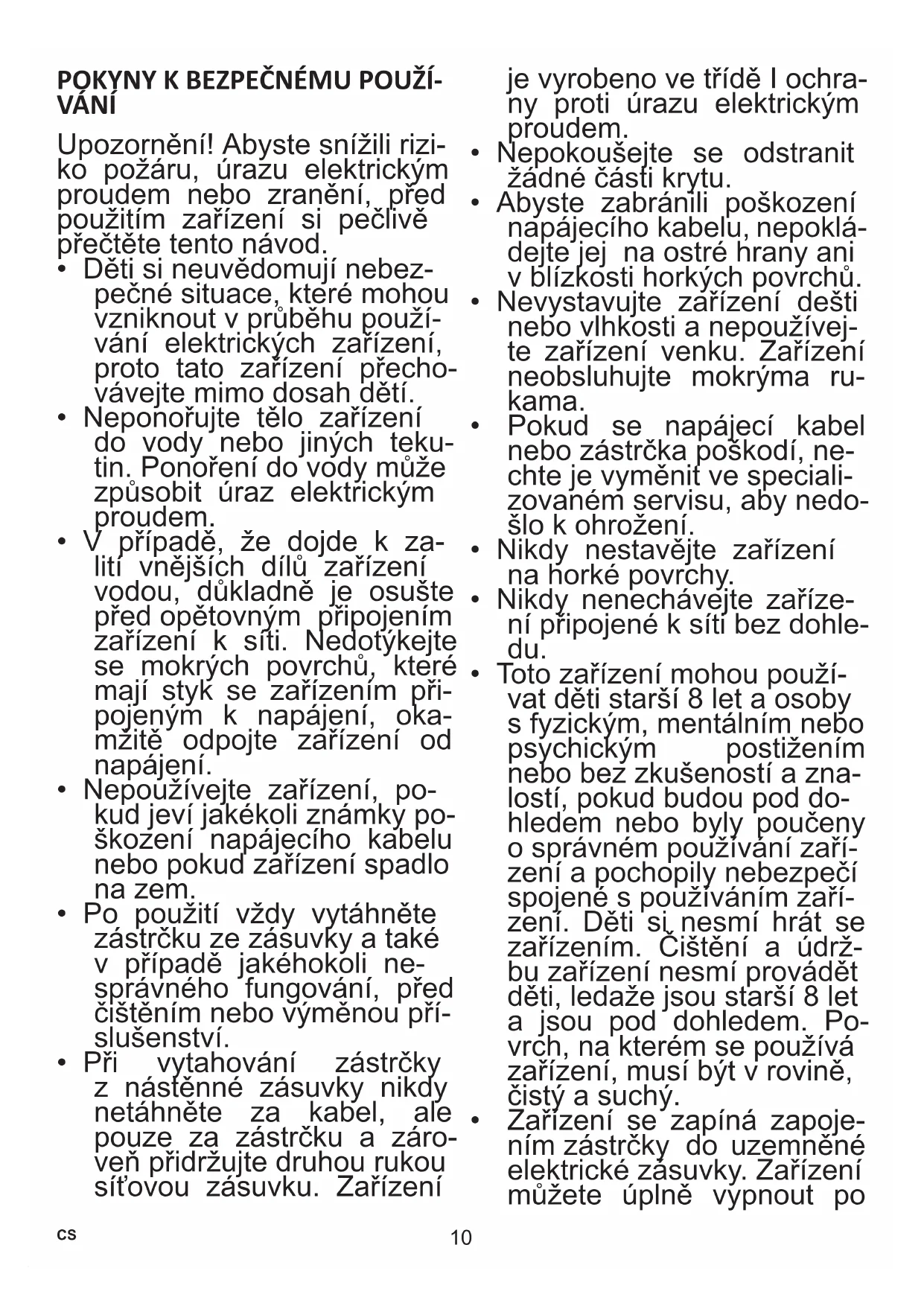 - Toto zařízení mohou použí- vat děti starší 8 let a osoby s fyzickým, mentálním nebo psychickým postižením nebo bez zkušeností a zna- lostí, pokud budou pod do- hledem nebo byly poučeny o správném používání zaří- zení a pochopily nebezpečí spojené s používáním zaří- zení. Děti si nesmí hrát se zařízením. Čištění a údrž- bu zařízení nesmí provádět děti, ledaže jsou starší 8 let a jsou pod dohledem. Po- vrch, na kterém se používá zařízení, musí být v rovině, čistý a suchý.