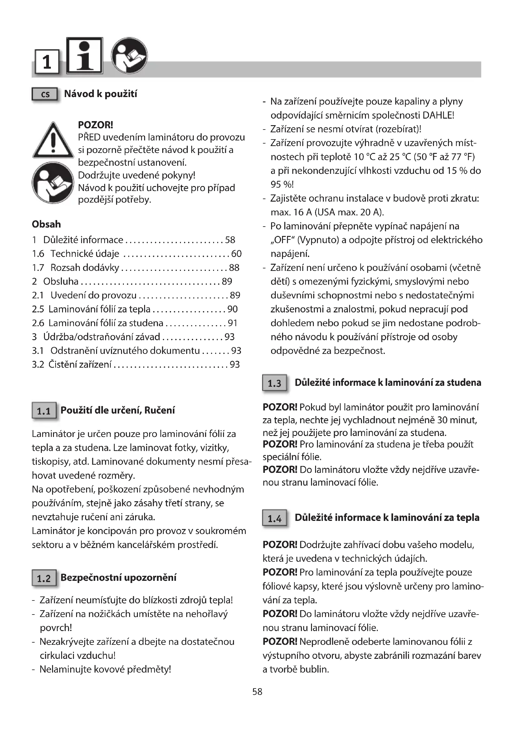 Návod k použití POZOR! PŘED uvedením laminátoru do provozu si pozorně přečtěte návod k použití a bezpečnostní ustanovení. Dodržujte uvedené pokyny! Návod k použití uchovejte pro případ pozdější potřeby. Obsah 1 Důležité informace . . . . . . . . . . . . . . . . . . . . . . . . 58