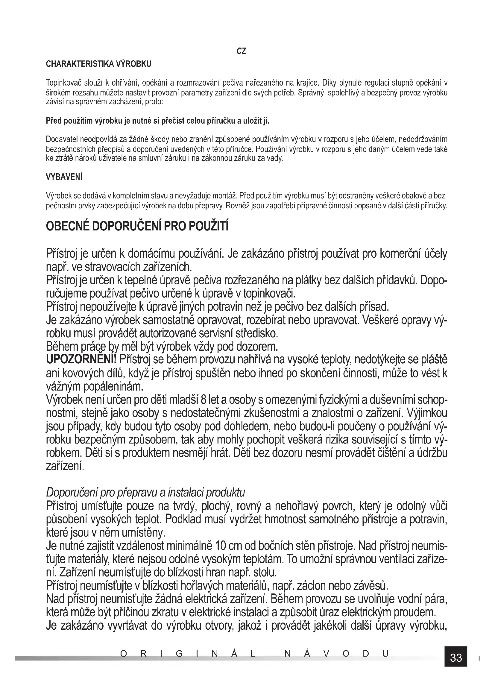 Přístroj je určen k domácímu používání. Je zakázáno přístroj používat pro komerční účely např. ve stravovacích zařízeních. Přístroj je určen k tepelné úpravě pečiva rozřezaného na plátky bez dalších přídavků. Dopo- ručujeme používat pečivo určené k úpravě v topinkovači. Přístroj nepoužívejte k úpravě jiných potravin než je pečivo bez dalších přísad. Je zakázáno výrobek samostatně opravovat, rozebírat nebo upravovat. Veškeré opravy vý- robku musí provádět autorizované servisní středisko. Během práce by měl být výrobek vždy pod dozorem. UPOZORNĚNÍ! Přístroj se během provozu nahřívá na vysoké teploty, nedotýkejte se pláště ani kovových dílů, když je přístroj spuštěn nebo ihned po skončení činnosti, může to vést k vážným popáleninám. Výrobek není určen pro děti mladší 8 let a osoby s omezenými fyzickými a duševními schop- nostmi, stejně jako osoby s nedostatečnými zkušenostmi a znalostmi o zařízení. Výjimkou jsou případy, kdy budou tyto osoby pod dohledem, nebo budou-li poučeny o používání vý- robku bezpečným způsobem, tak aby mohly pochopit veškerá rizika související s tímto vý- robkem. Děti si s produktem nesmějí hrát. Děti bez dozoru nesmí provádět čištění a údržbu zařízení. Doporučení pro přepravu a instalaci produktu Přístroj umísťujte pouze na tvrdý, plochý, rovný a nehořlavý povrch, který je odolný vůči působení vysokých teplot. Podklad musí vydržet hmotnost samotného přístroje a potravin, které jsou v něm umístěny. Je nutné zajistit vzdálenost minimálně 10 cm od bočních stěn přístroje. Nad přístroj neumis- ťujte materiály, které nejsou odolné vysokým teplotám. To umožní správnou ventilaci zaříze- ní. Zařízení neumísťujte do blízkosti hran např. stolu. Přístroj neumísťujte v blízkosti hořlavých materiálů, např. záclon nebo závěsů. Nad přístroj neumisťujte žádná elektrická zařízení. Během provozu se uvolňuje vodní pára, která může být příčinou zkratu v elektrické instalaci a způsobit úraz elektrickým proudem. Je zakázáno vyvrtávat do výrobku otvory, jakož i provádět jakékoli další úpravy výrobku,34