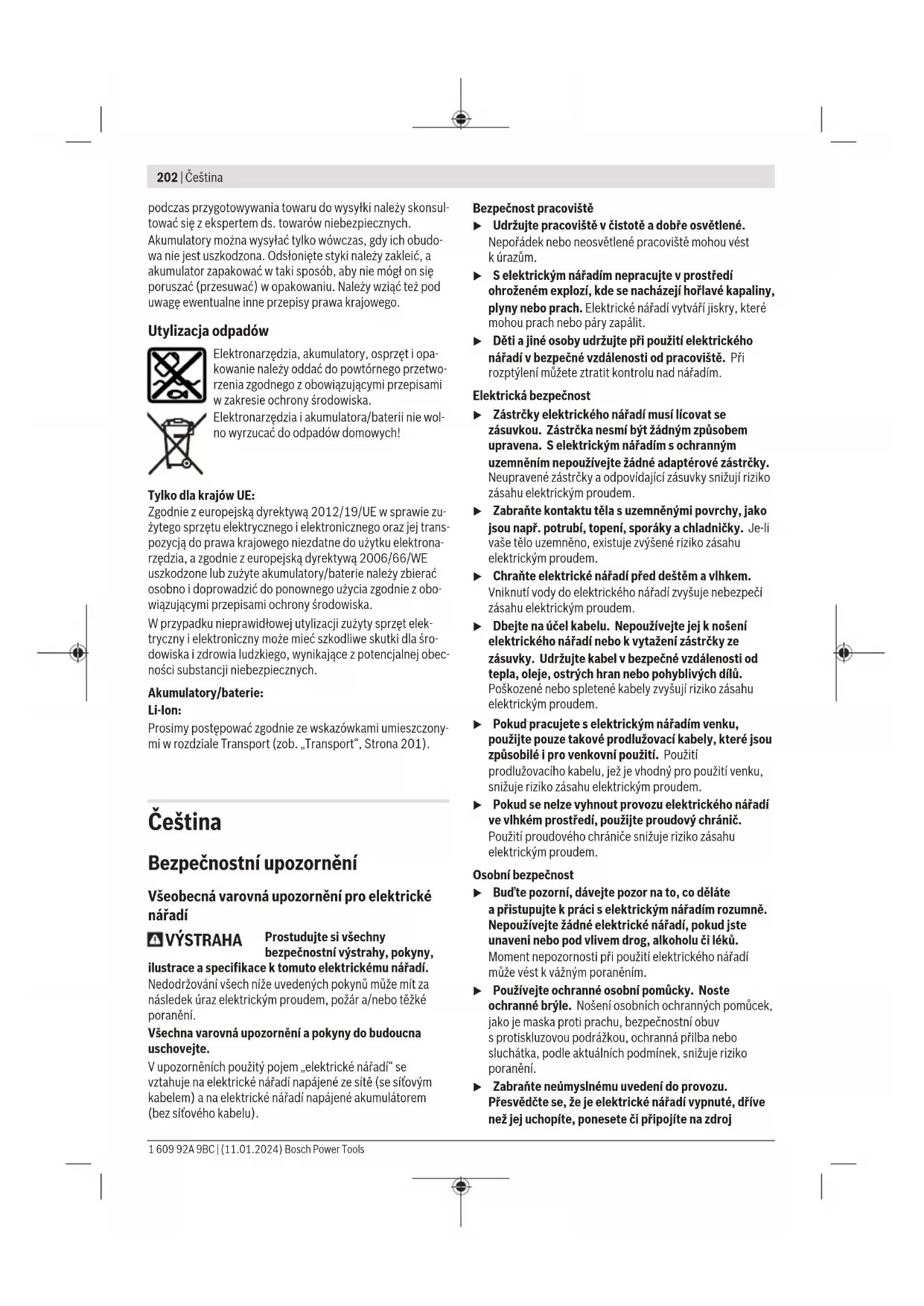 Měřeno při 20–25°C sakumulátoremProCORE18V 8.0Ah. B) Vzávislosti na použitém akumulátoru C) Omezený výkon při teplotách <0°C. Hodnoty se mohou podle výrobku lišit amají na ně vliv podmínky použití aprostředí. Další informace najdete na www.bosch-professional.com/wac. Přípustné rozměry obrobku (maximální/minimální): (viz „Přípustné rozměry obrobku“, Stránka212) Informace ohluku Hodnoty hlučnosti zjištěné podle ENIEC62841-3-9. Hladina hluku elektrického nářadí stanovená za použití váhového filtruA činí typicky: hladina akustického tlaku 97dB(A); hladina akustického výkonu 106dB(A). Nejistota K=3dB. Noste chrániče sluchu! Hodnota hluku, uvedená vtěchto pokynech, byla změřena pomocí normované měřicí metody alze ji použít pro vzájemné porovnání elektronářadí. Hodí se ipro předběžný odhad zatížení hlukem. Uvedená hodnota hlučnosti reprezentuje hlavní použití elektronářadí. Pokud se ovšem bude elektronářadí používat pro jiné práce, sjinými nástroji nebo snedostatečnou údržbou, může se úroveň hlučnosti lišit. To může zatížení hlukem po celou pracovní dobu zřetelně zvýšit. Pro přesný odhad zatížení hlukem by měly být zohledněny idoby, kdy je nářadí vypnuté nebo sice běží, ale fakticky se nepoužívá. To může zatížení hlukem po celou pracovní dobu výrazně snížit. Akumulátor Bosch prodává akumulátorové elektrické nářadí ibez akumulátoru. Na obale je uvedené, zda je součástí dodávky elektrického nářadí akumulátor. Nabíjení akumulátoru u Používejte pouze nabíječky uvedené vtechnických údajích. Jen tyto nabíječky jsou přizpůsobené pro lithium-iontový akumulátor používaný svaším elektronářadím. Upozornění: Lithium-iontové akumulátory se na základě mezinárodních dopravních předpisů dodávají částečně nabité. Aby byl zaručen plný výkon akumulátoru, před prvním použitím akumulátor úplně nabijte. Nasazení akumulátoru Vložte nabitý akumulátor do uchycení akumulátoru tak, aby citelně zaskočil. Vyjmutí akumulátoru Pro vyjmutí akumulátoru stiskněte odjišťovací tlačítko avytáhněte akumulátor. Nepoužívejte přitom násilí. Akumulátorje opatřený 2stupni zajištění, které mají zabránit vypadnutí akumulátoru při neúmyslném stisknutí odjišťovacího tlačítka. Pokud je akumulátor nasazený do elektrického nářadí, drží ho vpříslušné poloze pružina. Ukazatel stavu nabití akumulátoru Upozornění: Ne každý typ akumulátoru má ukazatel stavu nabití. Zelené LED ukazatele stavu nabití akumulátoru indikují stav nabití akumulátoru. Zbezpečnostních důvodů je zjištění stavu nabití možné pouze při vypnutém elektronářadí. Bosch Power Tools 1 609 92A 9BC | (11.01.2024)208 | Čeština Pro zobrazení stavu nabití stiskněte tlačítko ukazatele stavu nabití nebo . Je to možné také při vyjmutém akumulátoru. Pokud po stisknutí tlačítka ukazatele stavu nabití nesvítí žádná LED, je akumulátor vadný amusí se vyměnit. Typ akumulátoru GBA 18V... LED Kapacita Trvale svítí 3 zelené 60–100% Trvale svítí 2 zelené 30–60% Trvale svítí 1 zelená 5–30% Bliká 1 zelená 0–5% Typ akumulátoru ProCORE18V... LED Kapacita Trvale svítí 5 zelených 80–100% Trvale svítí 4 zelené 60–80% Trvale svítí 3 zelené 40–60% Trvale svítí 2 zelené 20–40% Trvale svítí 1 zelená 5–20% Bliká 1 zelená 0–5% Upozornění pro optimální zacházení s akumulátorem Akumulátor chraňte před vlhkostí a vodou. Akumulátor skladujte pouze v teplotním rozmezí od −20 °C do 50 °C. Nenechávejte akumulátor ležet např. v létě v autě. Příležitostně vyčistěte větrací otvory akumulátoru měkkým, čistým a suchým štětcem. Výrazně kratší doba chodu po nabití ukazuje, že je akumulátor opotřebovaný a musí se vyměnit. Dodržujte pokyny pro likvidaci. Montáž u Před každou prací na elektronářadí (např. údržba, výměna nástrojů) apři jeho přepravě auskladnění vyjměte akumulátor. Při neúmyslném stisknutí vypínače hrozí nebezpečí poranění. Obsah dodávky Podívejte se na zobrazení obsahu dodávky na začátku návodu kobsluze. Před prvním uvedením elektronářadí do provozu zkontrolujte, zda jste obdrželi všechny níže uvedené díly: – Pokosová pila se zákluzem snamontovaným pilovým kotoučem – Aretační kolečko (45) – Nastavitelná dorazová lišta (26) – Šroubová svěrka (41) – Klíč na vnitřní šestihran/plochý šroubovák (43) – Vak na prach (37) – Opěrky obrobku (24) (2kusy) Upozornění: Zkontrolujte elektronářadí pro případná poškození. Před dalším použitím elektronářadí musíte ochranné přípravky nebo lehce poškozené díly pečlivě prověřit na jejich bezvadnou aurčenou funkci. Zkontrolujte, zda pohyblivé díly bezvadně fungují anesvírají se, či zda nejsou díly poškozené. Veškeré díly musí být správně namontovány amusí splňovat všechny podmínky, aby byl zaručen bezvadný provoz. Poškozené ochranné přípravky adíly musíte nechat opravit nebo vyměnit voprávněném servisu. Montáž jednotlivých dílů – Vyjměte všechny dodané díly opatrně zjejich obalu. – Odstraňte veškerý balicí materiál zelektronářadí azdodaného příslušenství. – Pro usnadnění práce při montáži dodaných prvků nářadí dbejte na to, aby elektrické nářadí bylo vpřepravní poloze. Montáž opěrek obrobku (viz obrázek A1) Opěrky obrobku (24) lze umístit vlevo, vpravo nebo vpředu na elektrické nářadí. Flexibilní násuvný systém umožňuje spoustu variant prodloužení nebo rozšíření (viz obrázekG). – Opěrku obrobku (24) zasuňte podle potřeby do uchycení (47) na elektrickém nářadí nebo do uchycení (48) druhé opěrky obrobku. u Při př