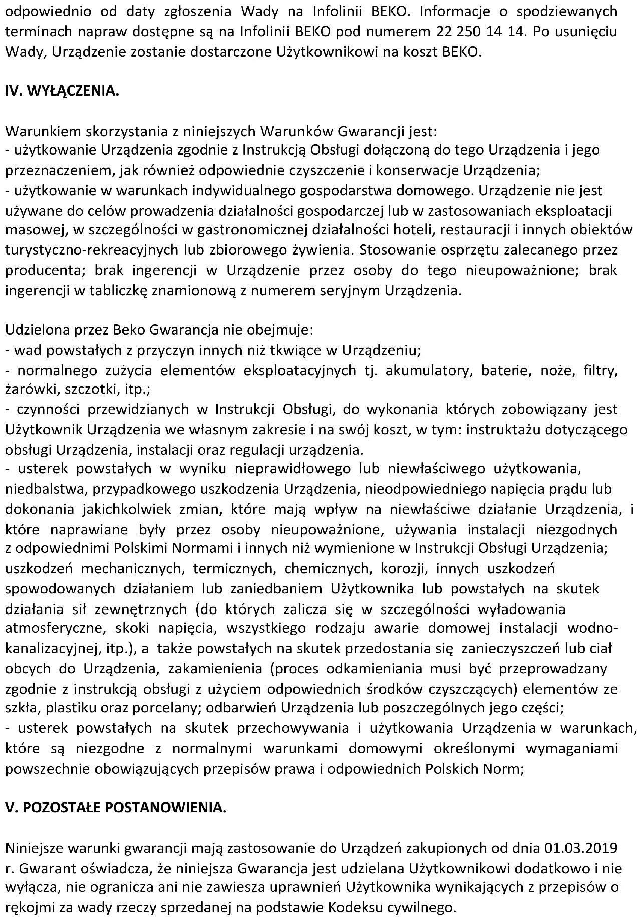 a) Platný a čitelný prodejní doklad, který obsahuje datum prodeje, model spotřebiče a označení prodejce opravňuje uživatele využít záruku na výrobek v souladu s ustanoveními Občanského zákoníku, v platném znění. b) Není-li stanoveno jinak, je záruční doba na výrobek 24 měsíců. Začíná plynout ode dne převzetí věci kupujícím vyjma případu, kdy je nutné uvedení do provozu oprávněnou firmou. V tom případě začne záruční doba plynout ode dne uvedení výrobku do provozu. Výrobky vyžadující odborné zapojení: plynové a kombinované sporáky a varné desky, dále všechny spotřebiče, které nejsou vybaveny přívodním elektrickým kabelem zakončeným vidlicí. Zapojení spotřebiče je službou hrazenou zákazníkem. Potvrzení je nutné uschovat. Dovozce nezodpovídá za poškození vzniklé chybnou instalací a chybným zapojením výrobku. c) Záruka vyplývající z těchto záručních podmínek může být uplatněna pouze na území České republiky a týká se pouze a výhradně spotřebičů dovezených do ČR prostřednictvím naší společnosti, BEKO Spolka Akcyjna, org. sl. Lužná 716/2, 160 00 Praha 6 – Vokovice, která je oficiálním zastoupením značky BEKO pro Českou republiku. d) Záruka je poskytována kupujícímu (konečnému spotřebiteli) v souladu se zákonem č. 634/1992 Sb., o ochraně spotřebitele v platném znění, na výrobek sloužící běžnému používání v domácnosti. Výrobek není určen k průmyslovému použití a poskytování služeb. Spotřebiče, které nejsou používány v domácnosti, nejsou předmětem záruky (hotelová a restaurační zařízení, školská zařízení, úklidové firmy, atd…) e) Práva ze zodpovědnosti za vady výrobku se uplatňují u prodávajícího. Záruční oprava se vztahuje výhradně na závady, které vzniknou v době platnosti záruční lhůty a to výrobní vadou. Takto vzniklé závady je oprávněn odstranit pouze autorizovaný servis. f) O odstranění vad výrobku v záruční lhůtě je kupující oprávněný požádat prodejce nebo Zákaznické centrum BEKO tel: 220 105 371 (800 350 333) http://www.bekocr.cz/oprava-spotrebice . g) Při návštěvě servisního technika kupující prokáže existenci záruky předložením čitelného prodejního dokladu nebo certifikátu 5 let záruky BEKO. Po provedení záruční opravy jsou autorizovaná servisní střediska nebo prodávající povinni vydat kupujícímu čitelnou kopii opravného listu nebo doklad o uplatnění práva záruky a době trvání opravy. Po dobu záruky je kupující povinen uschovat veškeré doklady související s koupí a servisem výrobku. h) Opravní list slouží k prokazování práv kupujícího, proto je ve vlastním zájmu kupujícího si zkontrolovat před podpisem veškeré údaje. Záruční lhůta se v případech, kdy závada znemožnila používání výrobku, prodlužuje o dobu, kdy kupující uplatnil nárok na záruční opravu u autorizovaného střediska až do dne převzetí opraveného výrobku. i) Výrobek musí být instalován a provozován podle návodu k obsluze a platných norem. Funkce chladniček, mrazniček a jiných kombinací je zaručena při okolní teplotě od +10°C do +32°C. j) Touto zárukou nejsou dotčena práva kupujícího, která se ke koupi věci váží podle zvláštních právních předpisů. k) Společnost BEKO Spolka Akcyjna, org. sl. Lužná 716/2, 160 00 Praha 6 – Vokovice nabízí spotřebitelům na vybrané modely prodlouženou záruku v celkové délce trvání 5 let. Předmětem této nadstandardní záruky je bezplatné odstraňování výrobních vad po dobu následujících 36 měsíců od skončení zákonné dvouleté záruční lhůty.l) Podmínkou získání certifikátu prodloužené záruky je splnění veškerých podmínek uvedených na www.bekocr.cz. m) O odstranění vad výrobku v prodloužené záruční lhůtě je kupující oprávněný požádat Zákaznické centrum BEKO tel: 220 105 371 (800 350 333) http://www.bekocr.cz/oprava-spotrebice . n) Při opravě v rámci prodloužené záruky je uživatel povinen autorizovanému servisu předložit platný certifikát prodloužené záruky a prodejní doklad. o) V době trvání prodloužené záruky bude oprávněná reklamace řešena opravou nebo dodáním náhradního dílu. V případě neodstranitelné vady zajistí dovozce přímo u zákazníka výměnu výrobku za nový. Nárok na výměnu uplatňuje zákazník po zaslání všech potřebných dokladů /platný certifikát, doklad o zakoupení, vyjádření servisního technika/ na e-mail: reklamace@bekosa.cz nebo poštou na adresu BEKO Spolka Akcyjna, org. sl. Lužná 716/2, 160 00 Praha 6 – Vokovice. Spotřebitel nemá právo v průběhu prodloužené záruky na vrácení kupní částky. Uplatnění práva na bezplatné odstraňování výrobních vad podléhá zde uvedeným všeobecným záručním podmínkám. Právo na uplatnění záruky zaniká pokud: