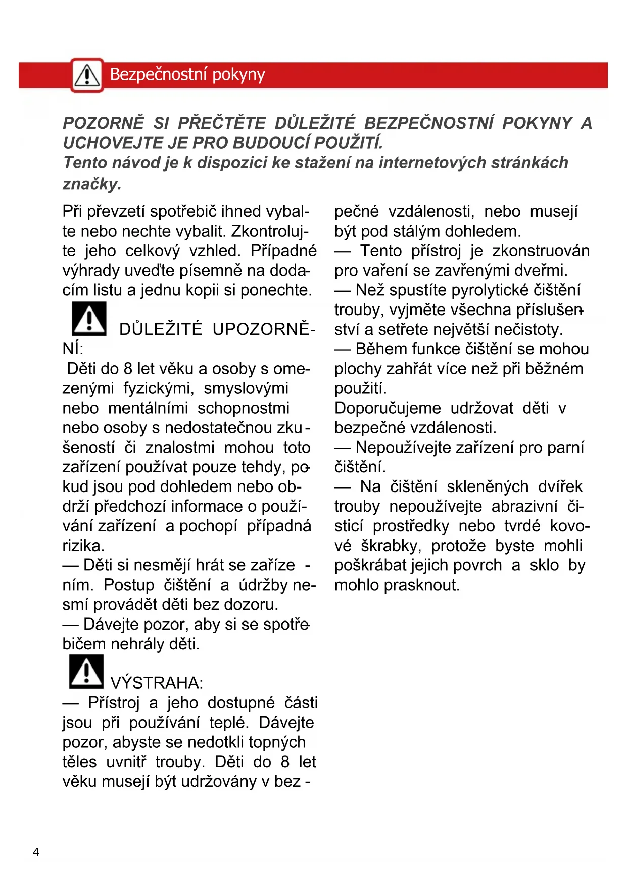 pečné vzdálenosti, nebo musejí být pod stálým dohledem. — Tento přístroj je zkonstruován pro vaření se zavřenými dveřmi. — Než spustíte pyrolytické čištění trouby, vyjměte všechna příslušen