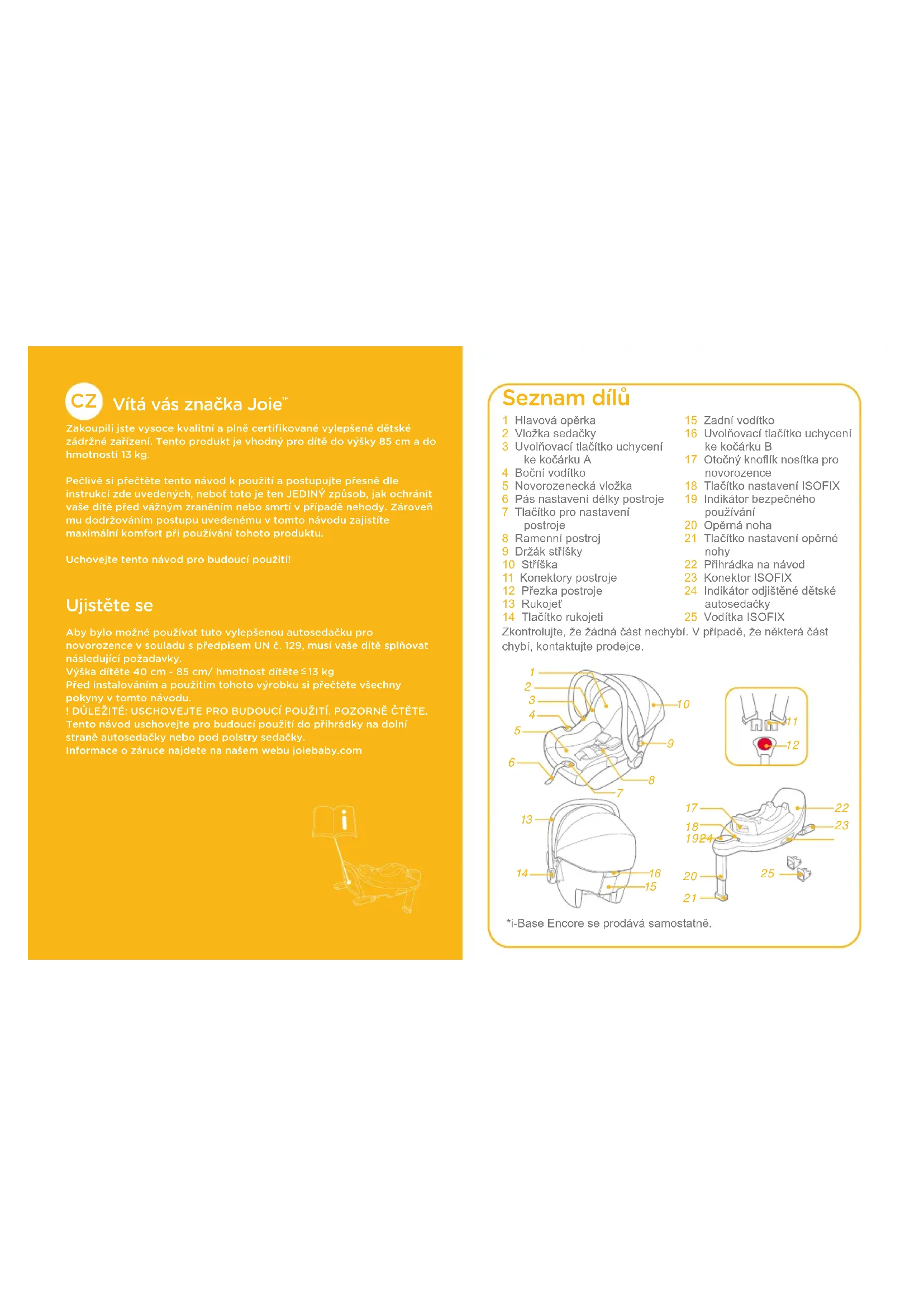 Zakoupili jste vysoce kvalitní a plně certifikované vylepšené dětské zádržné zařízení. Tento produkt je vhodný pro dítě do výšky 85 cm a do hmotnosti 13 kg.Pečlivě si přečtěte tento návod k použití a postupujte přesně dle instrukcí zde uvedených﹐ neboť toto je ten JEDINÝ způsob﹐ jak ochránit vaše dítě před vážným zraněním nebo smrtí v případě nehody. Zároveň mu dodržováním postupu uvedenému v tomto návodu zajistíte maximální komfort při používání tohoto produktu.Uchovejte tento návod pro budoucí použití! Ujistěte se Aby bylo možné používat tuto vylepšenou autosedačku pro novorozence v souladu s předpisem UN č. 129﹐ musí vaše dítě splňovat následující požadavky.Výška dítěte 40 cm - 85 cm/ hmotnost dítěte 13 kgPřed instalováním a použitím tohoto výrobku si přečtěte všechny pokyny v tomto návodu.! DŮLEŽITÉ: USCHOVEJTE PRO BUDOUCÍ POUŽITÍ. POZORNĚ ČTĚTE.Tento návod uschovejte pro budoucí použití do přihrádky na dolní straně autosedačky nebo pod polstry sedačky.Informace o záruce najdete na našem webu joiebaby.com *i-Base Encore se prodává samostatně.