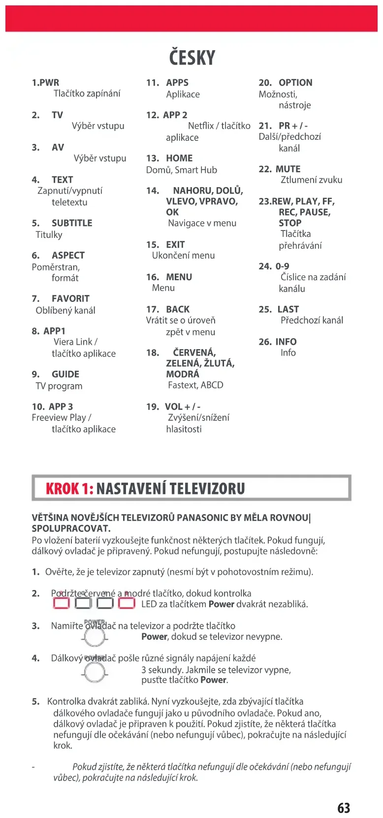 POLSKI 712188_Panasonic_manual URC4914_RDN1091120.indd 62712188_Panasonic_manual URC4914_RDN1091120.indd 62 09-11-2020 13:1509-11-2020 13:1563 ČESKY VĚTŠINA NOVĚJŠÍCH TELEVIZORŮ PANASONIC BY MĚLA ROVNOU| SPOLUPRACOVAT. Po vložení baterií vyzkoušejte funkčnost některých tlačítek. Pokud fungují, dálkový ovladač je připravený. Pokud nefungují, postupujte následovně: