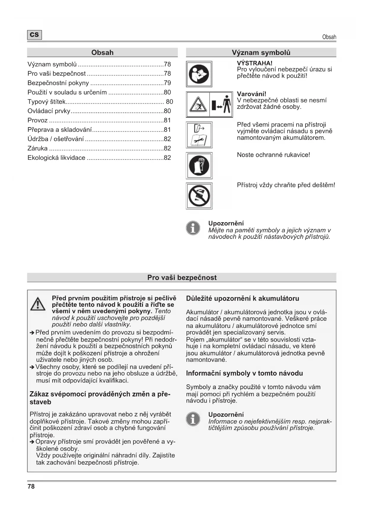 - Ekologická likvidace Provašibezpečnost Významsymbolů VÝSTRAHA! Pro vyloučení nebezpečí úrazu si přečtěte návod k použití! Varování! V nebezpečné oblasti se nesmí zdržovat žádné osoby. Před všemi pracemi na přístroji vyjměte ovládací násadu s pevně namontovaným akumulátorem. Noste ochranné rukavice! Přístroj vždy chraňte před deštěm! Upozornění Mějte na paměti symboly a jejich význam v návodech k použití nástavbových přístrojů.Pro vaši bezpečnost p. 82