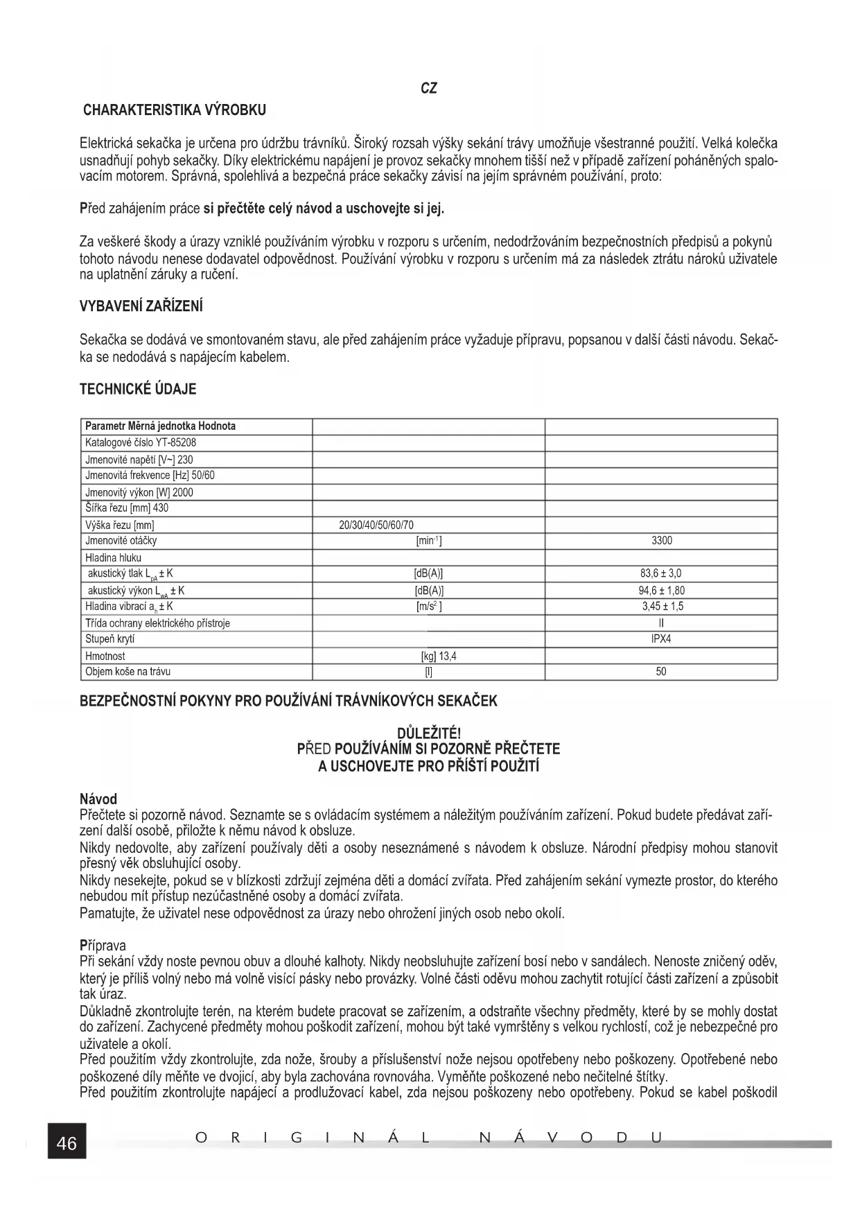 Výrobok je dodávaný v kompletnom stave, ale pred začatím práce si vyžaduje prípravné činnosti, ktoré sú opísané v ďalšej časti návodu. Kosačka nie je dodávaná s napájacím káblom. TECHNICKÉ ÚDAJE Parameter Merná jednotka Hodnota Katalógové číslo YT-85208 Menovité napätie [V~] 230 Menovitá frekvencia [Hz] 50/60 Menovitý výkon [W] 2000 Šírka záberu [mm] 430 Výška rezu [mm] 20/30/40/50/60/70 Voľnobežné otáčky [min
