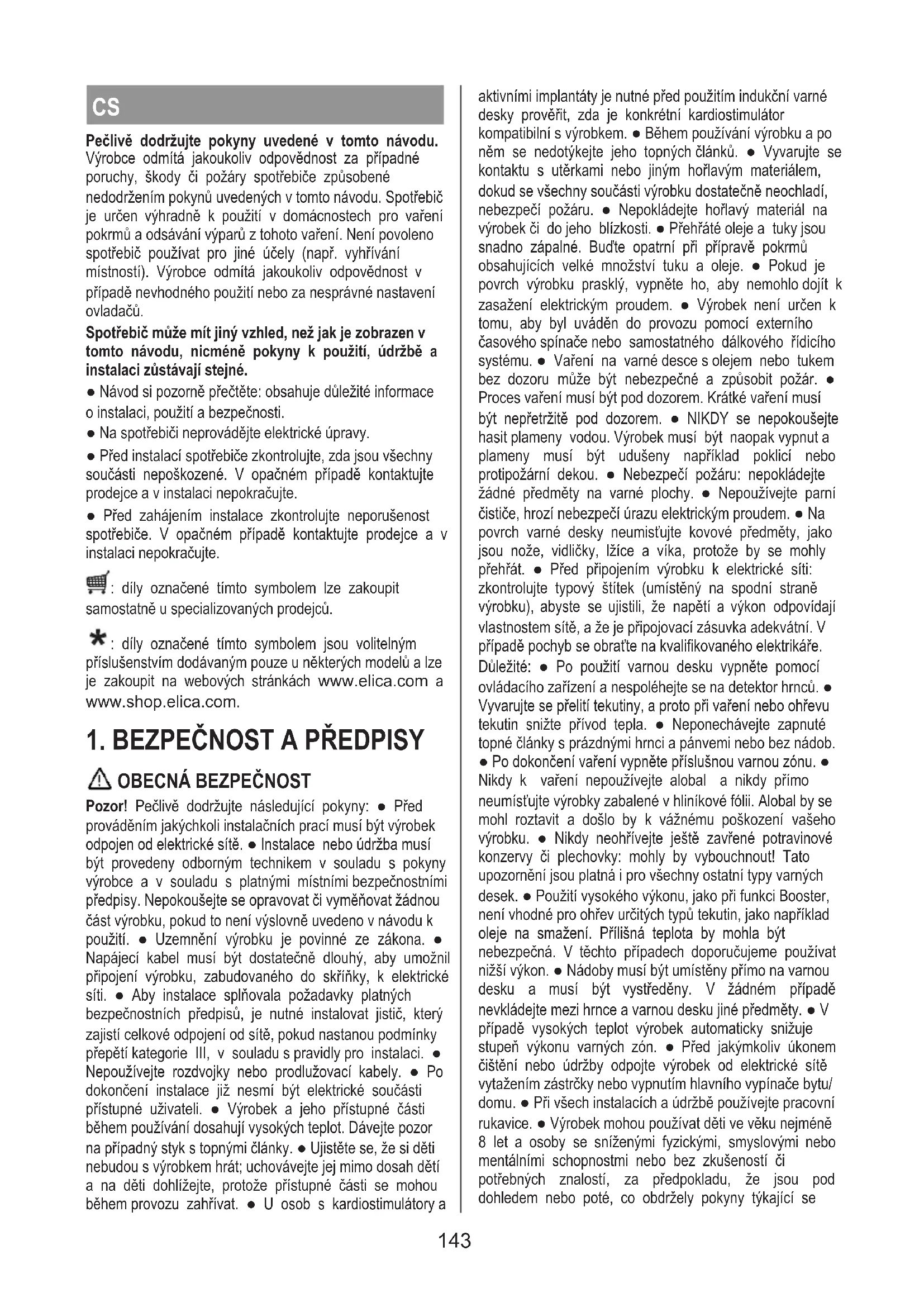 Jeśli po wykonaniu powyższych kontroli problem wciąż trwa, należy skontaktować się z najbliższym Serwisem Ob- sługi. 142CS Pečlivě dodržujte pokyny uvedené v tomto návodu. Výrobce odmítá jakoukoliv odpovědnost za případné poruchy, škody či požáry spotřebiče způsobené nedodržením pokynů uvedených v tomto návodu. Spotřebič je určen výhradně k použití v domácnostech pro vaření pokrmů a odsávání výparů z tohoto vaření. Není povoleno spotřebič používat pro jiné účely (např. vyhřívání místností). Výrobce odmítá jakoukoliv odpovědnost v případě nevhodného použití nebo za nesprávné nastavení ovladačů. Spotřebič může mít jiný vzhled, než jak je zobrazen v tomto návodu, nicméně pokyny k použití, údržbě a instalaci zůstávají stejné. ● Návod si pozorně přečtěte: obsahuje důležité informace o instalaci, použití a bezpečnosti. ● Na spotřebiči neprovádějte elektrické úpravy. ● Před instalací spotřebiče zkontrolujte, zda jsou všechny součásti nepoškozené. V opačném případě kontaktujte prodejce a v instalaci nepokračujte. ● Před zahájením instalace zkontrolujte neporušenost spotřebiče. V opačném případě kontaktujte prodejce a v instalaci nepokračujte. : díly označené tímto symbolem lze zakoupit samostatně u specializovaných prodejců. : díly označené tímto symbolem jsou volitelným příslušenstvím dodávaným pouze u některých modelů a lze je zakoupit na webových stránkách www.elica.com a www.shop.elica.com.