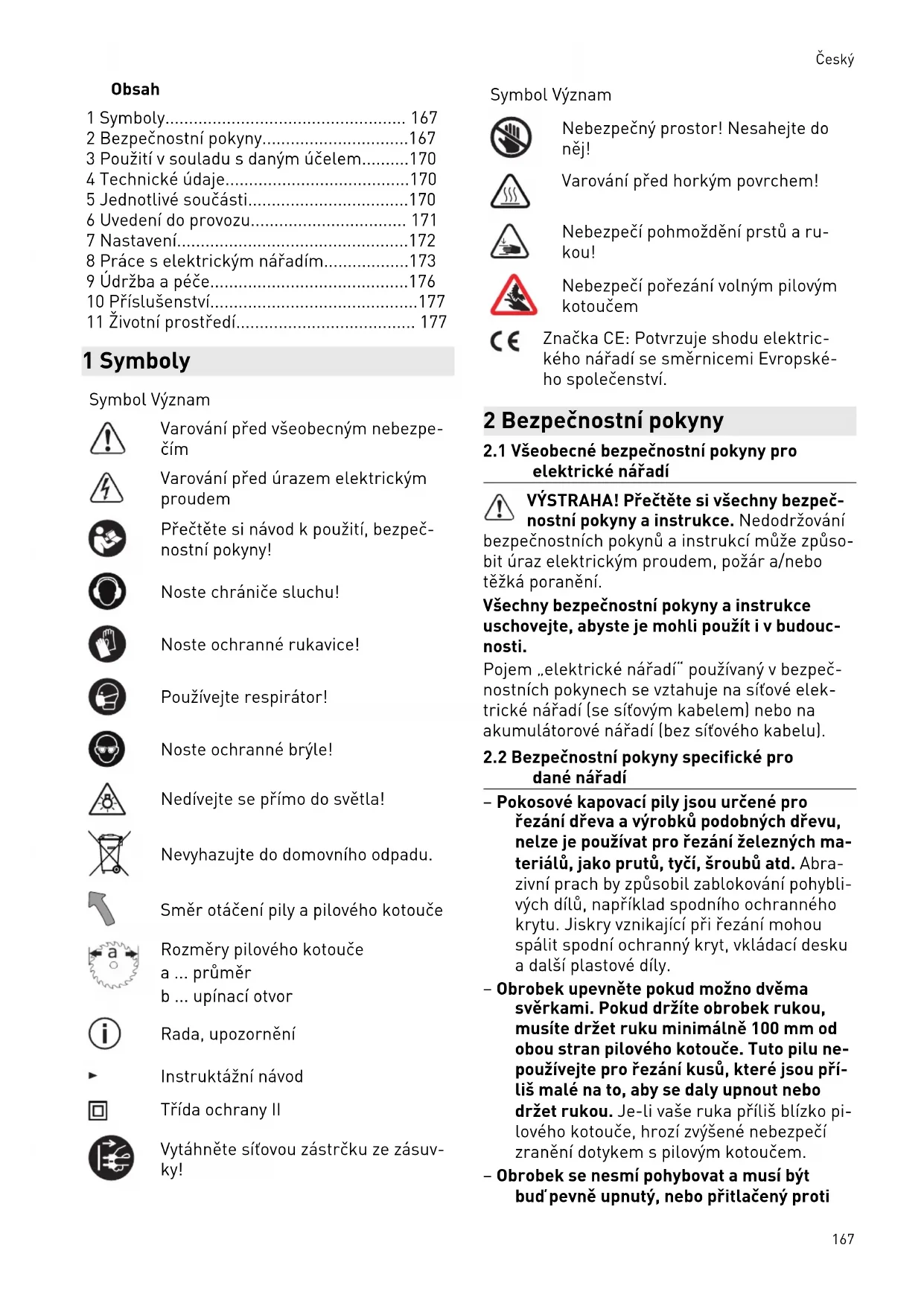 [9-1]. ► Otáčejte pilový kotouč pomocí šestihranné ho klíče [9-7], dokud aretace vřetena neza skočí. ► Povolte šroub [9-6] šestihranným klíčem (levý závit, otáčejte ve směru šipky!). ► Sejměte šroub a přírubu [9-8]. ► Uvolněte aretaci vřetena. ► Stiskněte a držte bezpečnostní tlačítko [9-3]. ► Kyvný ochranný kryt [9-4] vytáhněte rukou nahoru a držte ho. ► Vyjměte pilový kotouč [9-5]. Montáž pilového kotouče Pilový kotouč a příruba musí být zbavené pra chu a nečistot, aby byl zaručený hladký chod pi lového kotouče. Pilový kotouč a příruba musí být zbavené prachu a nečistot, aby byl zaručený hladký chod pilového kotouče. ► Nasaďte nový pilový kotouč [9-5]. Popis pilového kotouče musí být viditel ný. Směr otáčení pilového kotouče se musí shodovat se směrem šipky [9-9]! ► Přírubu [9-8] nasaďte tak, aby do sebe za padl lícovací tvar příruby, upínacího závitu a pilového kotouče. ► Stiskněte a držte stisknutou aretaci vřete na [9-1]. ► Otáčejte pilový kotouč pomocí šestihranné ho klíče [9-7], dokud aretace vřetena neza skočí. ► Nasaďte šroub [9-6] a utáhněte ho proti směru šipky. Nebezpečí poranění!Po každé výměně pilového kotouče zkontrolujte, zda je pi lový kotouč bezpečně upevněný. Volný šroub může způsobit uvolnění pilového kotouče. 8 Práce s elektrickým nářadím VAROVÁNÍ Odlétávající části nástroje / části obrobku Nebezpečí poranění ► Noste ochranné brýle! ► Při používání nářadí se musí ostatní osoby zdržovat v dostatečné vzdálenosti. ► Obrobky vždy pevně upněte. ► Šroubové svěrky musí vždy úplně doléhat. VAROVÁNÍ Kyvný ochranný kryt se nezavírá Nebezpečí poranění ► Přerušte řezání. ► Odpojte síťový kabel, odstraňte zbytky po řezání. V případě poškození nechte kyvný ochranný kryt vyměnit. Český 173Pro bezpečnou práci Při práci dodržujte všechny bezpečnostní pokyny uvedené za začátku a následující pravidla: – Správná pracovní poloha: – vpředu na straně obsluhy; – čelem k pile; – vedle roviny pilového kotouče. – Elektrické nářadí při práci držte vždy ovlá dající rukou za rukojeť [1-1]. Volnou ruku držte vždy mimo nebezpečnou oblast. – Elektrické nářadí veďte proti obrobku, jen pokud je zapnuté. – Přizpůsobte rychlost posuvu, abyste zabrá nili přetížení nářadí a dále tavení plastu při řezání plastů. – Zjistěte, aby byly hvězdicové kolečko [2-9] a otočný knoflík [2-6] utažené. – V případě vadné elektroniky s elektrickým nářadím nepracujte, protože to může vést k nadměrným otáčkám. Vadnou elektroniku poznáte podle toho, že neprobíhá měkký rozběh, není možná regulace otáček a z ná řadí vychází kouř nebo zápach spáleniny.