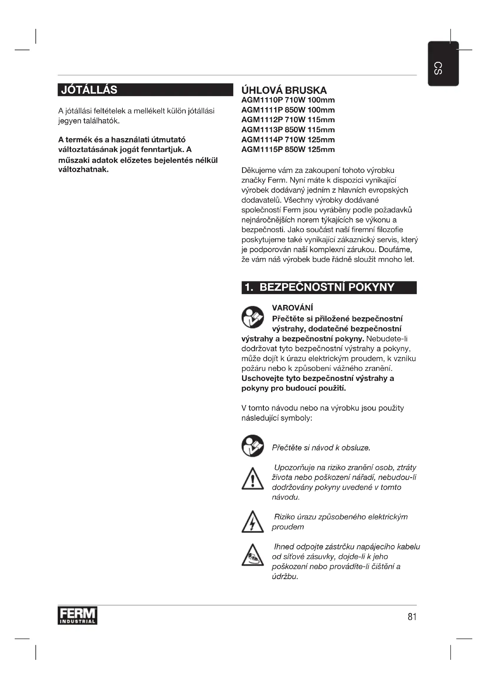 A jótállási feltételek a mellékelt külön jótállási jegyen találhatók. A termék és a használati útmutató változtatásának jogát fenntartjuk. A műszaki adatok előzetes bejelentés nélkül változhatnak. ÚHLOVÁ BRUSKA AGM1110P 710W 100mm AGM1111P 850W 100mm AGM1112P 710W 115mm AGM1113P 850W 115mm AGM1114P 710W 125mm AGM1115P 850W 125mm Děkujeme vám za zakoupení tohoto výrobku značky Ferm. Nyní máte k dispozici vynikající výrobek dodávaný jedním z hlavních evropských dodavatelů. Všechny výrobky dodávané společností Ferm jsou vyráběny podle požadavků nejnáročnějších norem týkajících se výkonu a bezpečnosti. Jako součást naší firemní filozofie poskytujeme také vynikající zákaznický servis, který je podporován naší komplexní zárukou. Doufáme, že vám náš výrobek bude řádně sloužit mnoho let.