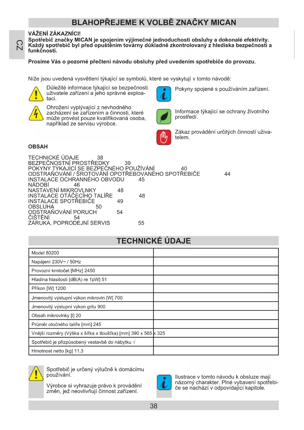 - Directive RoHS 2011/65/EC and has thus been marked with the symbol and been issued with a declaration of compliance made available to market regulators.38 Spotřebič značky MICAN je spojením výjimečné jednoduchosti obsluhy a dokonalé efektivity. Každý spotřebič byl před opuštěním továrny důkladně zkontrolovaný z hlediska bezpečnosti a funkčnosti. Prosíme Vás o pozorné přečtení návodu obsluhy před uvedením spotřebiče do provozu. VÁŽENÍ ZÁKAZNÍCI! BLAHOPŘEJEME K VOLBĚ ZNAČKY MICAN Níže jsou uvedená vysvětlení týkající se symbolů, které se vyskytují v tomto návodě: Zákaz provádění určitých činností uživa- telem. Ohrožení vyplývající z nevhodného zacházení se zařízením a činnosti, které může provést pouze kvalikovaná osoba, například ze servisu výrobce. Spotřebič je určený výlučně k domácímu používání. Výrobce si vyhrazuje právo k provádění změn, jež neovlivňují činnost zařízení. Důležité informace týkající se bezpečnosti uživatele zařízení a jeho správné exploa- taci. Pokyny spojené s používáním zařízení.
