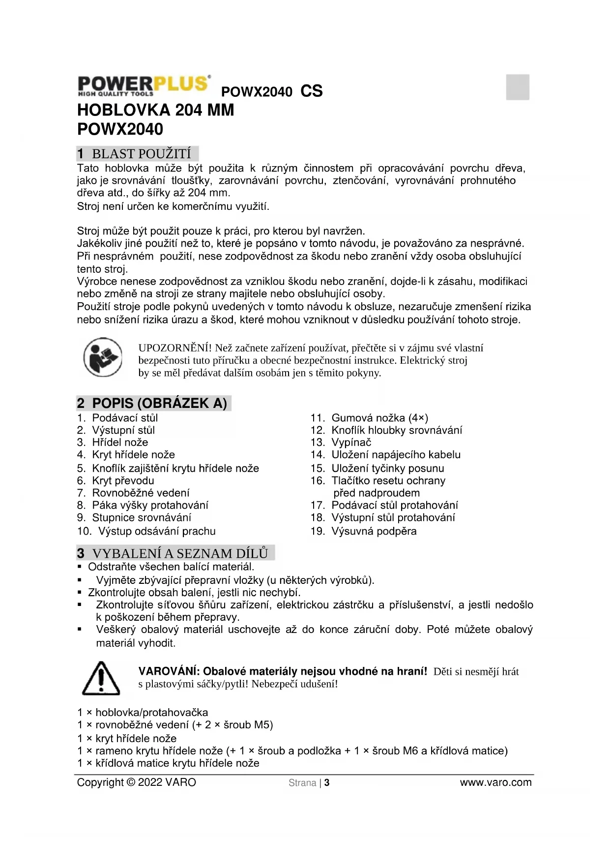 9.2.1 Nastavení úhlu rovnoběžného vedení (7) .................................................................. 9POWX2040 CS Copyright © 2022 VARO Strana | 2 www.varo.com 9.2.2 Nastavení hloubky řezu ............................................................................................. 9