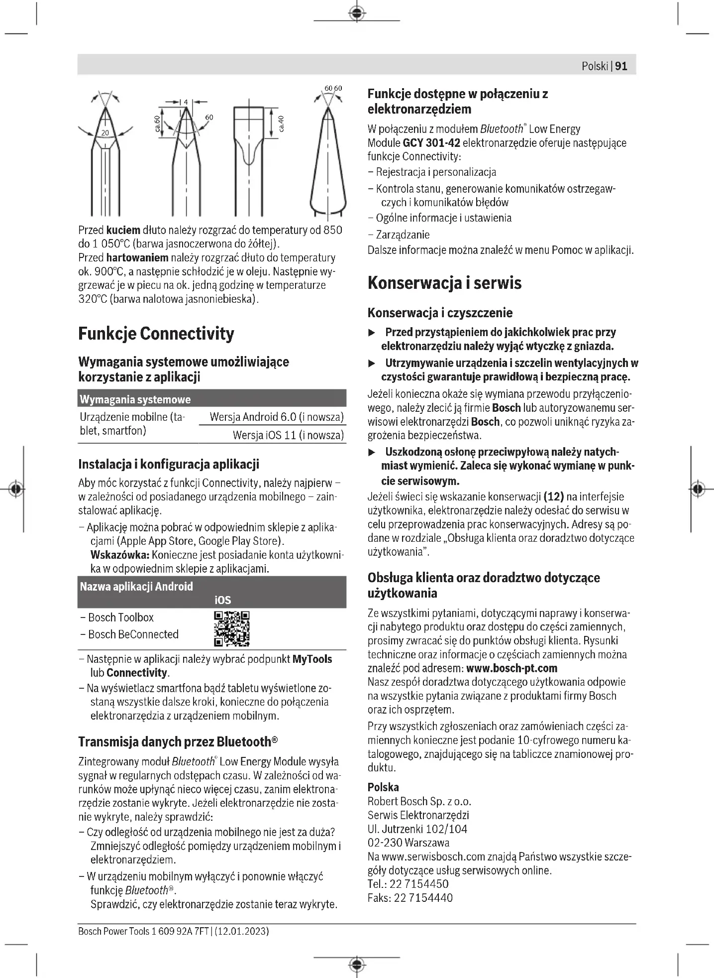 Při kování zahřejte sekáč na 850 až 1 050°C (světle červená až žlutá barva). Při kalení zahřejte sekáč přibližně na 900°C aochlaďte ho voleji. Poté ho popouštějte vpeci cca hodinu při 320°C (popouštěcí barva světle modrá). Funkce konektivity Systémové předpoklady pro používání aplikace Systémové předpoklady Mobilní koncové zařízení (tablet, chytrý telefon) Android6.0 (avyšší) iOS11 (avyšší) Instalace anastavení aplikace Pro používání funkcí konektivity musíte nejprve instalovat – podle příslušného koncového zařízení – specifickou aplikaci. – Aplikaci si stáhněte vpříslušném obchodě saplikacemi (Apple App Store, Google Play Store). Upozornění: Předpokladem je uživatelský účet vpříslušném obchodě saplikacemi. Název aplikace Android iOS – Bosch Toolbox – Bosch BeConnected – Poté zvolte vaplikaci položku nabídky MyTools nebo Connectivity. – Na displeji vašeho mobilního koncového zařízení se budou zobrazovat všechny další kroky pro spojení elektrického nářadí skoncovým zařízením. Přenos dat přes Bluetooth® Integrovaný Bluetooth